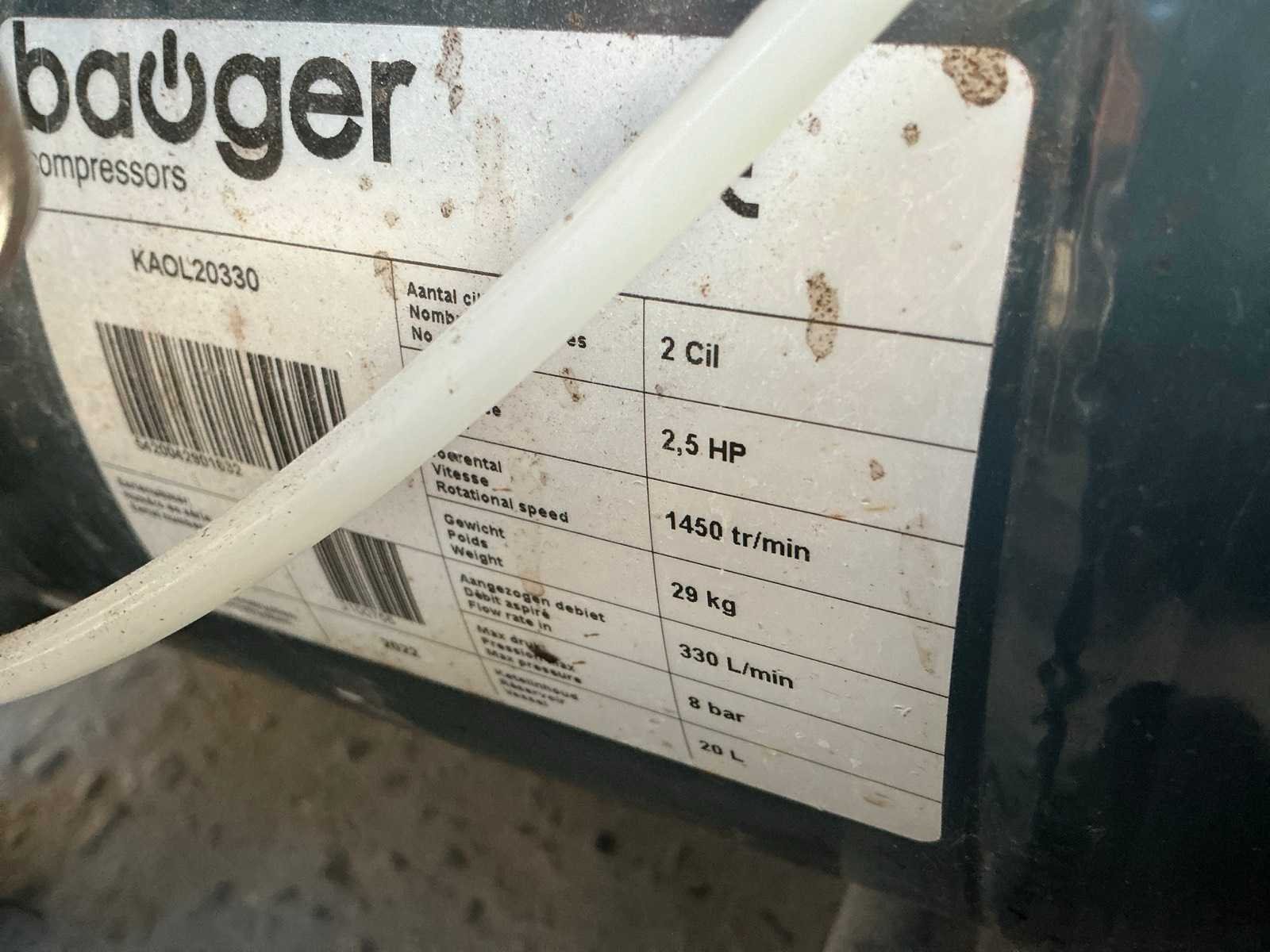 Merk: Bauger Type: KA-C-0303 Mobiel: true Capaciteit.: 8bar Luchtstroom: 330l/min Buffertank inhoud: 20l Aansluiting: 230V Eigen gewicht: 29kg