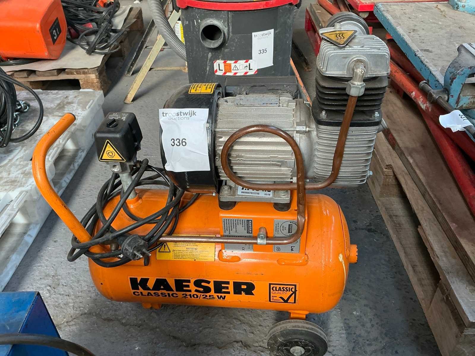 Merk: Kaeser Type: Classic 210/25W Bouwjaar: 2019 Mobiel: true Capaciteit.: 10bar Luchtstroom: 210l/min Vermogen: 1.5kW Aansluiting: 230V