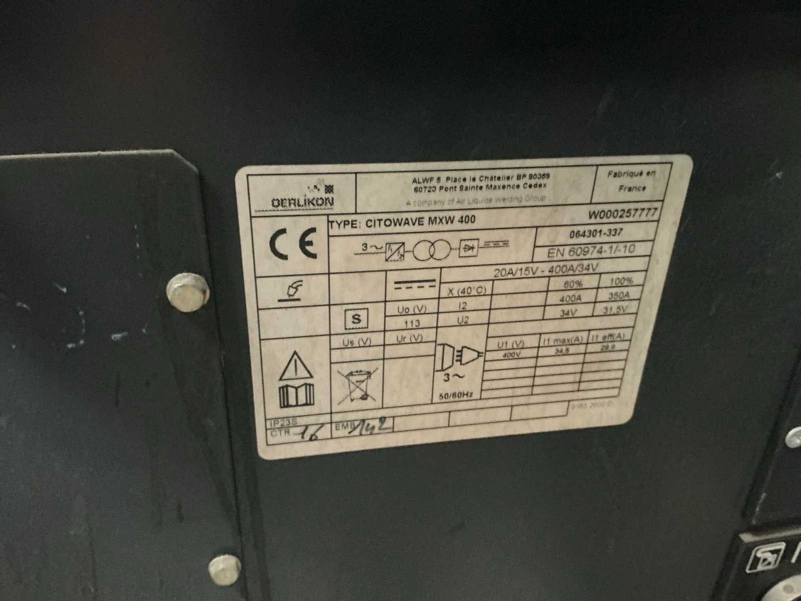 Merk: Oerlikon Type: Citowave MXW 400 Max. lasvermogen: 400A Aansluiting: 400V Digitale uitlezing: true Draadaanvoerunit: true Afmeting l: 1100mm Afmeting b: 570mm Afmeting h: 1450mm