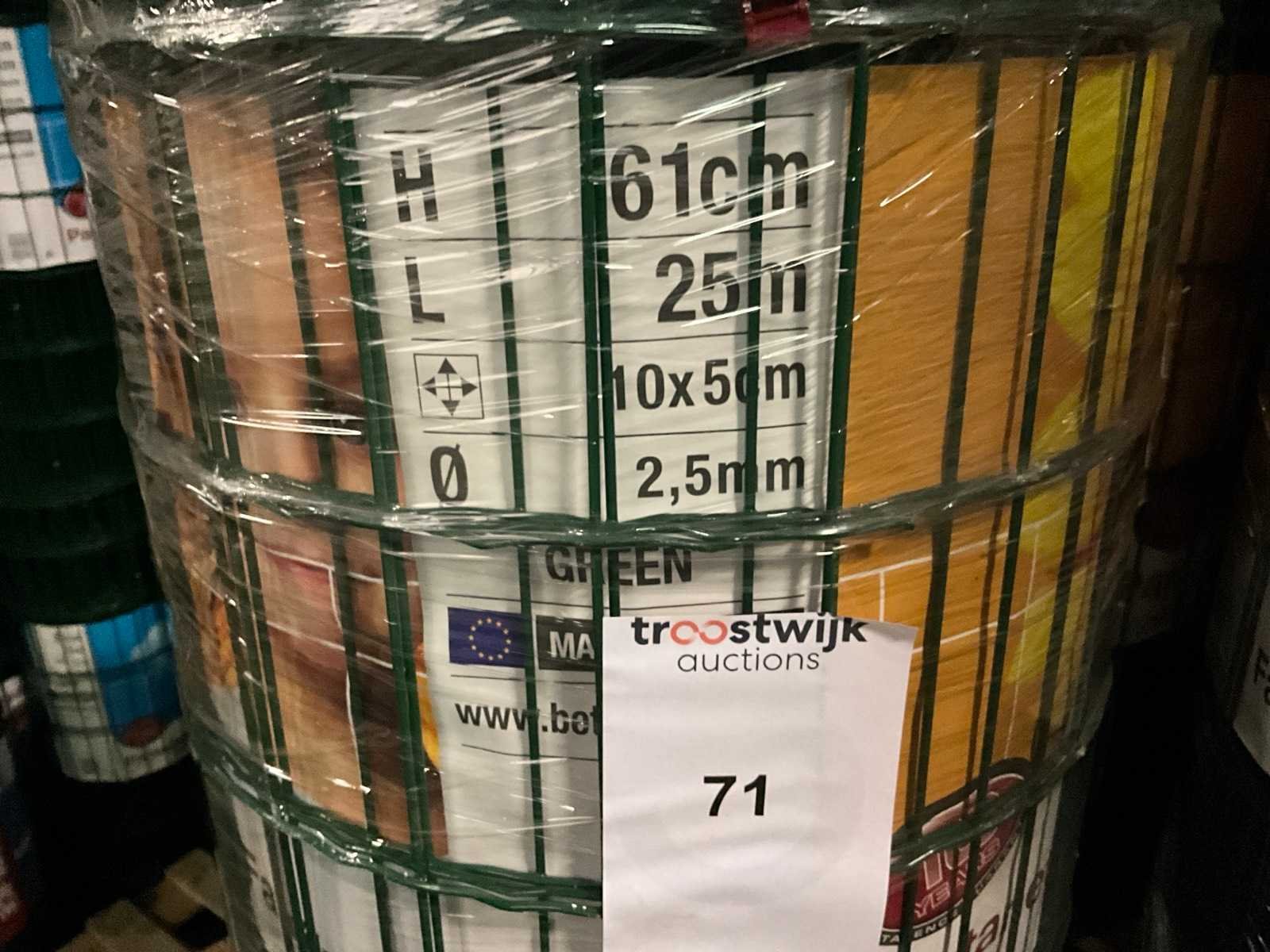 Ongebruikt, in originele verpakking, gestapeld op 2 pallets Merk: Betafence Product type: Pantanet Family Kleur: Groen Lengte: 2500cm Hoogte: 61cm