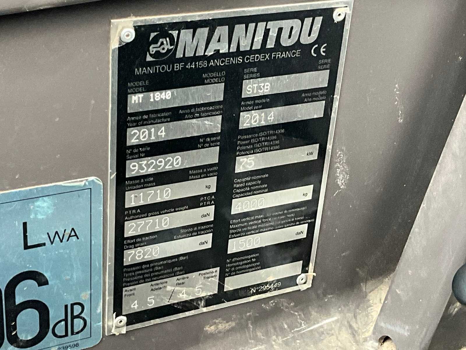 • hydraulische stempels vooraan • 3-traps mast • sleutel aanwezig • gebruikssporen Merk: Manitou Type: MT1840 Bouwjaar: 2014 Serienummer: 932920 Motorvermogen (kW): 75kW Cabine: true Vierwielaandrijving 4x4: true Lepellengte: 1200mm Luchtbanden: true Afgelezen urenstand: 2327 Totale afmeting Breedte: 2550mm