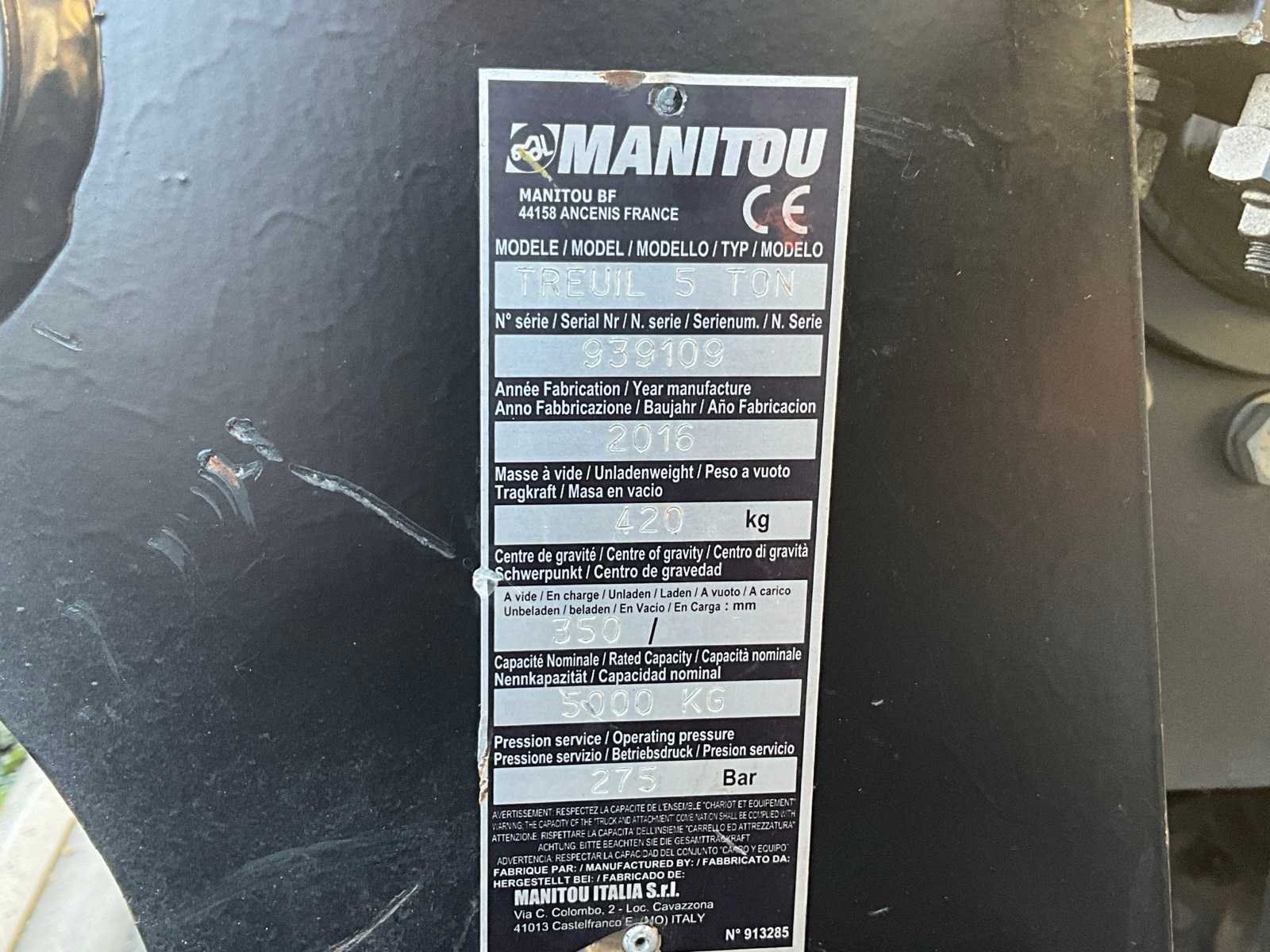• capaciteit: 5000Kg • bedrijfsdruk: 275bar • inclusief bok • gebruikssporen Merk: Manitou Type: Treuil 5T Bouwjaar: 2016 Serienummer: 939109 Eigen gewicht: 420kg