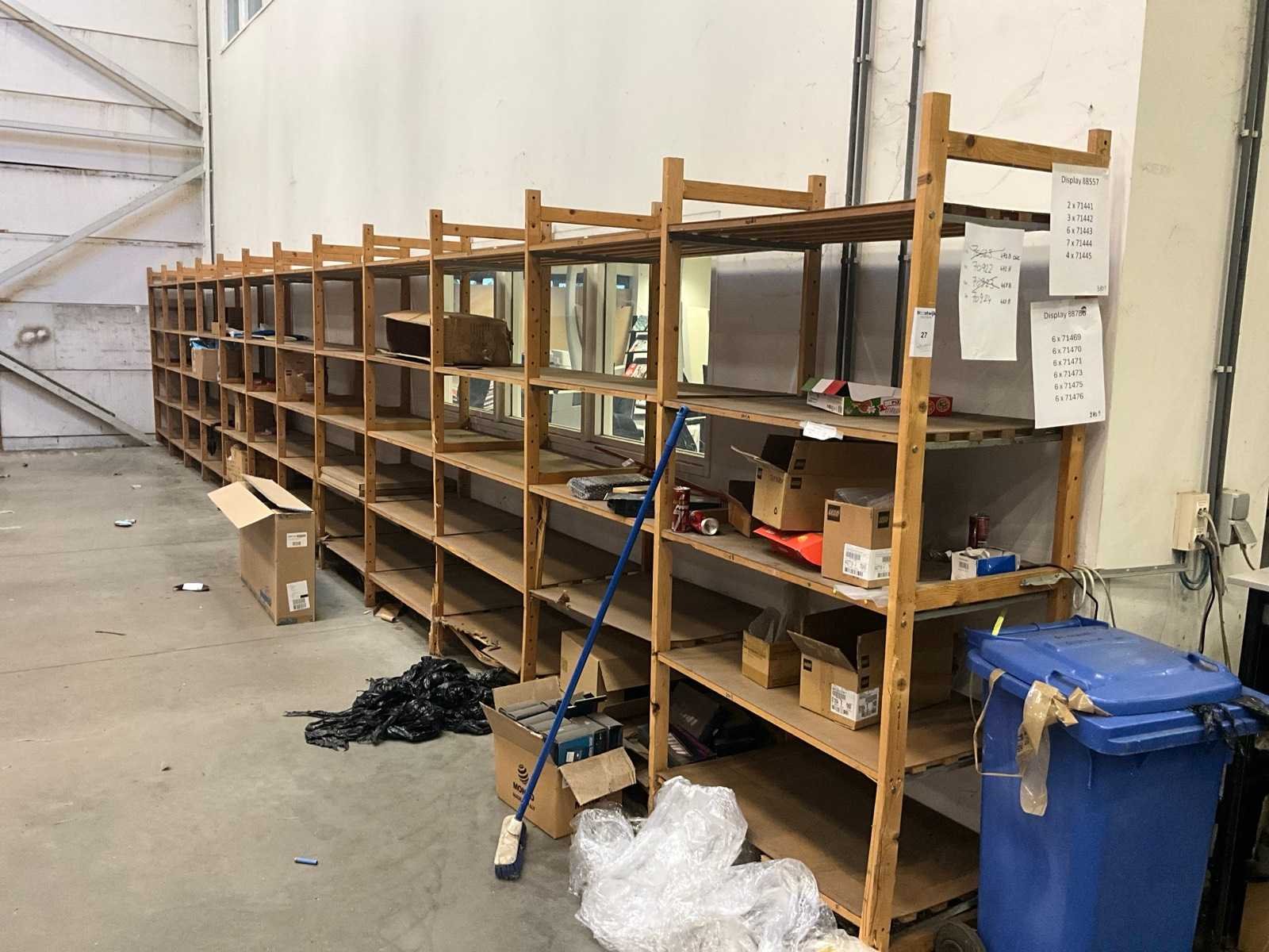 Bestaand uit 13 staanders en circa 60 legborden, lichte visuele beschadiging, met inhoud Totale afmeting L: 12000mm Totale afmeting Breedte: 600mm Totale afmeting Hoogte: 2100mm