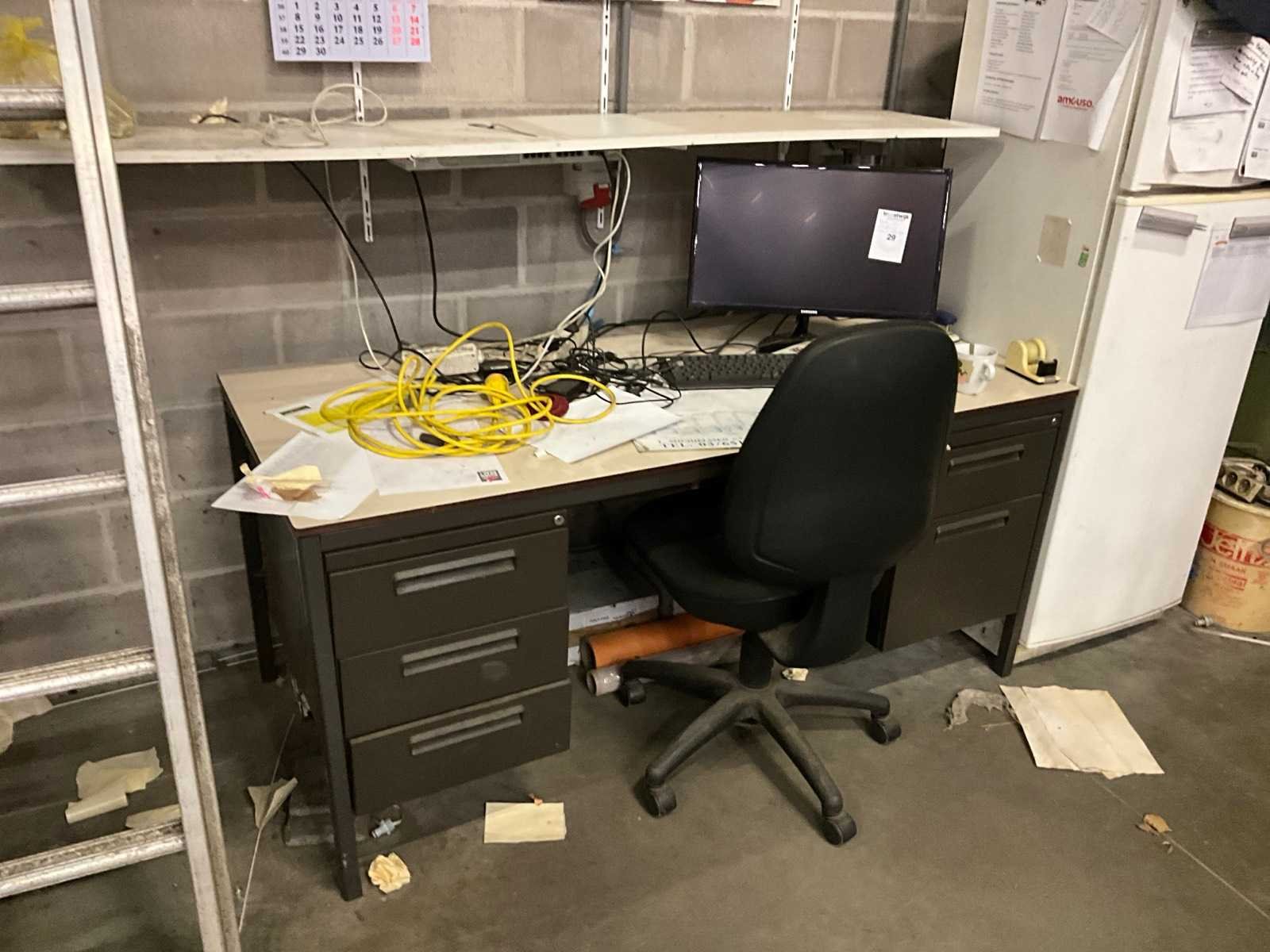Bestaand uit 2x bureel tafel, bureaustoel, koelkast met vriesvak Whirlpool hoogte 160 cm, 2x 2-deurs magazijnkast met diverse inhoud, PC scherm Samsung met klavier, enz..