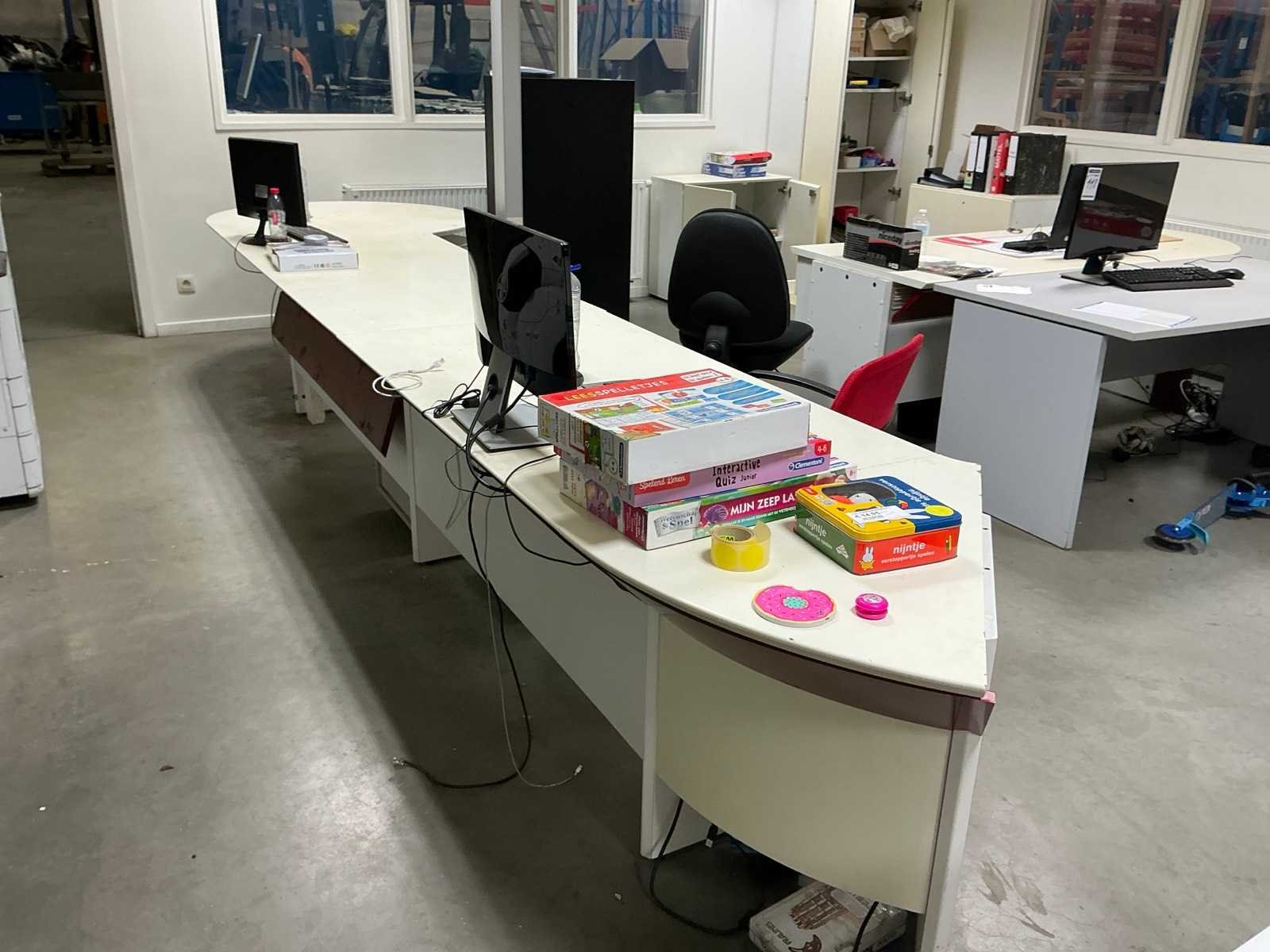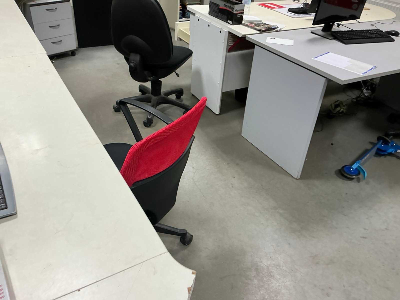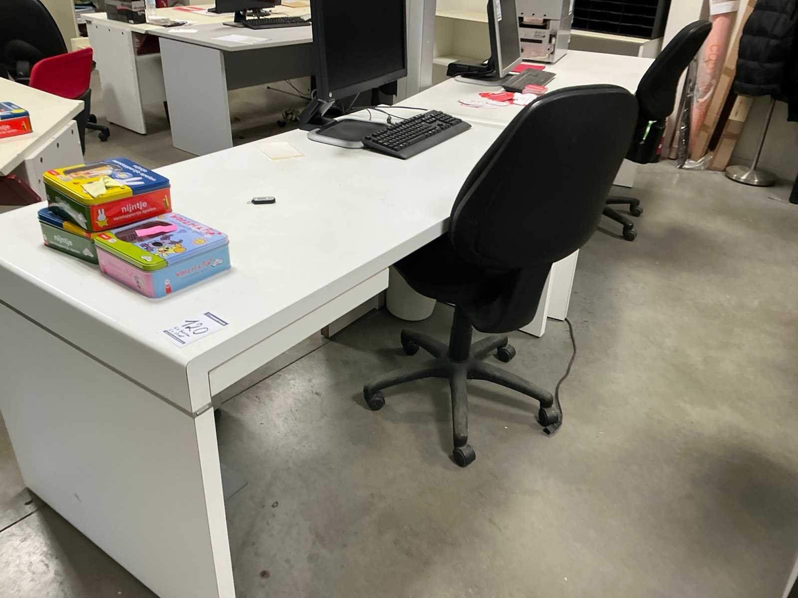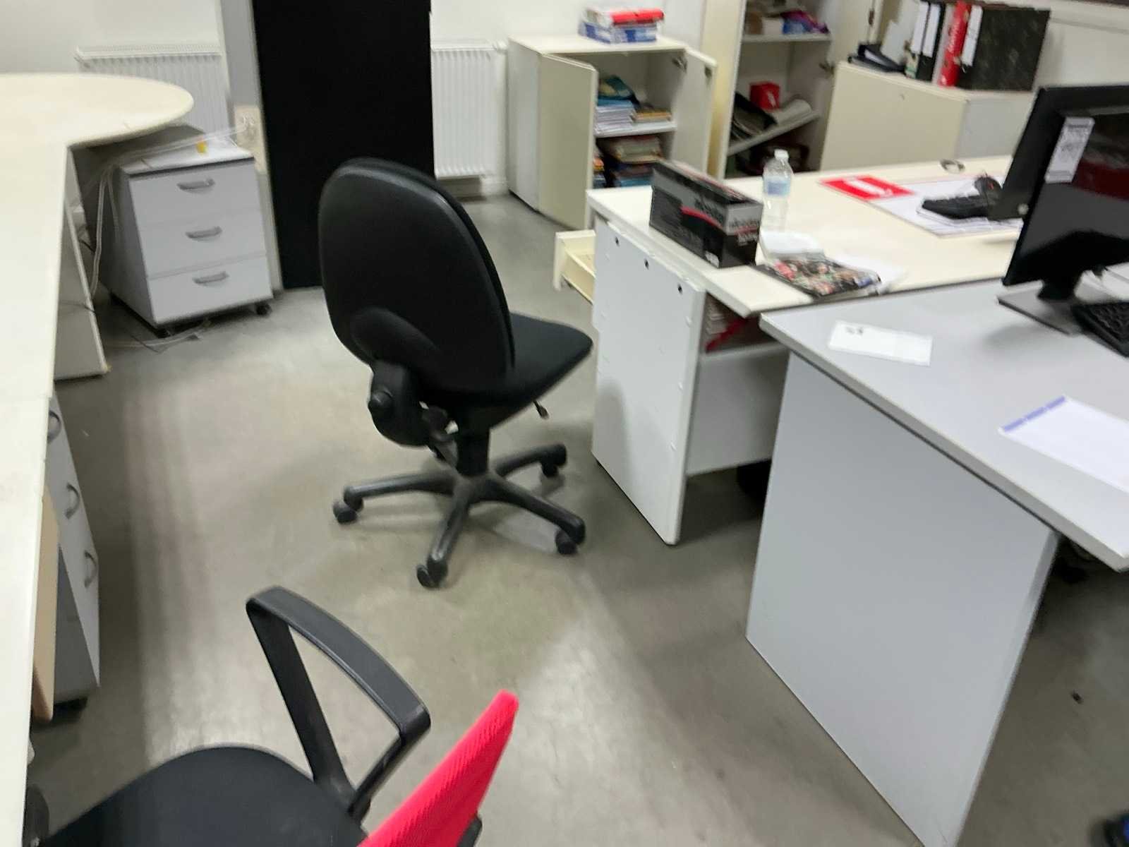 Diverse afmetingen/ inclusief: 5 mobiele stoelen/ inhoud bureaus, zijnde monitoren niet inbegrepen