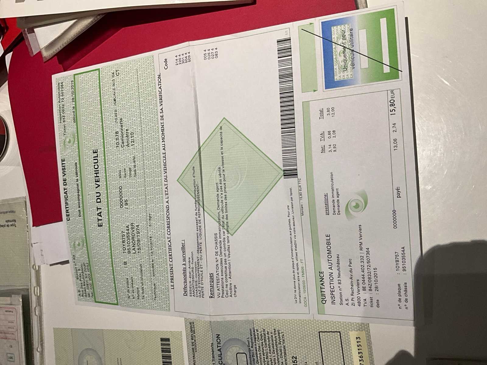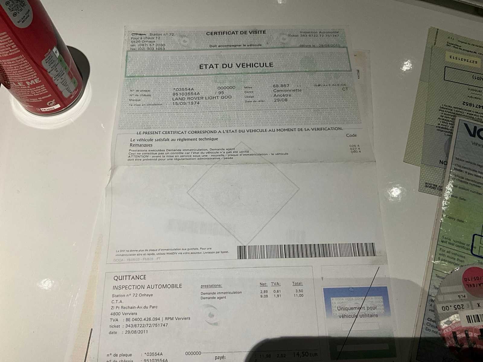 Aanwezige boorddocumenten: inschrijvingsbewijs deel I en II, keuringsbewijs, MOT certificaat Merk: Land Rover Type: Light Goo Chassisnummer: 9503554A Afgelezen mijlenstand: 72064mi Model: Jeep 4x4 Brandstof: diesel Datum eerste toelating: 15/09/1974 Transmissie: Manueel Aantal deuren: 3 Aantal zitplaatsen: 2 Aantal sleutels: 1 Kleur: Groen Cilinderinhoud: 2500 Inschrijvingsbewijs - deel 1 : Aanwezig Inschrijvingsbewijs - deel 2: Aanwezig