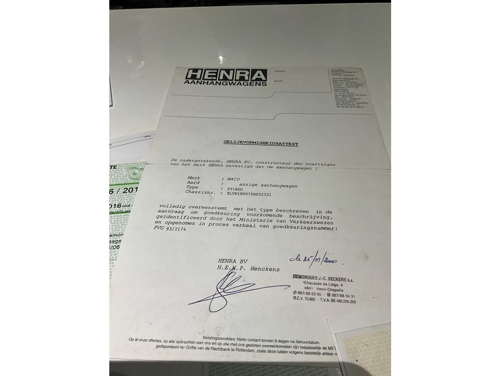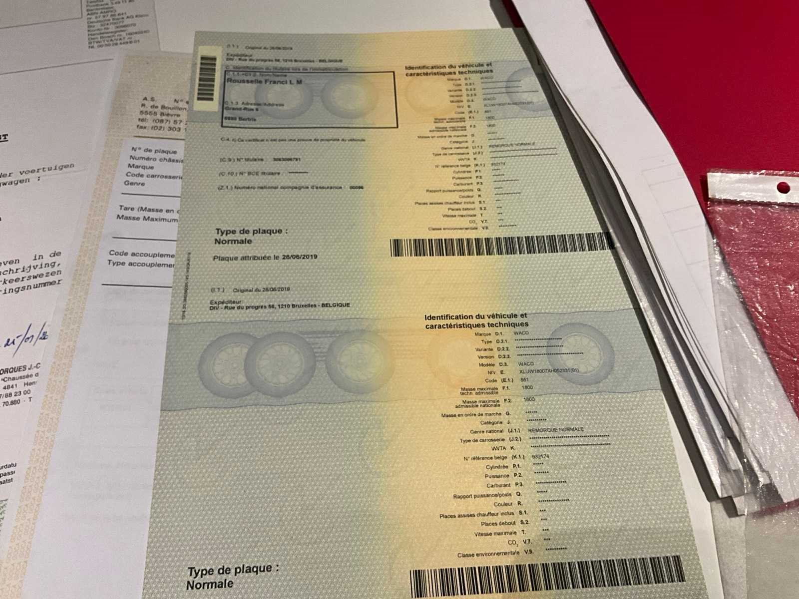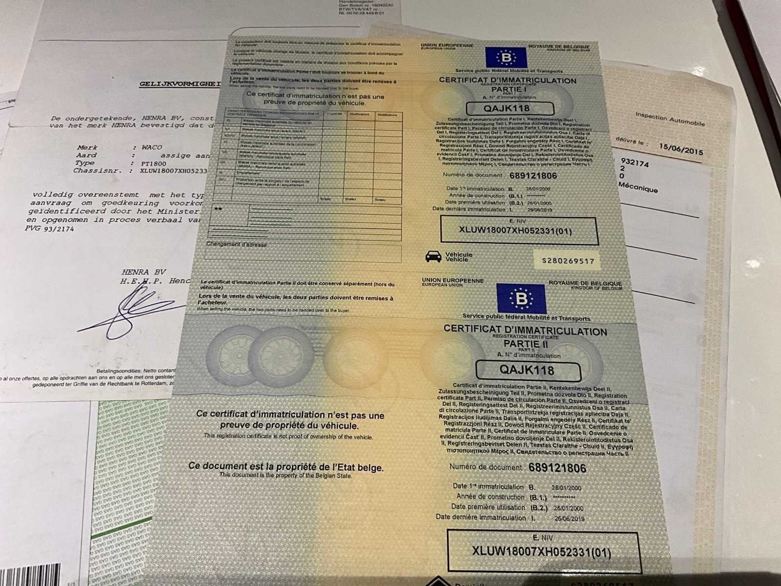 Aanwezige documenten: inschrijvingsbewijs deel I en II, gelijkvormigheidsattest, identificatieverslag, keuringsbewijs Merk: Waco Chassisnummer: XLUW18007XH052231 Lengte: 470cm Breedte: 200cm Hoogte: 260cm Bouwjaar: 2000
