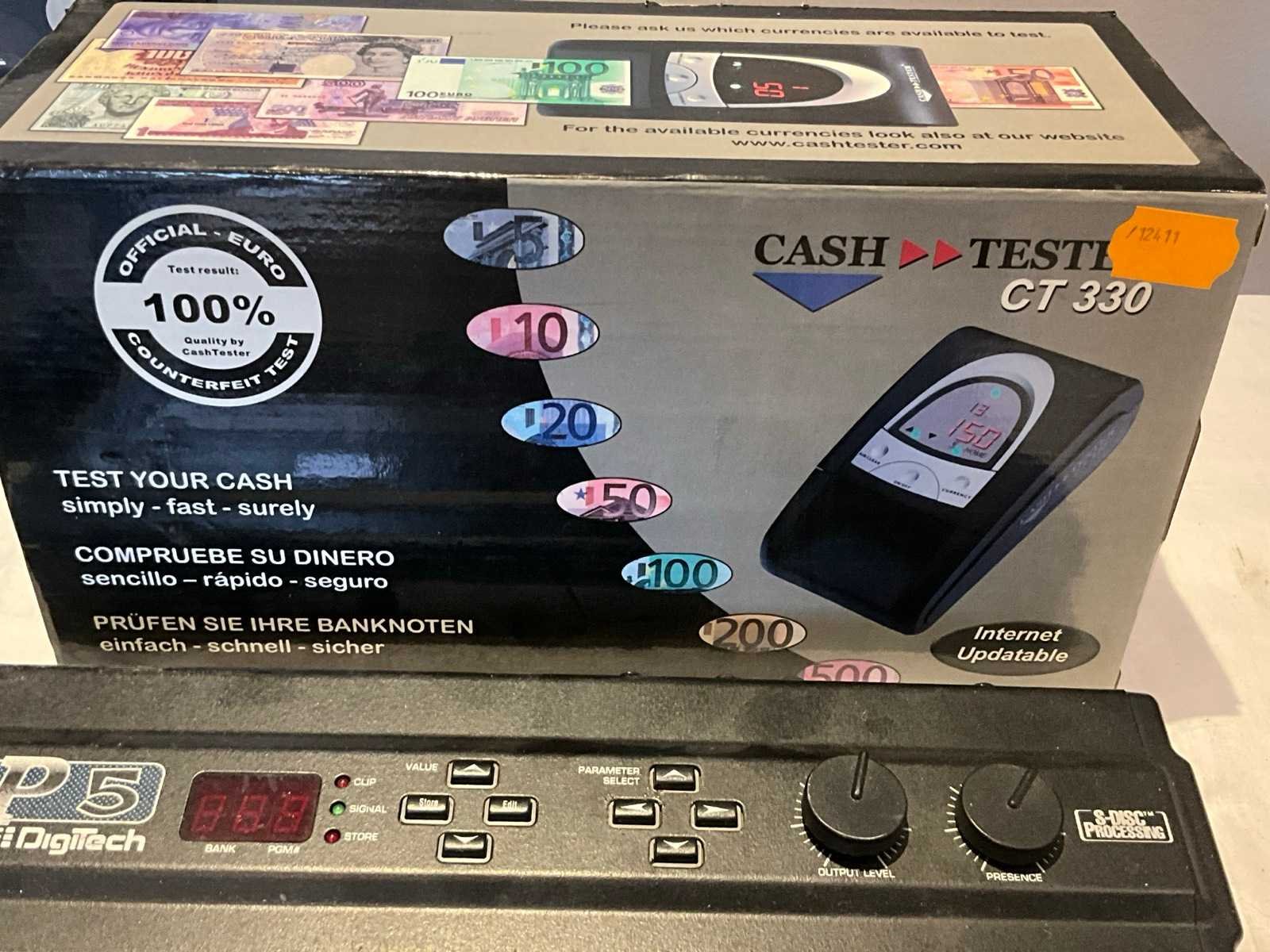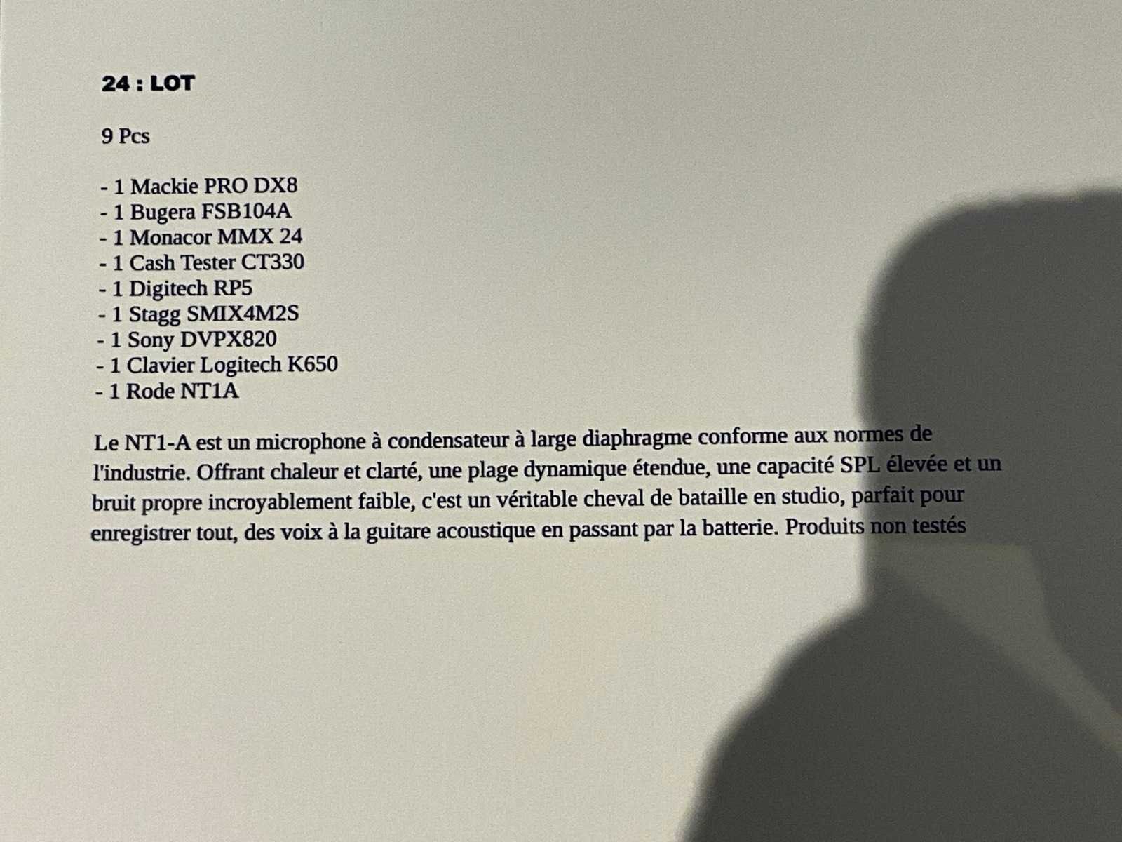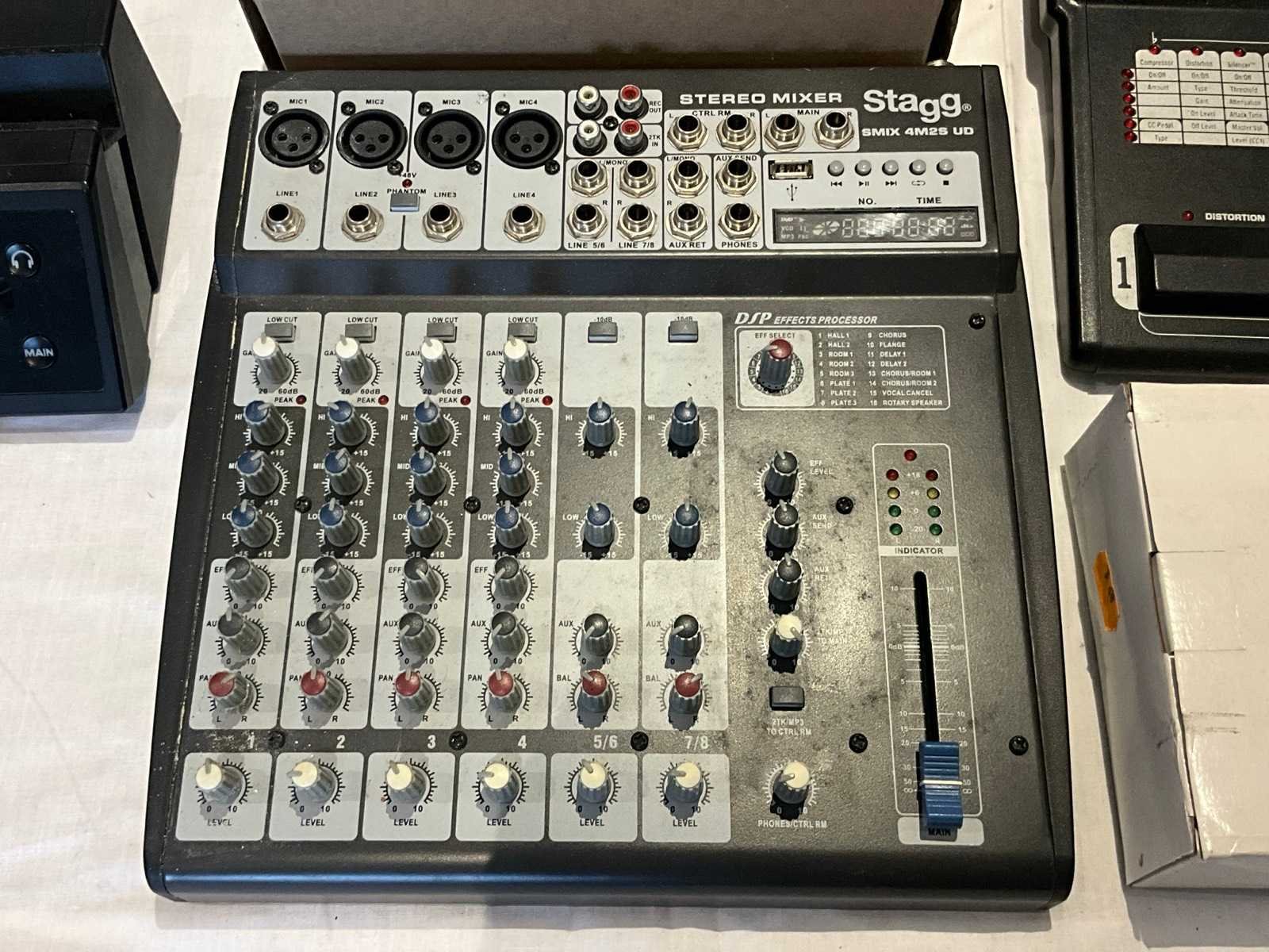 Waaronder bestaande uit: 1 analoge mengtafel STAGG SMIX 4M 25 UD, 1 gitaar effect DIGITECH RP5, 1 mix sconto MONACOR MMX-24, 1 microfoon RODE NT1 – A, 1 pedalen effect BUGERA FSB104A, 1 draagbare dvd-speler SONY, 1 iPad Dockstation mixer MACKIE PRODX8, Compleet met toetsenbord SIGNATURE K650 en biljettentester Model: Partij