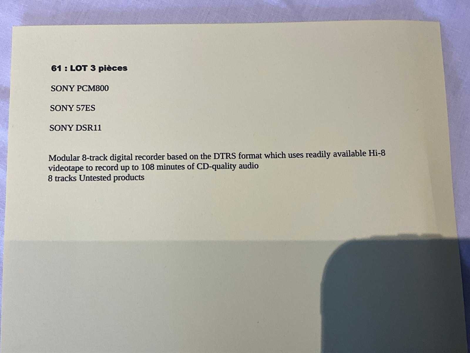 Waaronder: 1 DAT speler SONY, 1 digitale videocassetterecorder SONY DVCAM, 1 digitale audio recorder SONY PCM-800 Type: Partij
