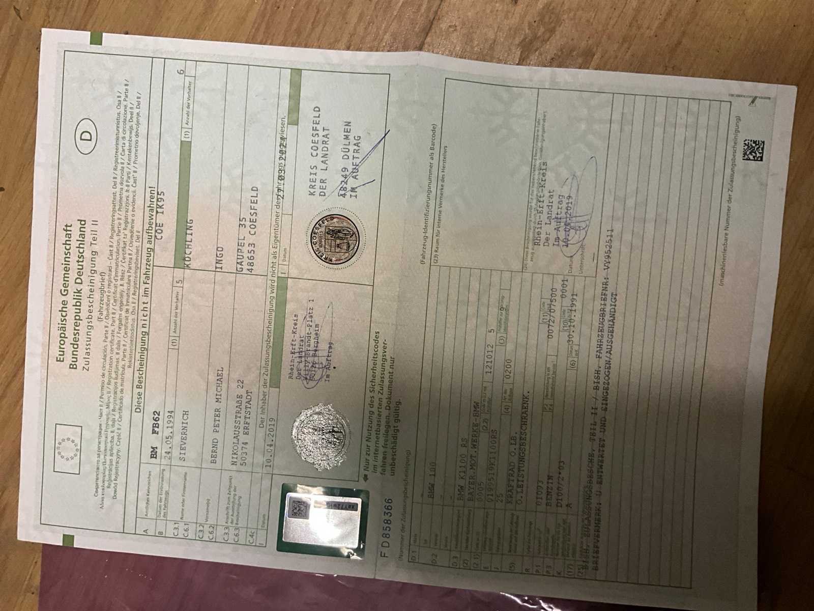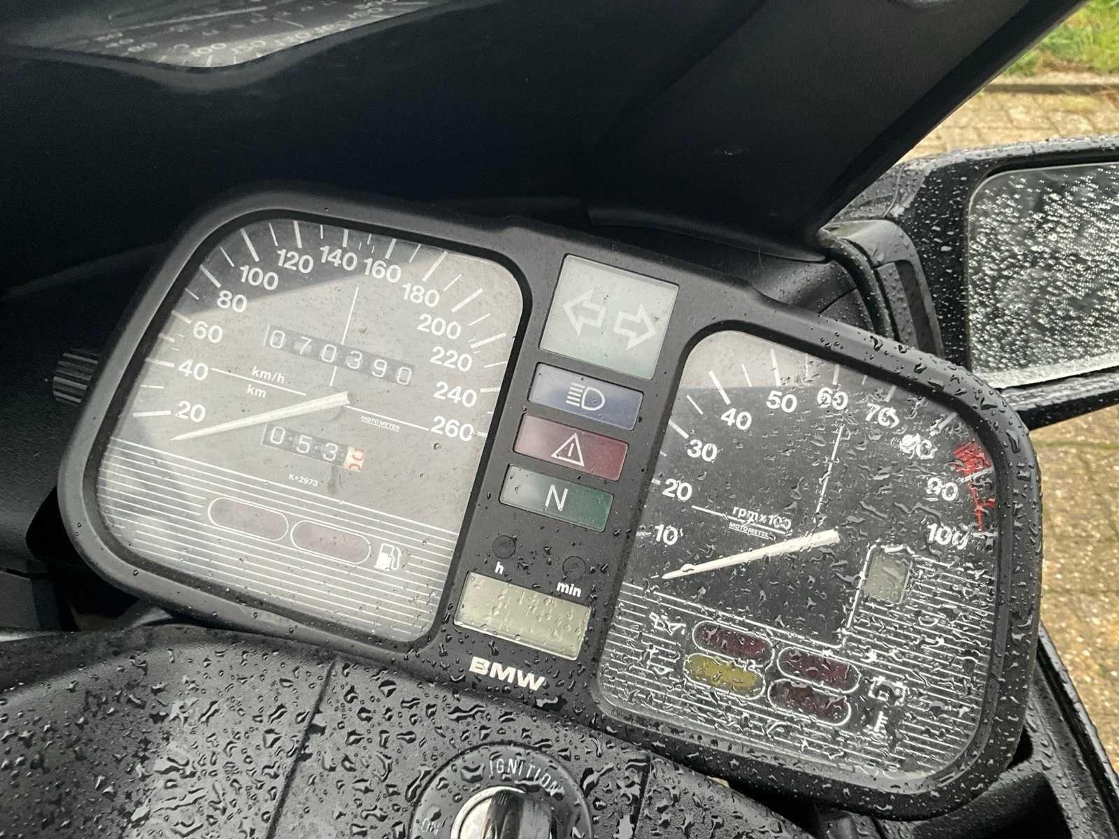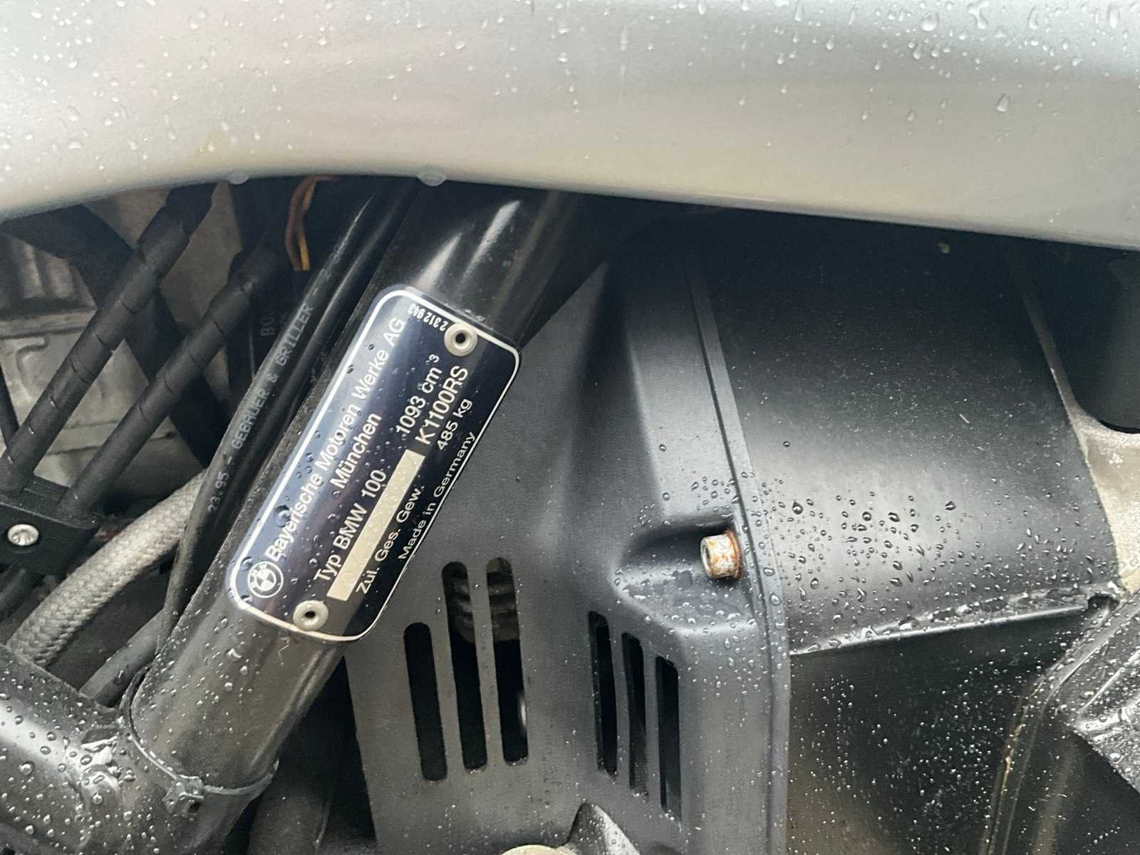Aanwezige boorddocumenten:inschrijvingsbewijs deel I en II Merk: BMW Type: K1100RS Brandstof: Benzine Chassisnummer: 0199519K1100RS Cilinderinhoud: 1093cc Datum eerste toelating: 24/05/1994 Gewicht: 485kg Vermogen (kW): 72kW Afgelezen kilometerstand: 70390km Transmissie: Manueel Aantal sleutels: 1 Startinformatie: Start en rijdt Bouwjaar: 1991
