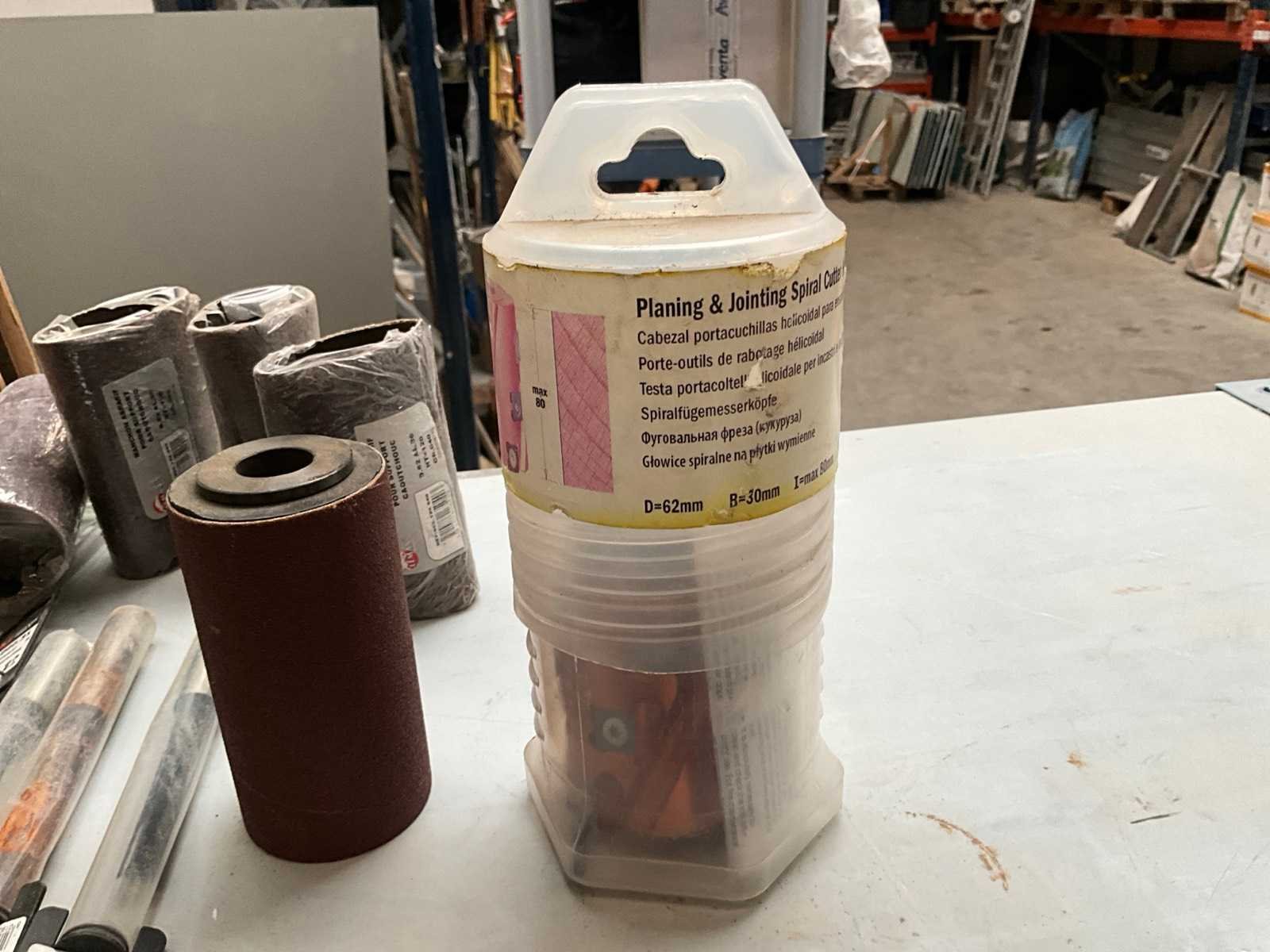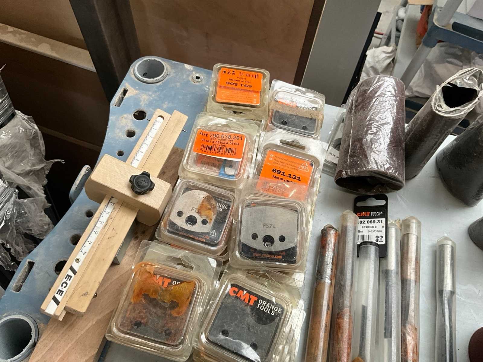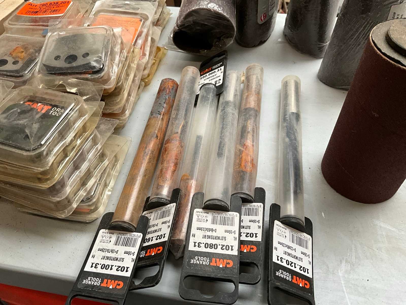 Waaronder spiraalfreeskop, diverse radiusmessen, rechte freesbits, 4x schuurband compleet met 2 diverse zaagbladen Merk: CMT