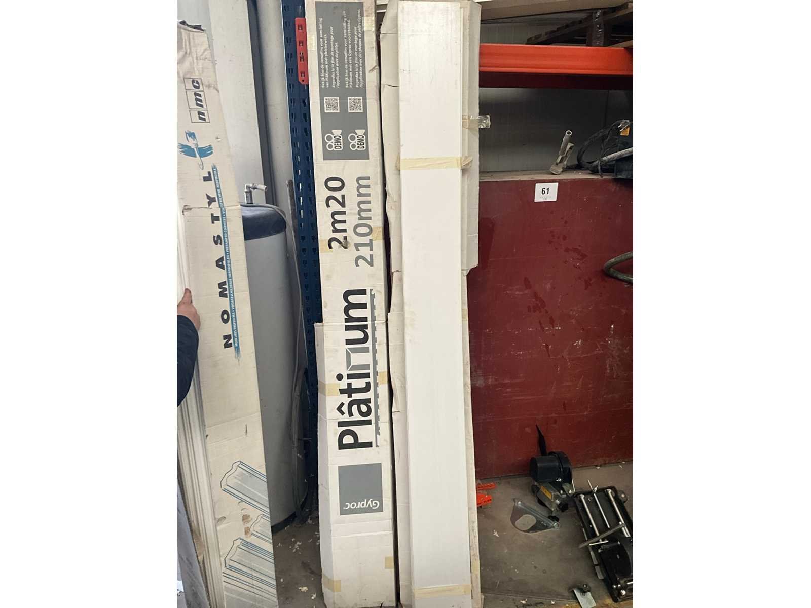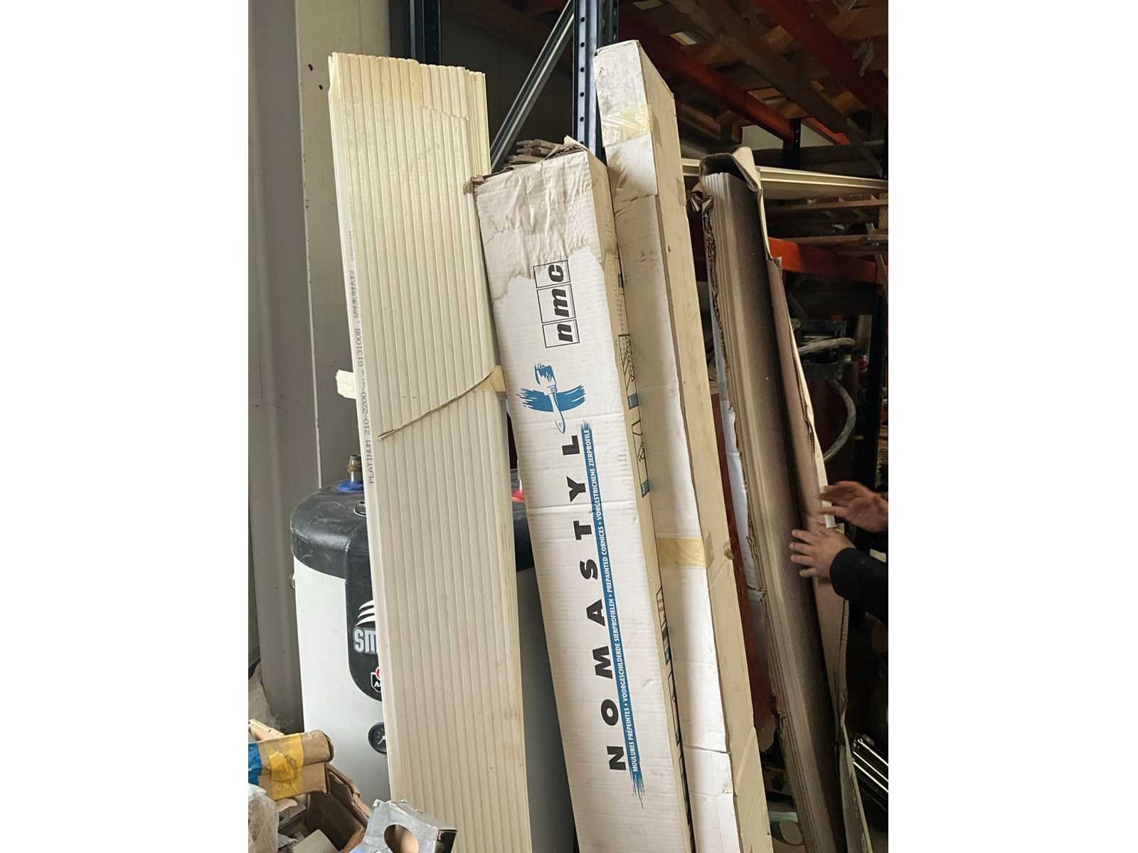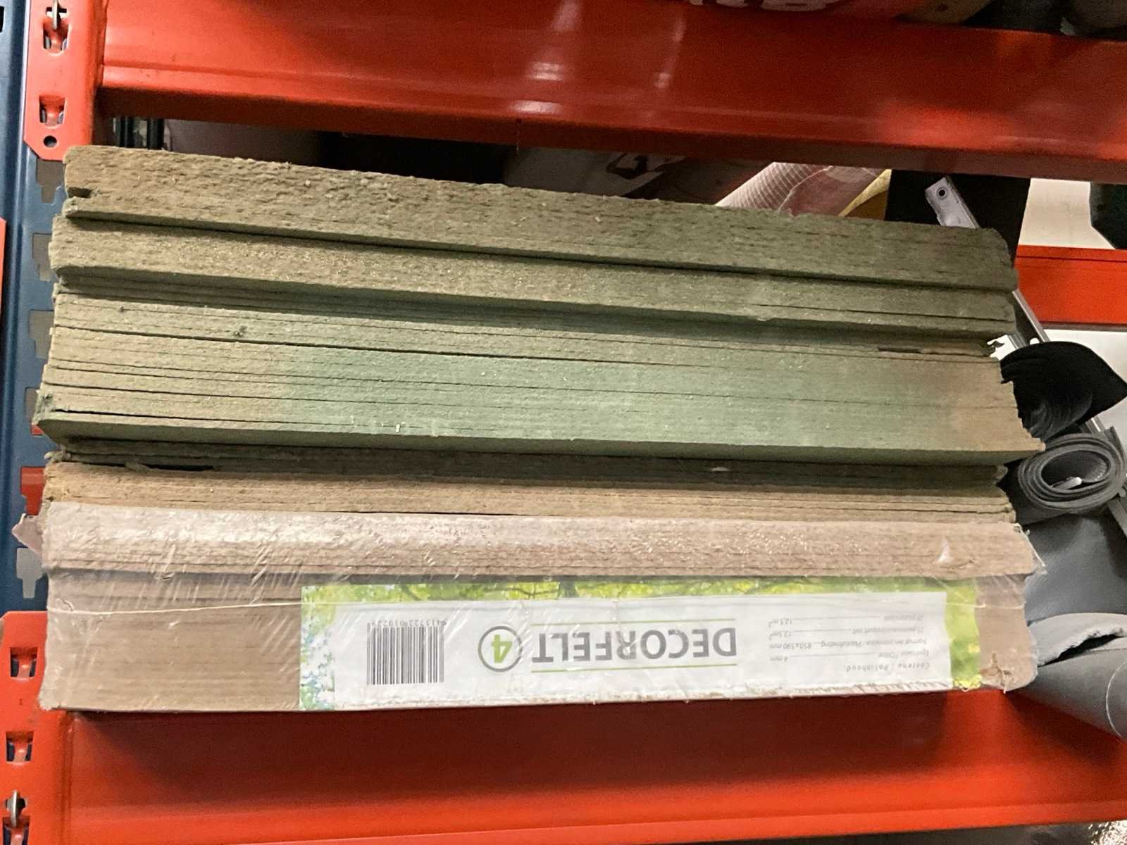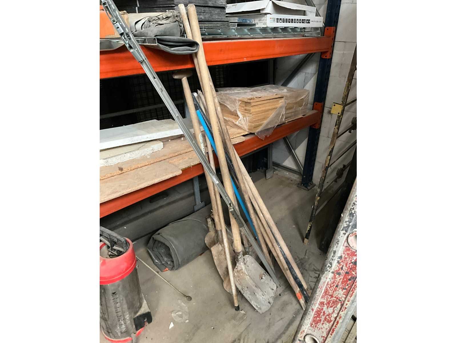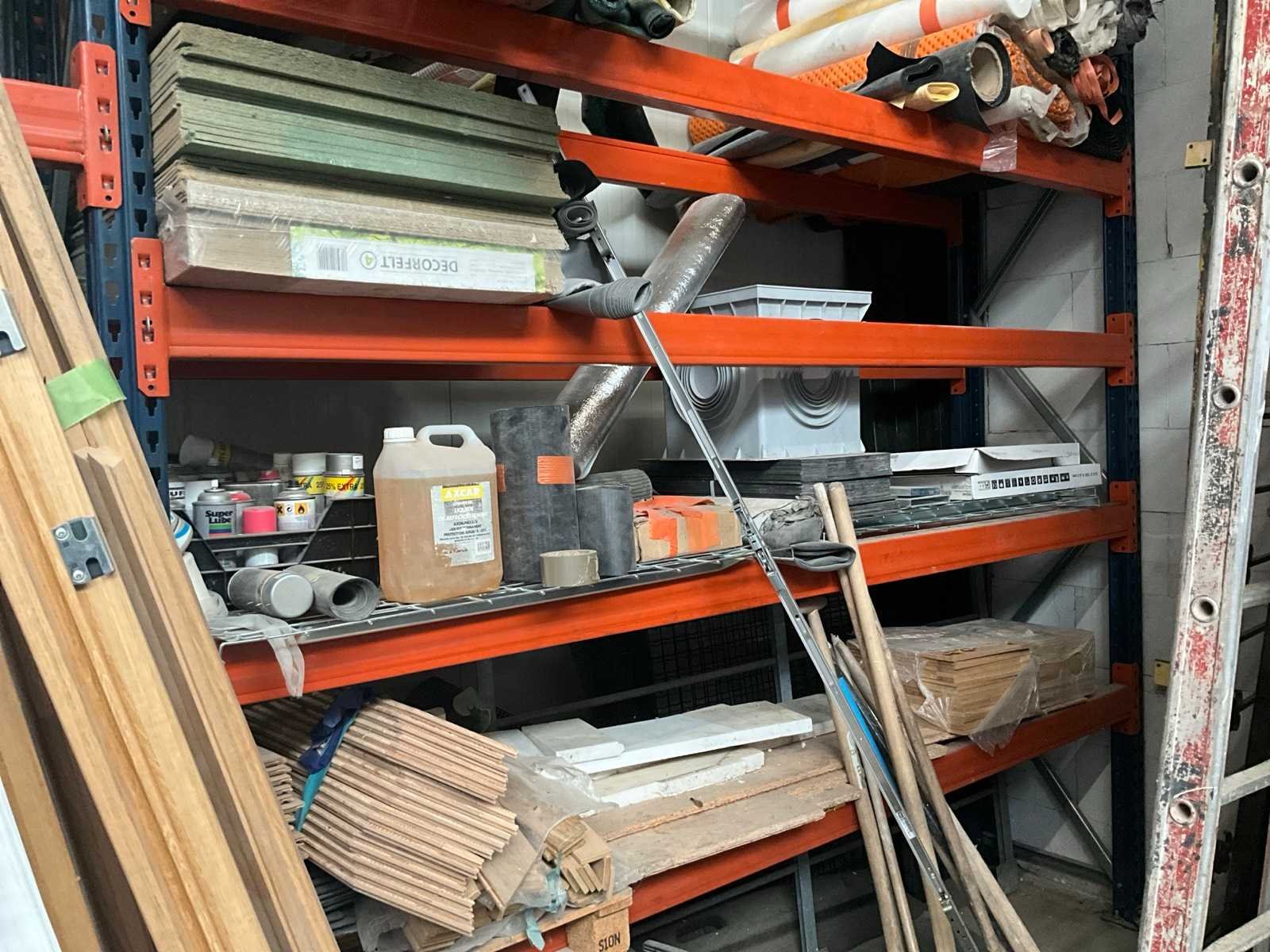 Waaronder diverse rollen EPDM, folie,.., diverse isolatieplaten Decorfelt 58x59cm, partij diverse lakken en sprays, enige restanten parket, pvc toezichtput, 2 diverse drukspuit en enige werkgereedschappen waaronder schoppen, stelen,.., compleet met pallet inhoudende diverse gevelstenen, dakpannen en 7 mortelkuipen, pleistermolieren en gyprocafwerplaten, afgifte volgens aanwijzing