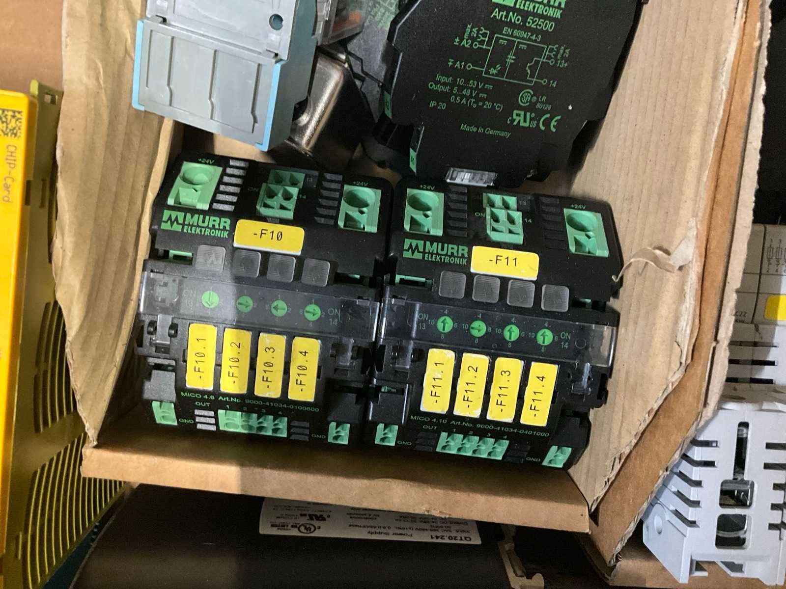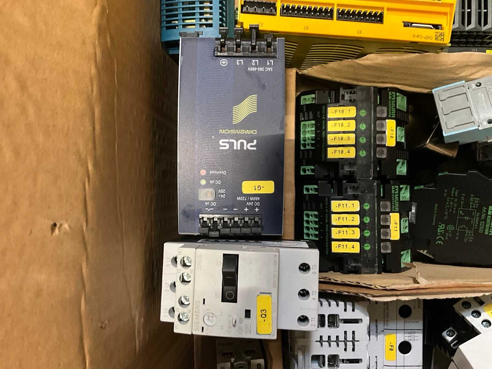 BR-automationB&R X20 CP1484 Rev. F0 CPU 1x; Siemens Vermogenschakelaar uitvoering S00 voor de motorbeveiliging 4x; Puls PULS DIMENSION Q Switched Mode DIN Rail Power Supply, 380 → 480V ac ac Input, 24V dc dc Output, 20A Output, 480W 1x; Murr Elektronik Murrelektronik Limited MIRO TR Series Solid State Interface Relay, 48 Vdc Control, 0.5 A Load, DIN Rail Mount 11x; Siemens Powerrelais, AC-3, 8,4 A, 4 kW / 400 V, 3-polig, DC 24 V, hulpcontacten: 1 NC, schroefklemaansluiting 5x; Siemens Vermogensrelais, AC-3 9 A, 4 kW / 400 V 1 NC, DC 24 V 3-polig 4x; Murr Elektronik Murrelektronik Limited Electronic Circuit Breaker 1x; Murr Elektronik Murrelektronik Limited Electronic Circuit Breaker 1x; BR-automation B&R Automation X20 AI 4622 Analog Input Module 1x; Siemens MINIZED, lastscheidersschakelaar met zekering 1x; BR-automation B&R Input module X20 DI9371 Rev.G0 4x; BR-automation B&R output module X20 DO9322 Rev.I0 4x; Siemens Residual current operated circuit breaker 1x; PILZ PNOZ mi1p 8 input 3x; Murr Elektronik Murrelektronik Limited Interface Relay, DIN Rail Mount, 24V dc Coil, SPDT, 1-Pole, 6A Load 6x; Siemens Residual current operated circuit breaker, 2-pole 1x; Puls PULS MiniLine MLY Switched Mode DIN Rail Power Supply, 100 → 240V ac ac Input, 24V dc dc Output, 2.1A Output, 50W 1x; PILZ PNOZ m1p base unit 1x; Siemens leidingbeveiligingsschakelaar 400 V 10 kA 1x; Releco Releco Plug In Power Relay, 24V dc Coil, 10A Switching Current, DPDT 2x; Siemens Miniature circuit breaker 230/400 V 10kA 1x; BR-automation B&R Automation X20 BM 11 Busmodule 2x; Siemens leidingbeveiligingsschakelaar 230/400 V 10 kA 1x; Schaffner AC/DC EMI Filter 1-Ph 250VAC 20A 1x; Hager Contactdoos met randaarde, verhoogd aanraakveilig 1x; General electric Din rail stopcontact 1x; Lutze MPE6 - Mounting module with soldering terminals for free component fitting of assembly parts 1x; Lutze LD-V1-0476 - Universal Suppressor Module 1x.
