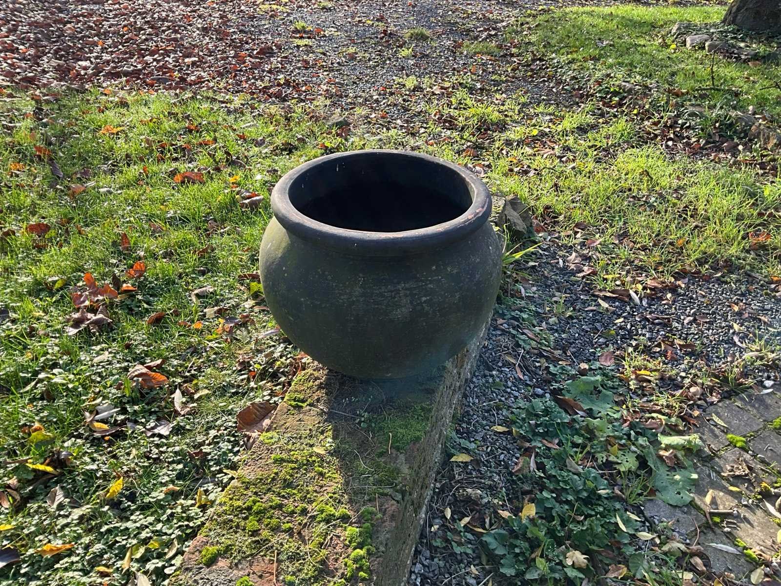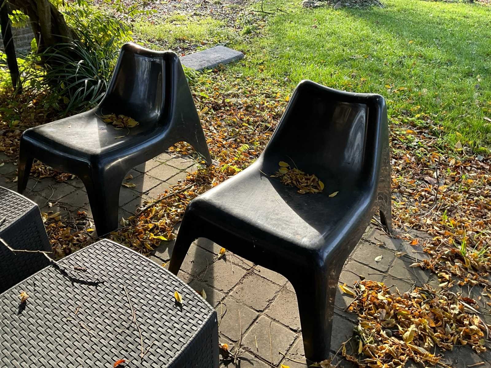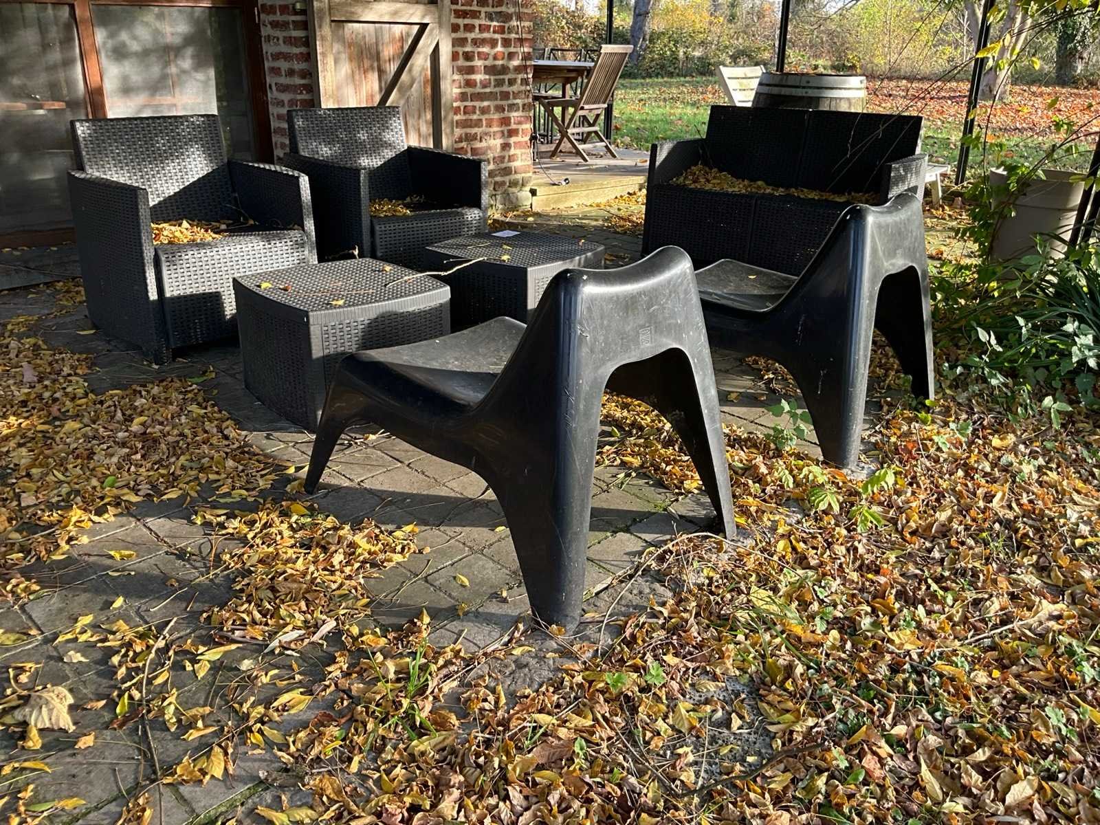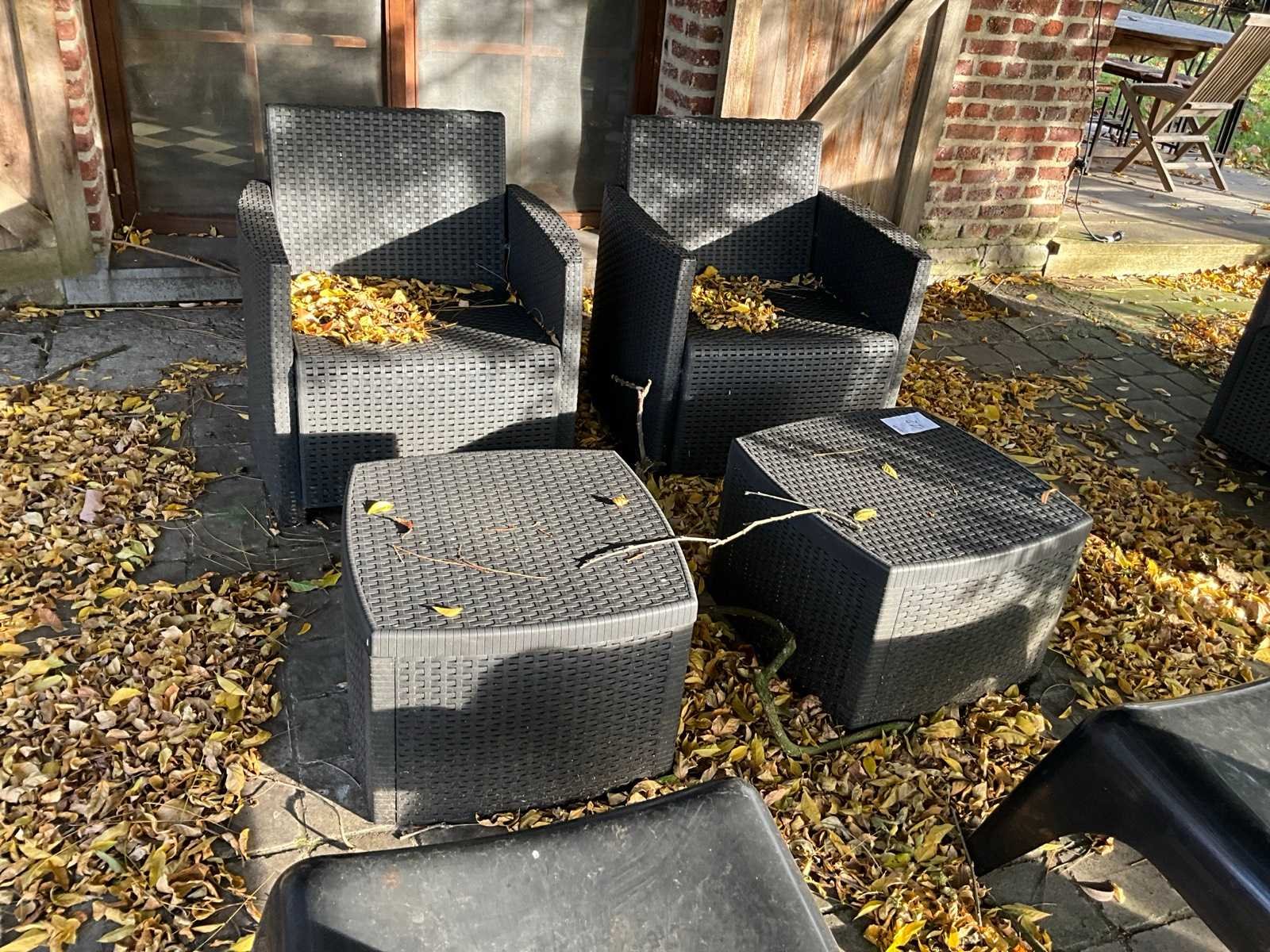 Bestaande uit 2 éénpersoonszetels, 2 tafeltjes, 1 tweeperssonszetel, 2 kunststof zetels, houten ton en 2 bloempotten