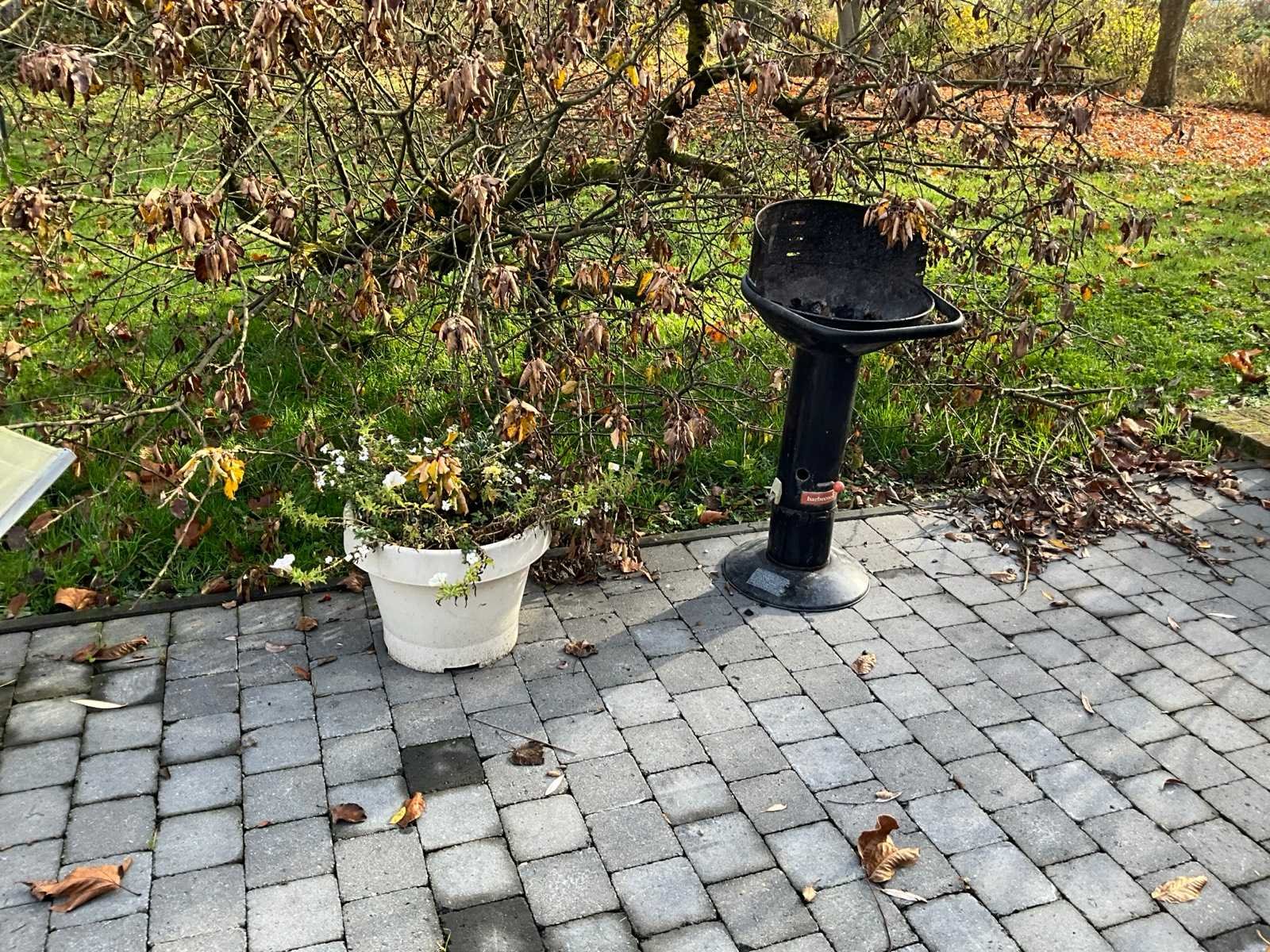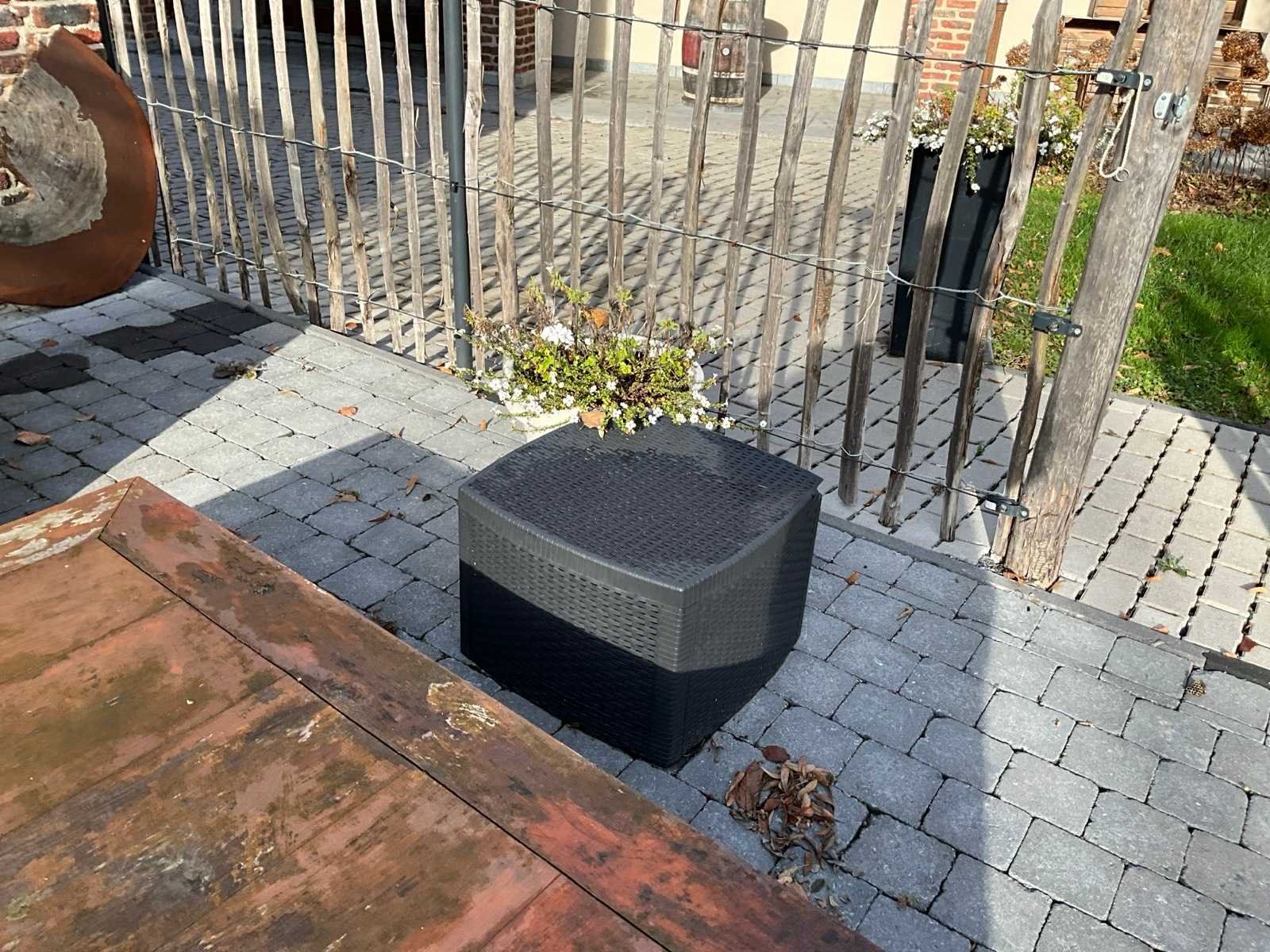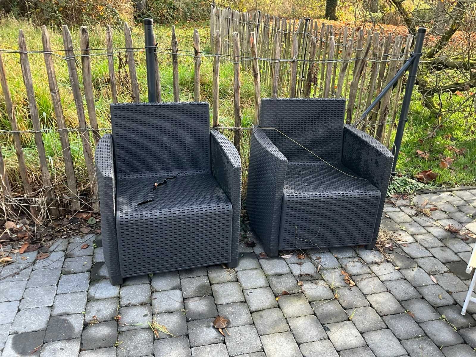Bestaande uit 9 delige tuinset waarvan sommigen beschadigd, circa 7 kussens, 2 ligzetels, bloempot en bbq