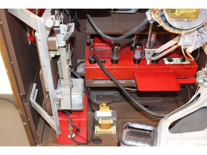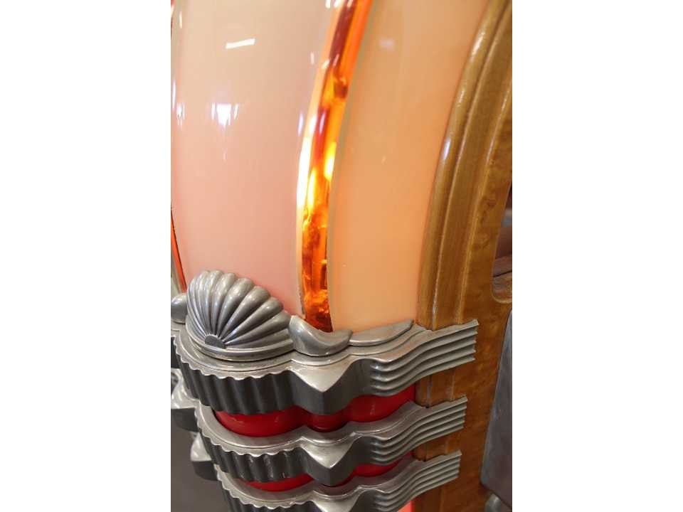 24 selecties, 78 tpm singles (worden erbij geleverd), draaiende en verkleurende pilasters, bubble tubes, gerestaureerd, design Paul Fuller, werking goed Merk: Wurlitzer Type: 1015 Bouwjaar: 1946 Gewicht: 120 Lengte: 680mm Breedte: 850mm Hoogte: 1550mm