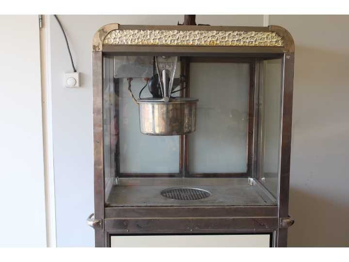 Amerikaanse popcornmachine, met emaille platen, zeldzaam exemplaar Merk: Burch Manufacturing Company Lengte: 61cm Breedte: 91.5cm Hoogte: 178cm Bouwjaar: 1940