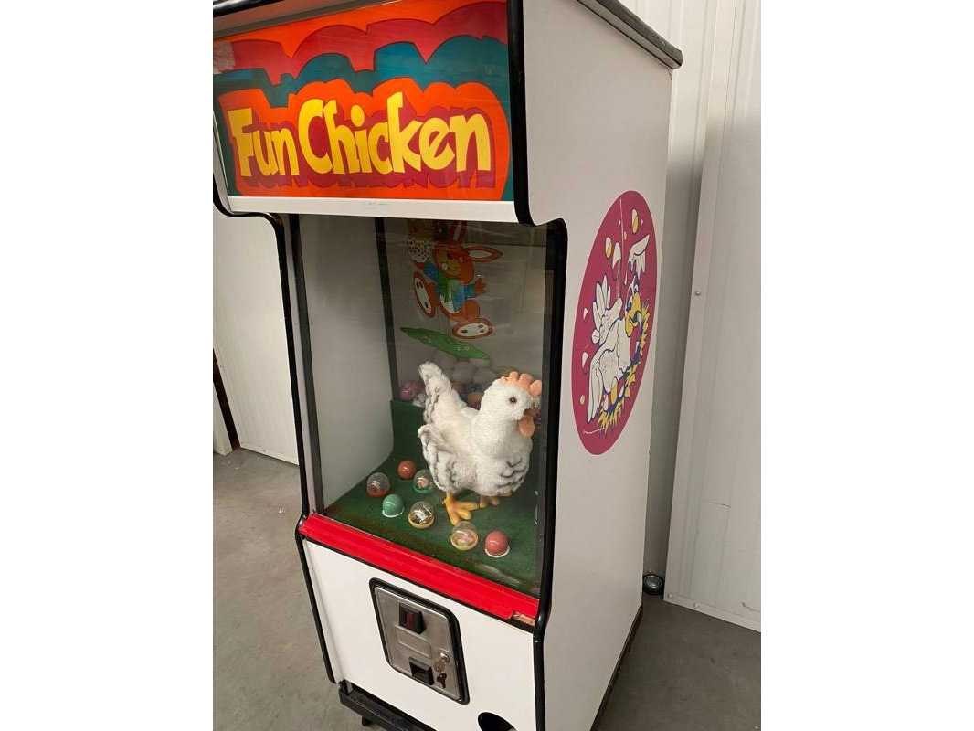Met licht en geluid; geeft na muntinworp een verrassingsei Merk: Fun Chicken Type: 1980 Materiaal: Hout