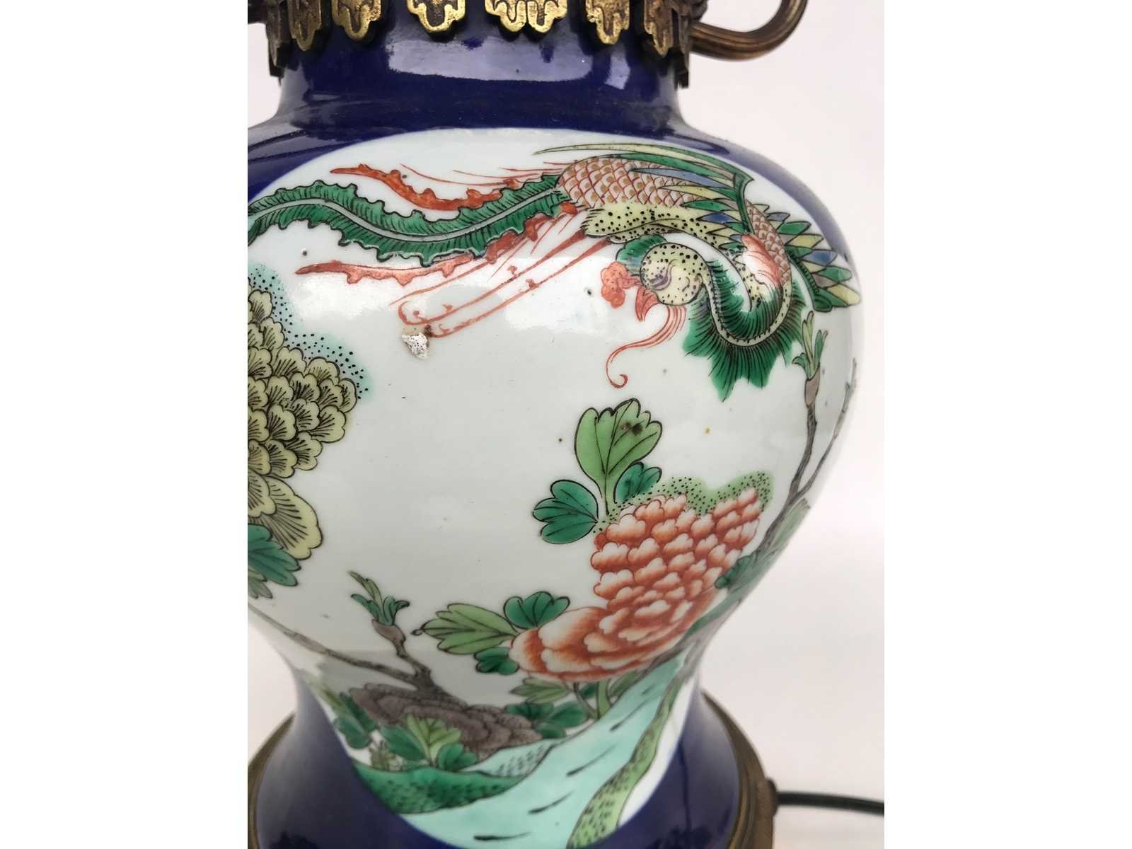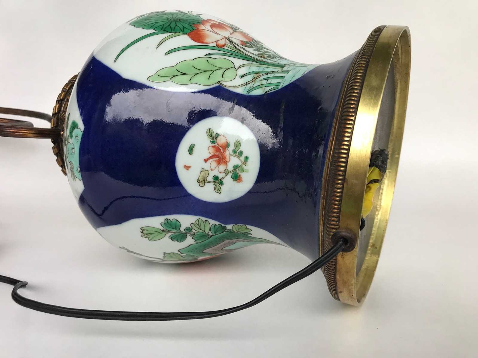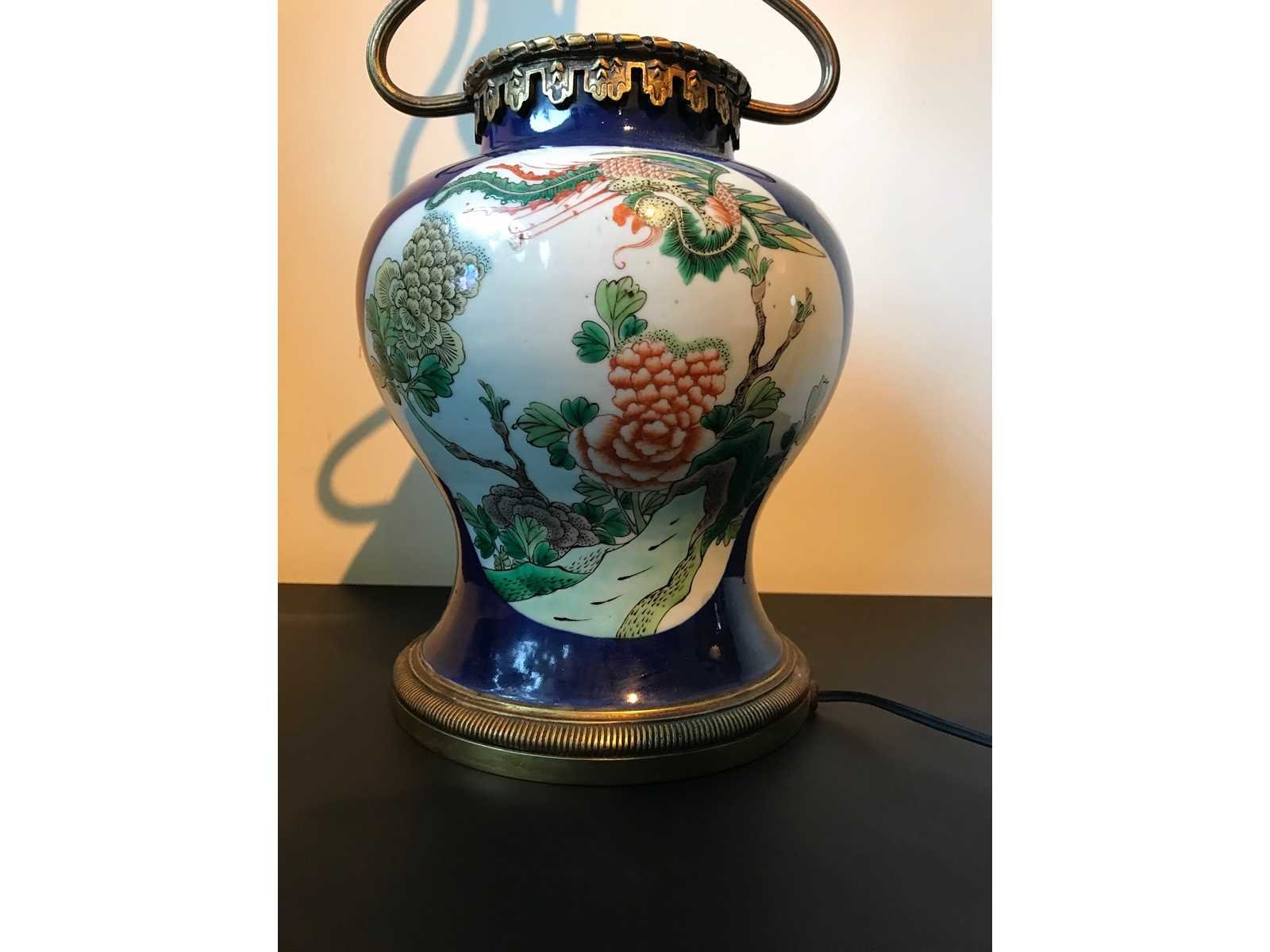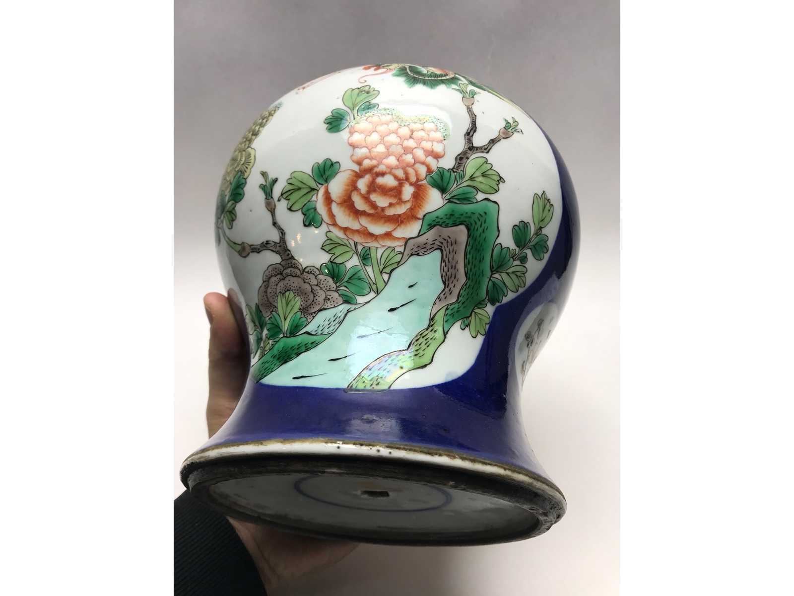 Chinese powder blue background Kangxi marked. Baluster vase. 24cm. Famille Rose scenes. Double circle Land: China Herkomst: Antiekhandelaar