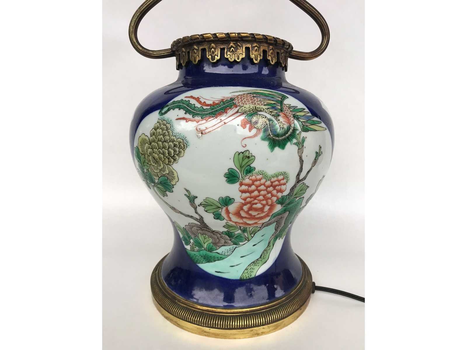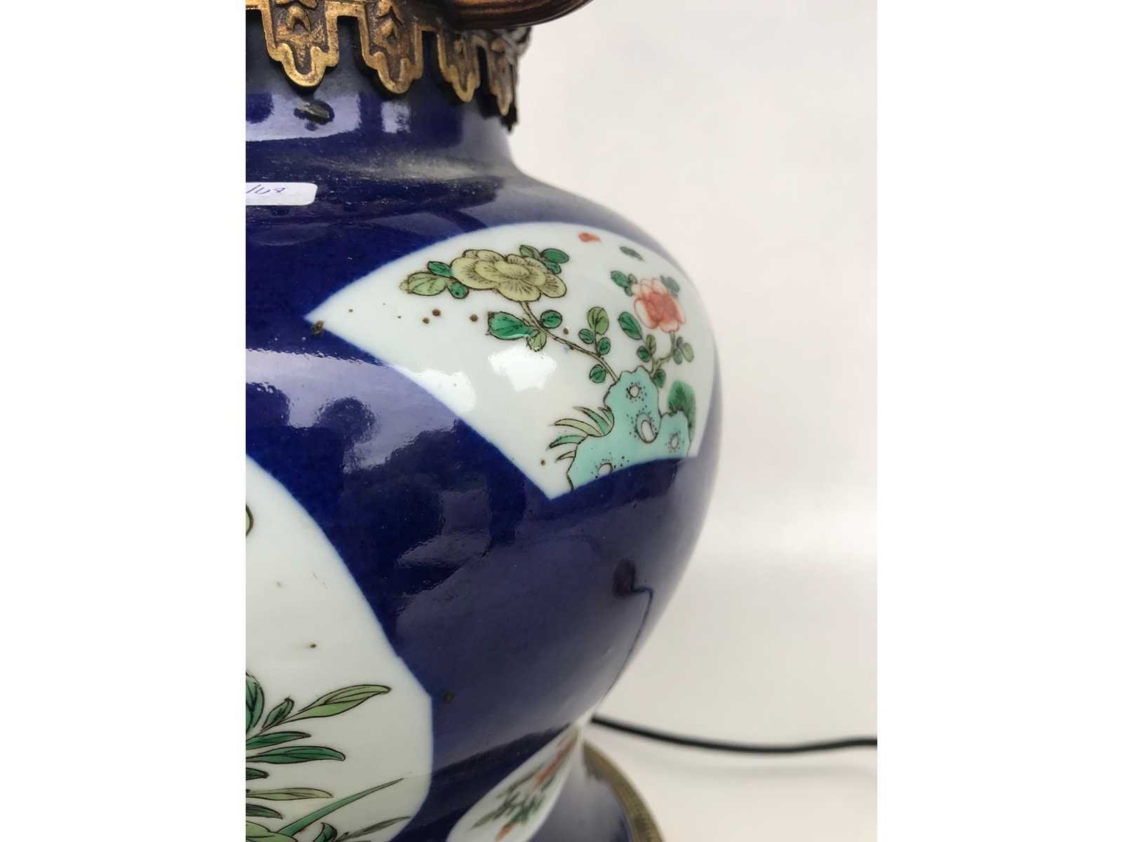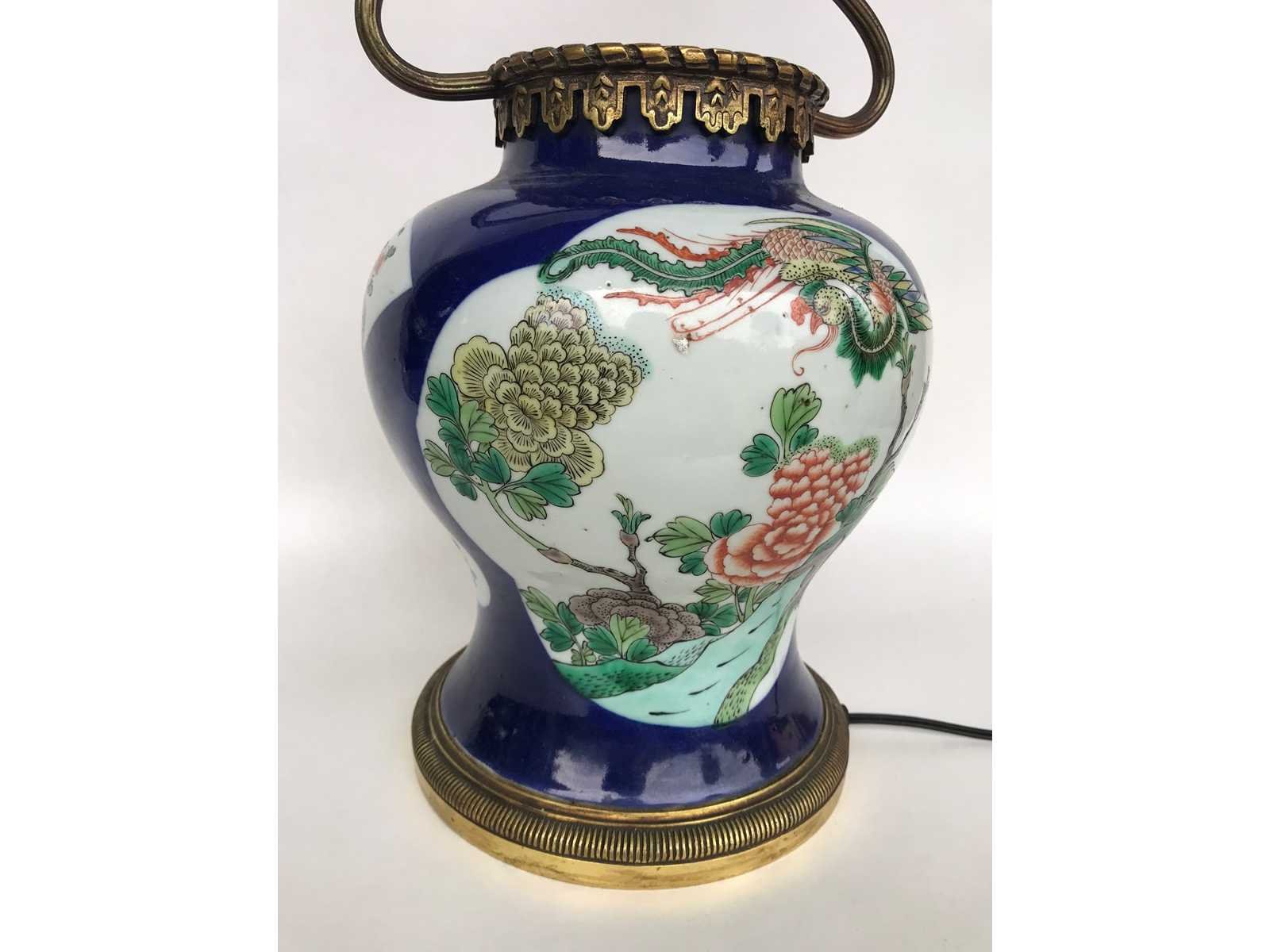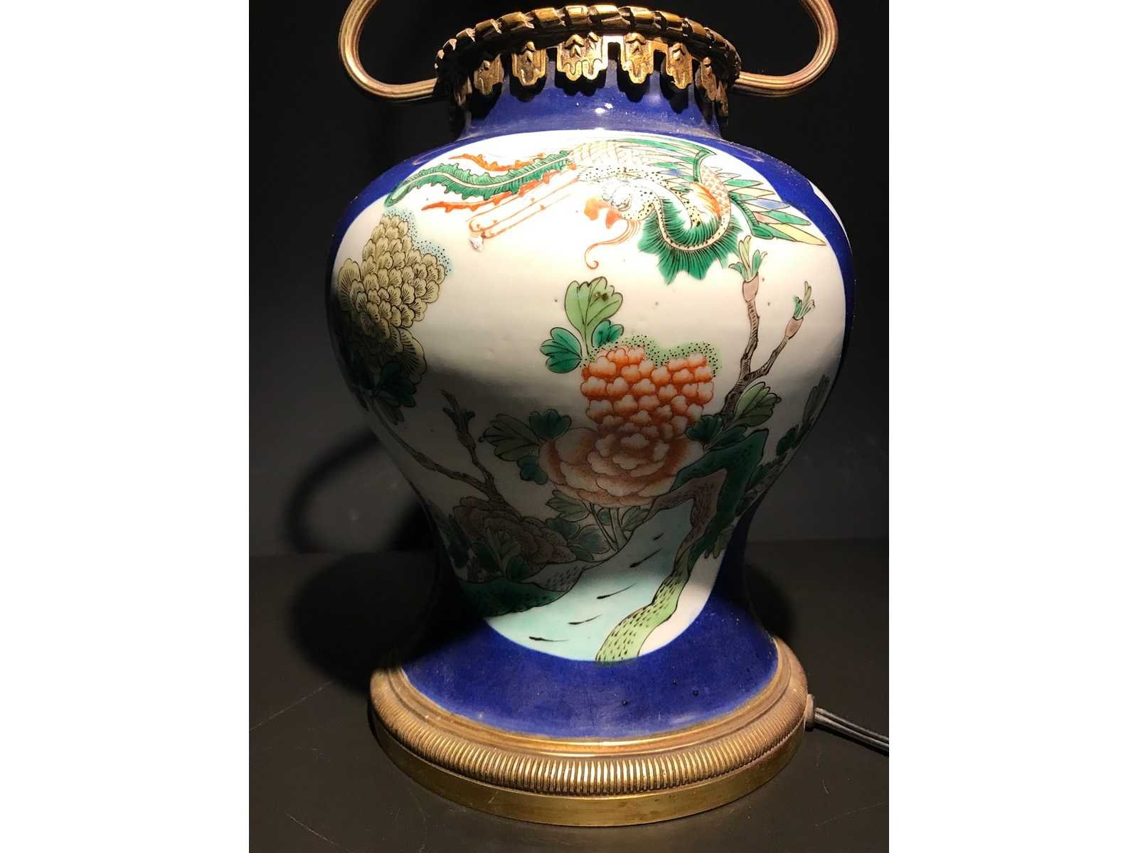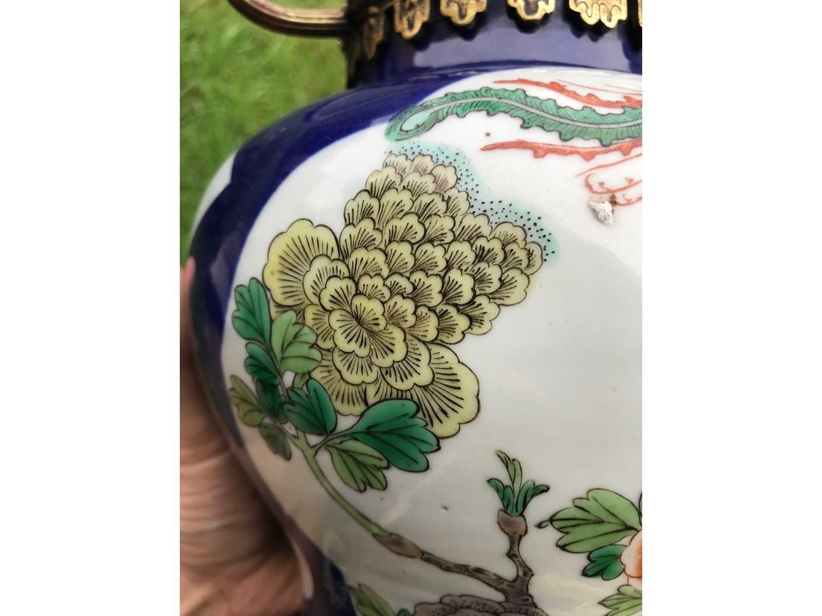 Chinese powder blue background Kangxi marked. Baluster vase. 24cm. Famille Rose scenes. Double circle Land: China Herkomst: Antiekhandelaar