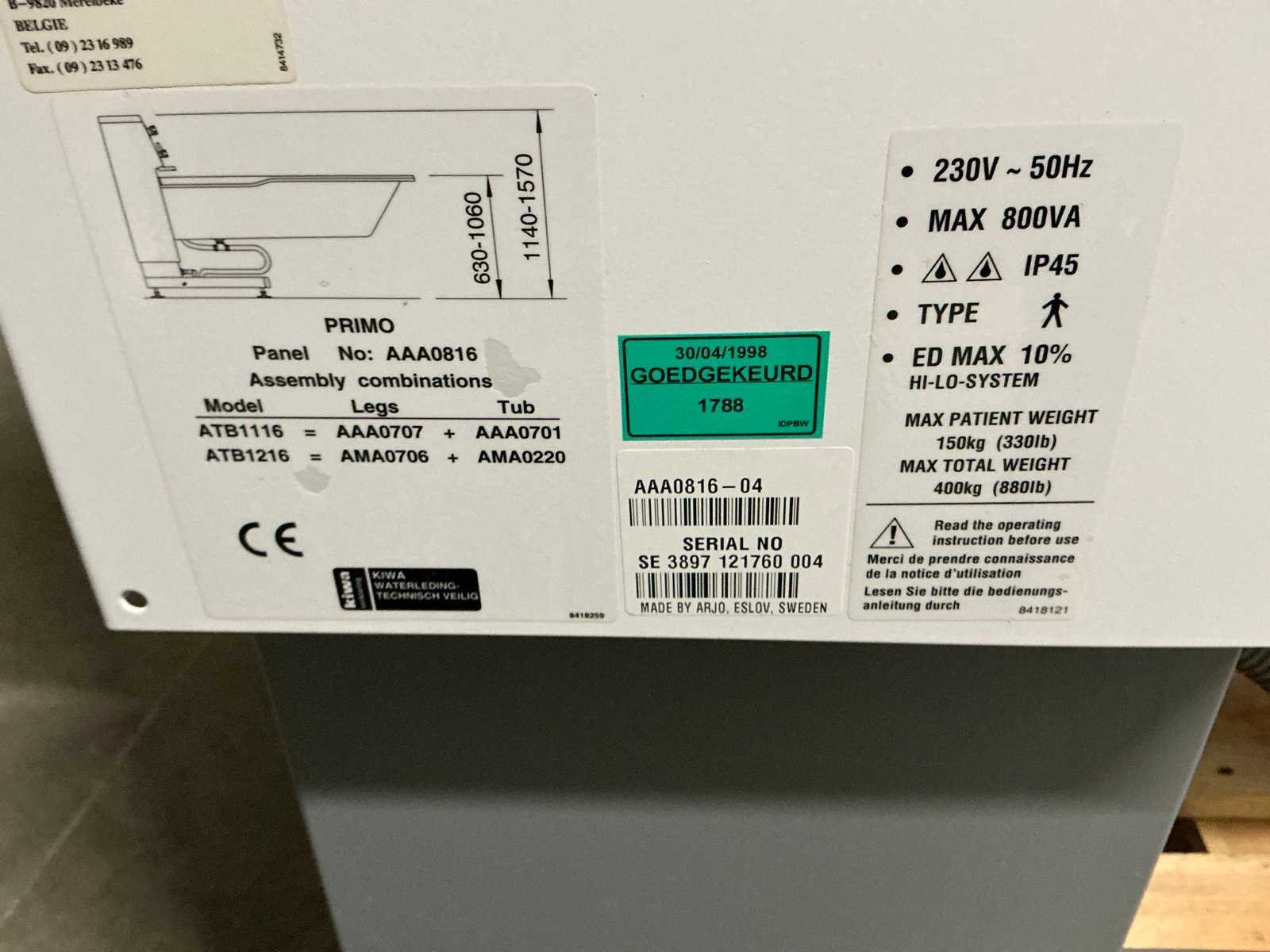 In hoogte verstelbaar bad, 230V Merk: Arjo Model: Primo Lengte: 215cm Breedte: 80cm Hoogte: 136cm