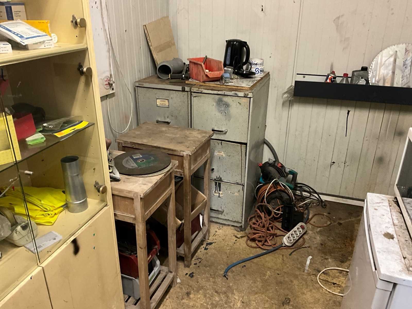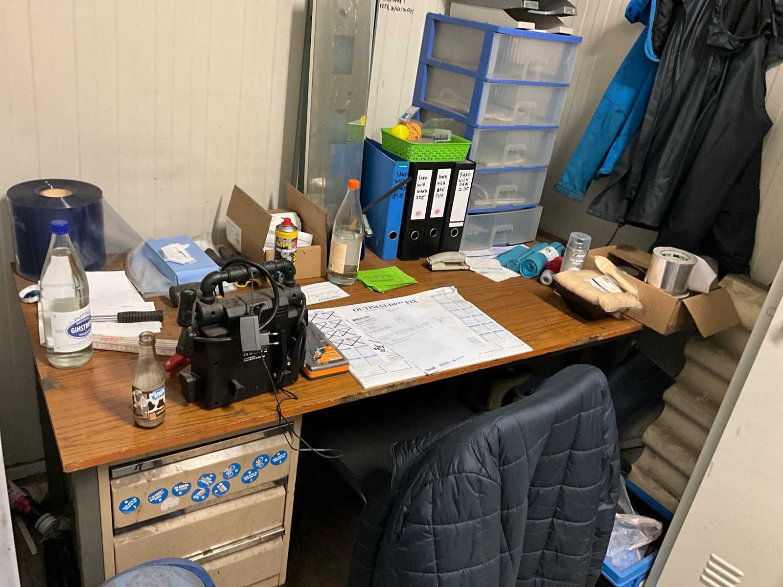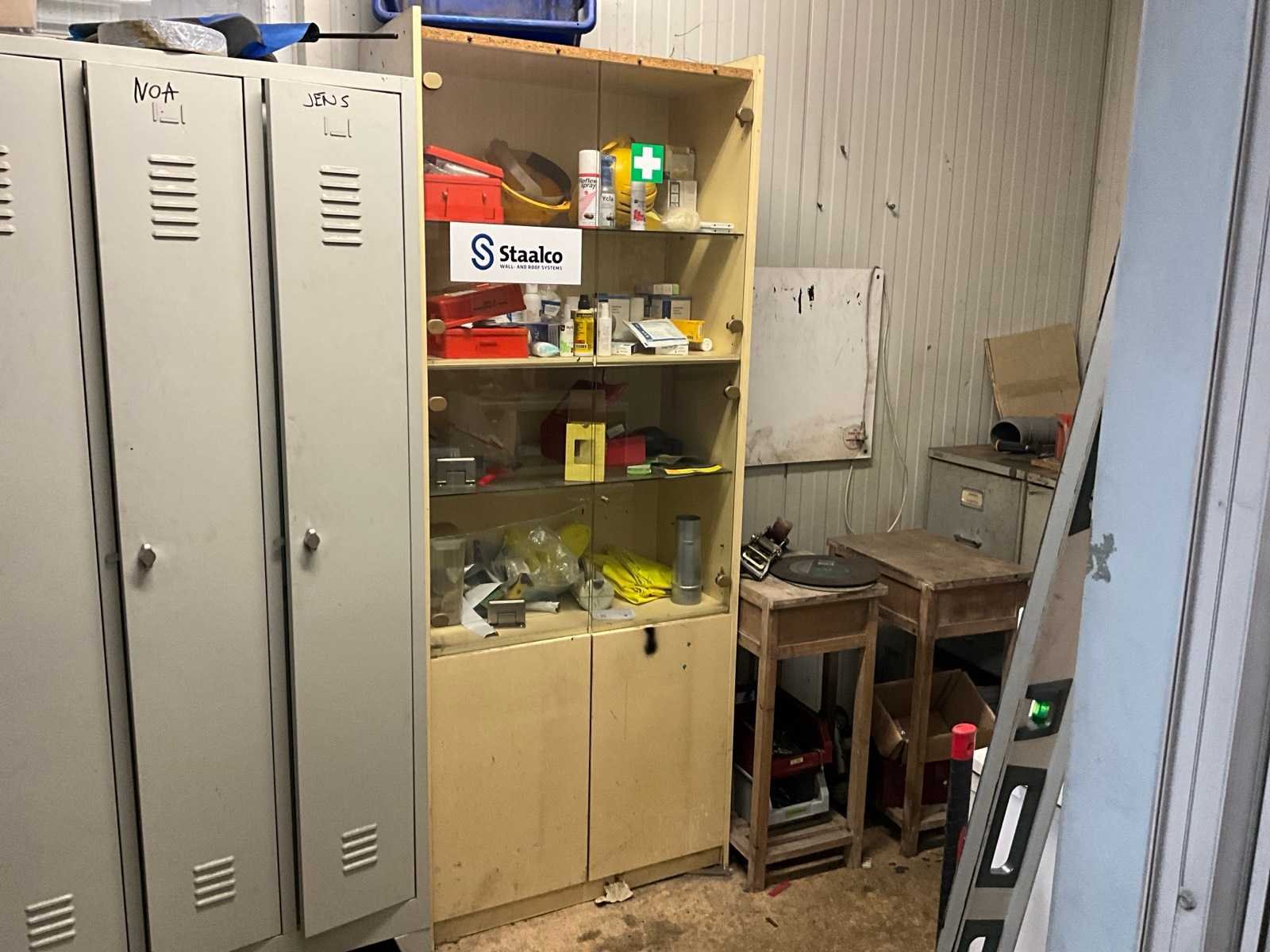 Bestaand uit lockerkast, bureel met stoel, koelkast en magnetron, waterpomp B&D, verlengkabels, waterkokers, startbooster Stanley, Passat en voorhamer, materiaalkoffer, EHBO materiaal enz…