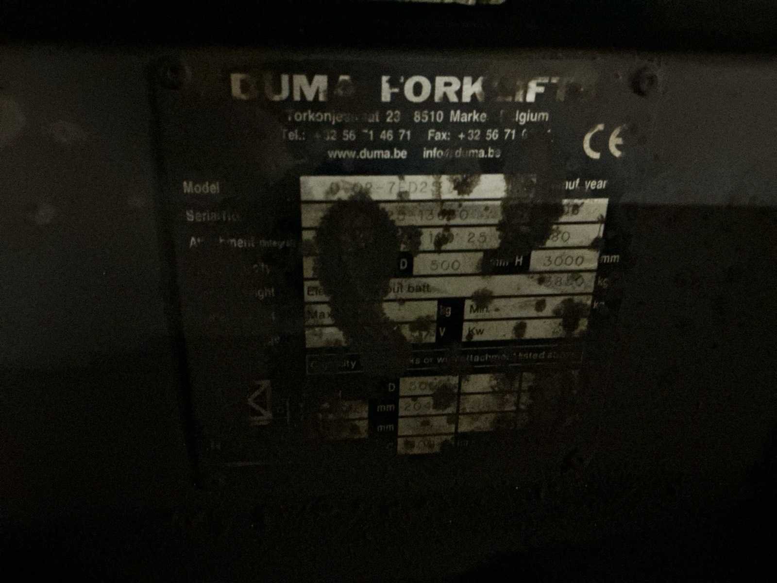 Merk: Toyota Type: Geneo 25 Aantal wielen: 4 Afgelezen urenstand: 8758 Roterend vorkenbord: true Duplex mast: true Hefvermogen: 2500kg Lepellengte: 1090mm Max. hefhoogte: 3000mm Vol rubber banden: true Diesel: true