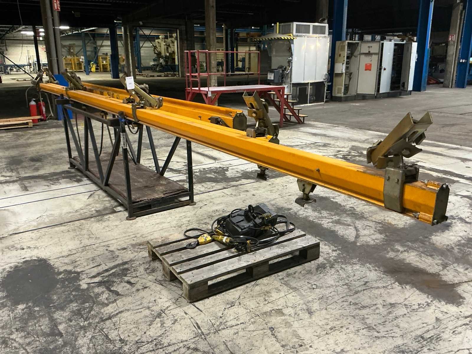 Overspanning circa 5,3m, met 2x kraanbalken circa 7 & 8,4m, inclusief Kone elektrische kettingtakel 250 kg met peerbediening Merk: Konecranes Hijsvermogen: 250kg