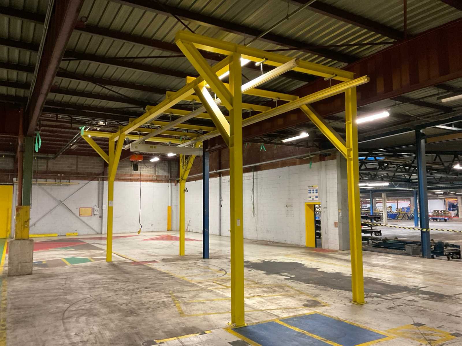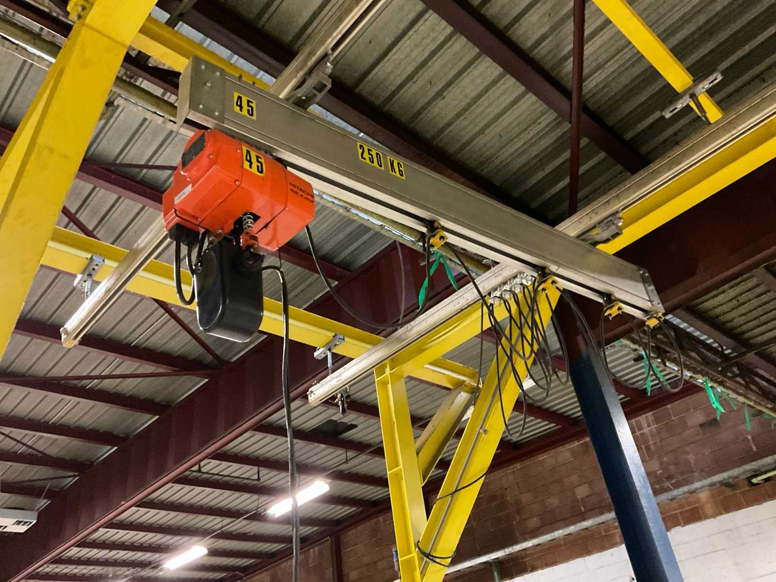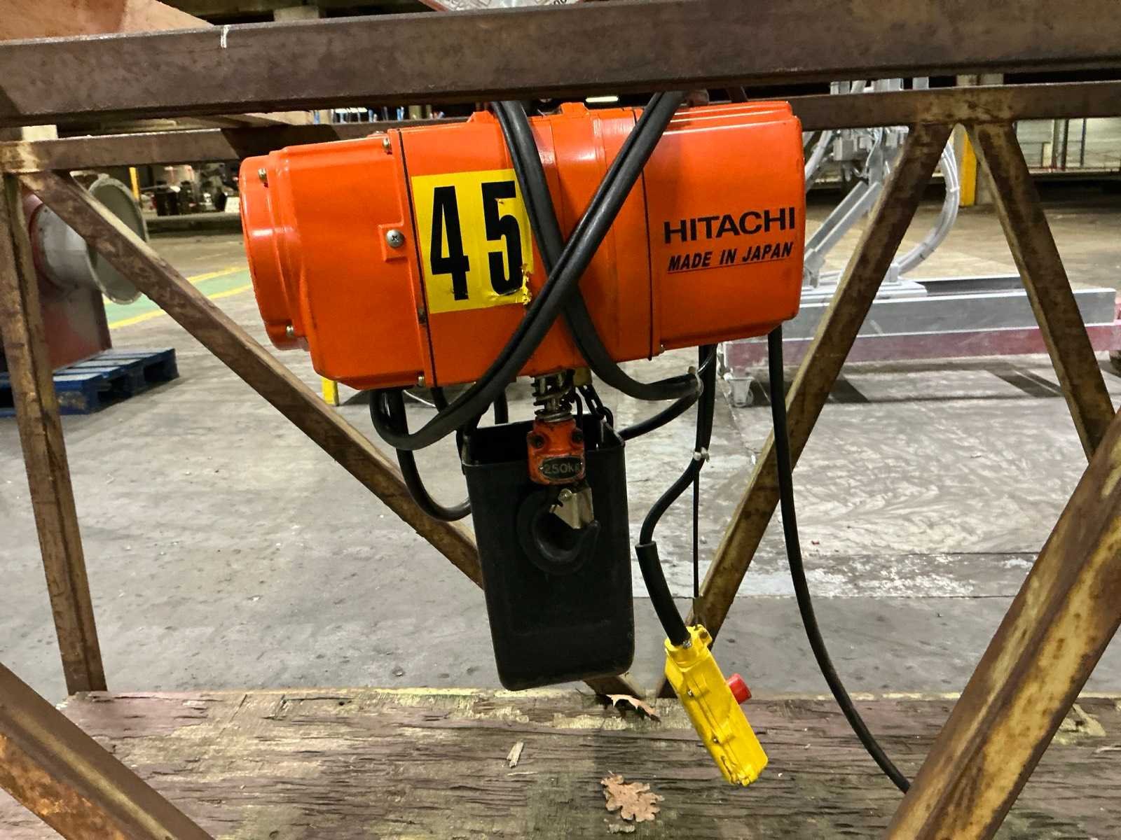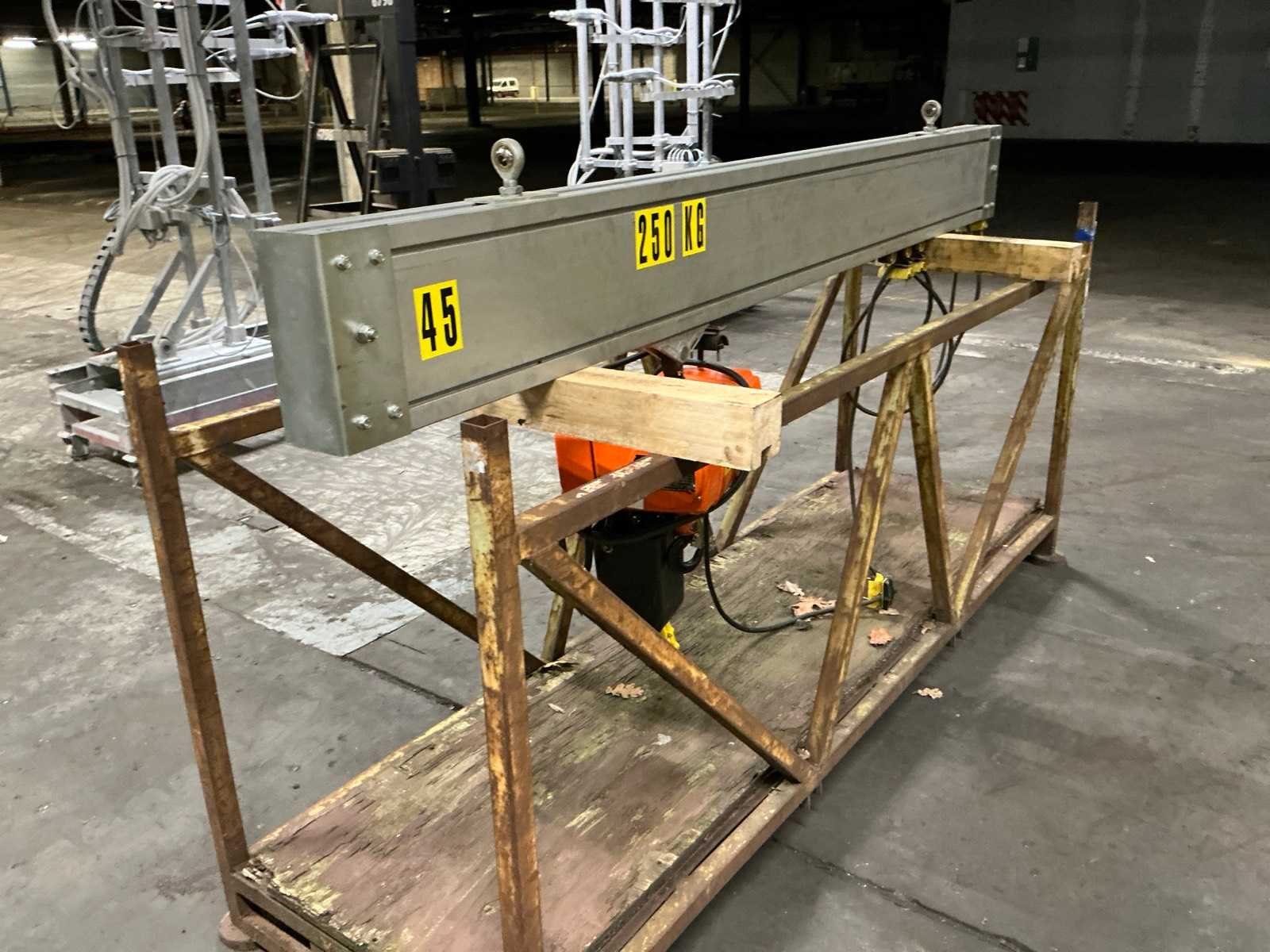 Met hangrailsysteem, voorzien van Hitachi elektrische kettingtakel 250kg, circa 2,5m overspanning met draagcapaciteit 250kg, met 2 loopbanen circa 10m, inclusief stalen portaal met hoogte circa 4,5m