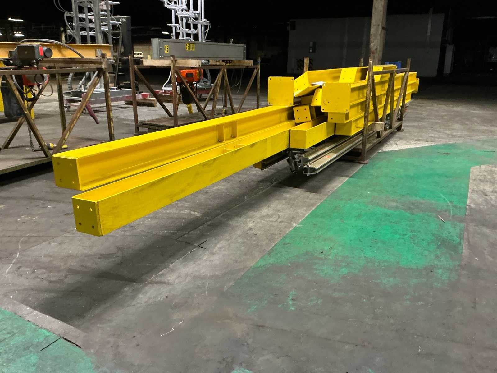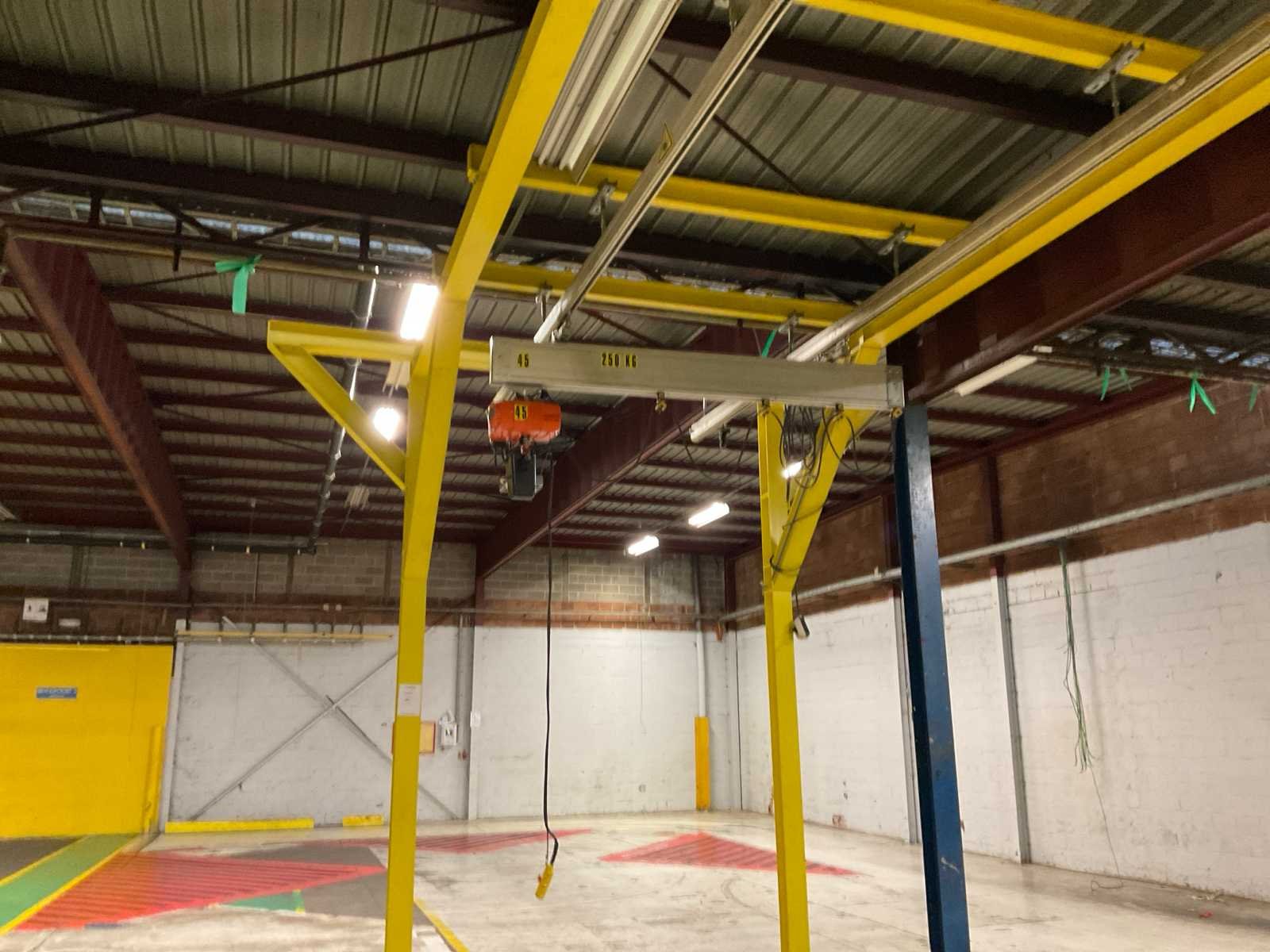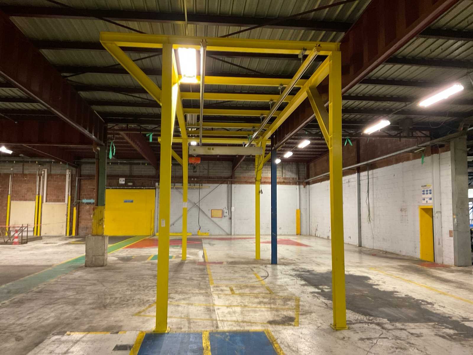 Met hangrailsysteem, voorzien van Hitachi elektrische kettingtakel 250kg, circa 2,5m overspanning met draagcapaciteit 250kg, met 2 loopbanen circa 10m, inclusief stalen portaal met hoogte circa 4,5m