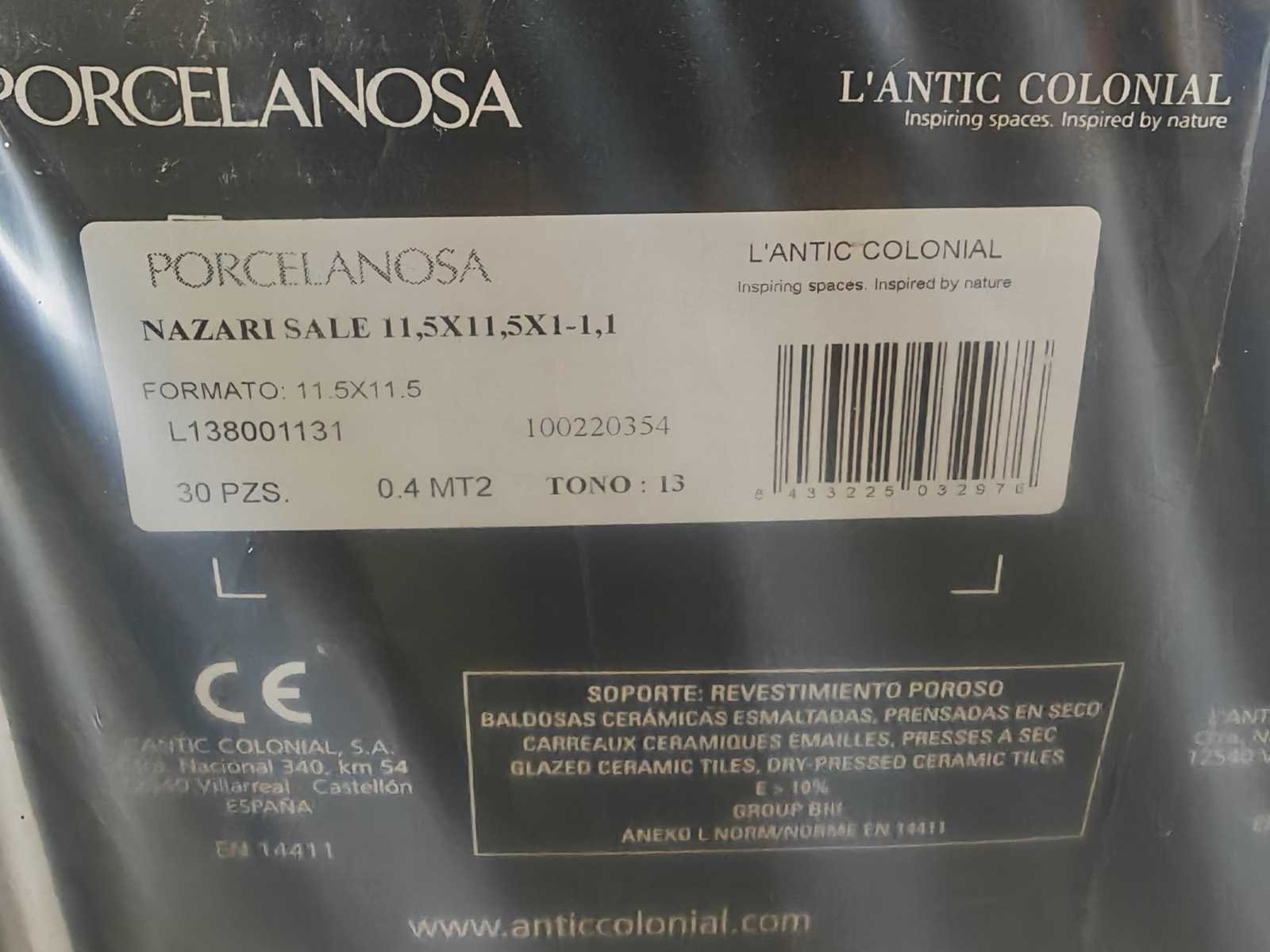 Merk: L'antic Colonial Kleur: Sale Afwerking: Mat Lengte: 11.5cm Breedte: 11.5cm Materiaal: Keramiek Dikte: 11mm Type: Wandtegel Model: Nazari 100220354 Gewicht: 675kg Aantal m² per verpakking: 0,40m² Aantal pakken: 85