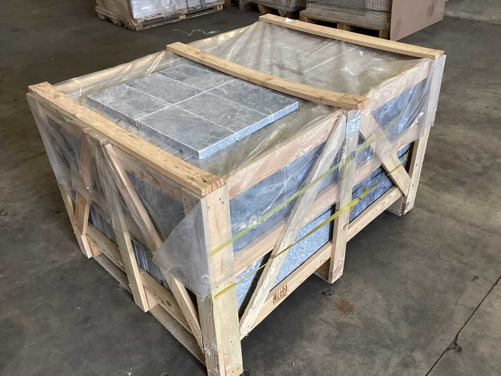 Merk: Natuursteen Kleur: Blauw Afwerking: Gezoet en Getrommeld Lengte: 300mm Breedte: 400-500-600mm Dikte: 30mm Materiaal: Hardsteen Type: Vloertegel Totaal oppervlakte: 36.8m² Totaal gewicht: 2300kg