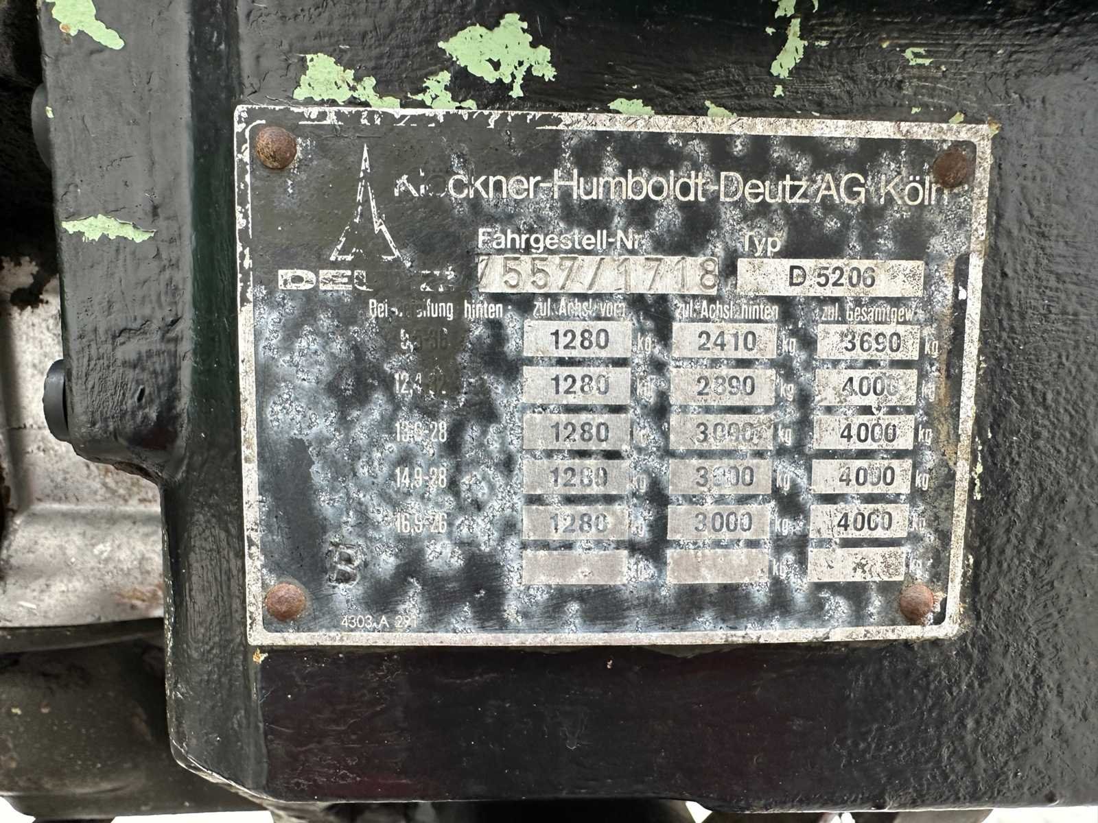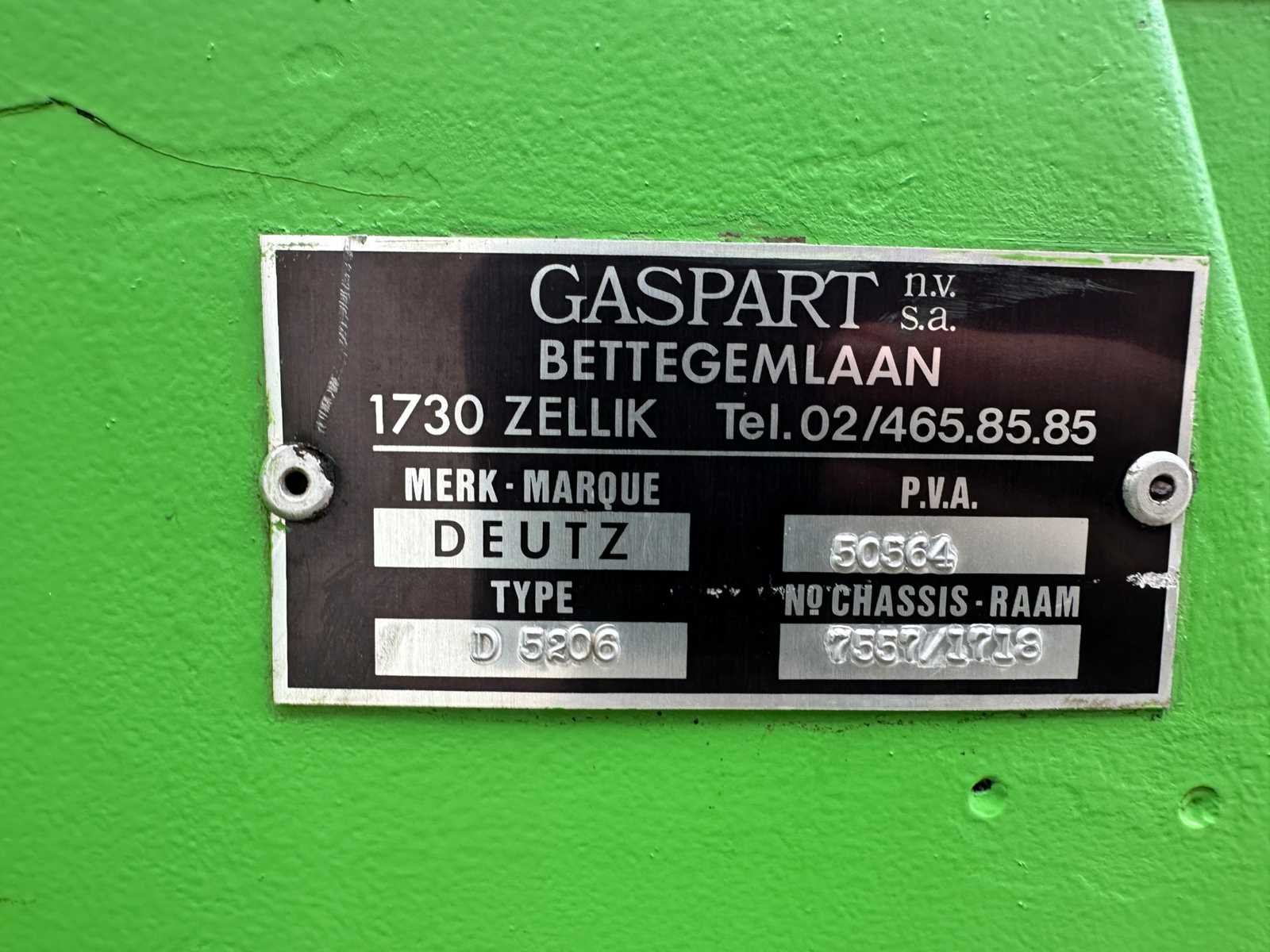 Belgische inschrijvingsdocumenten aanwezig. 1x DW olieventiel. Verstelbare trekhaak. Merk: Deutz Type: D5206 Bouwjaar: 1978 Chassisnummer: 75571718 Motorvermogen (kW): 38kW Afgelezen urenstand: 6165 Bandenmaat voor: 7.50-16 Bandenmaat achter: 13.6/12-36 Eigen gewicht: 2450kg Totale afmeting L: 3500mm Totale afmeting Breedte: 2100mm Totale afmeting Hoogte: 2400mm