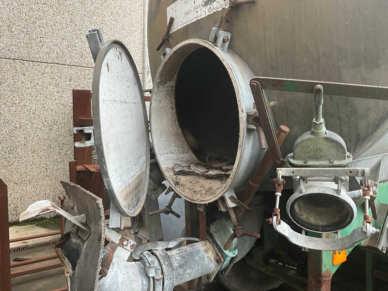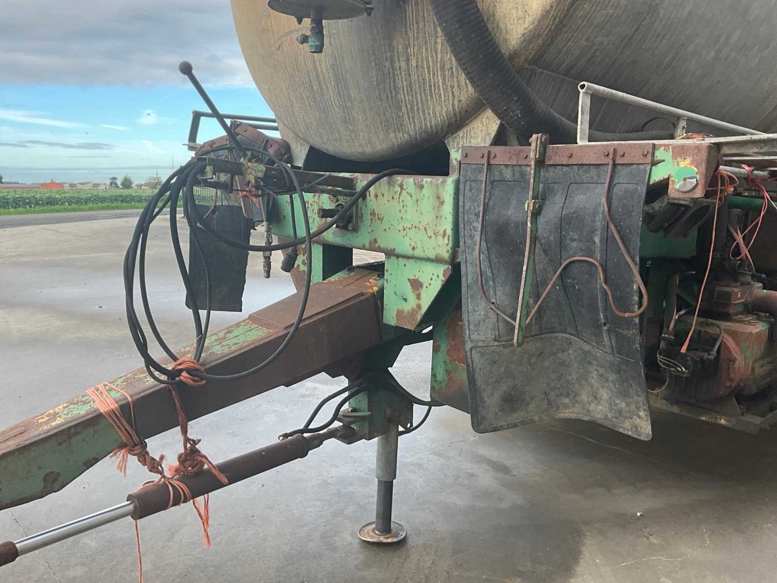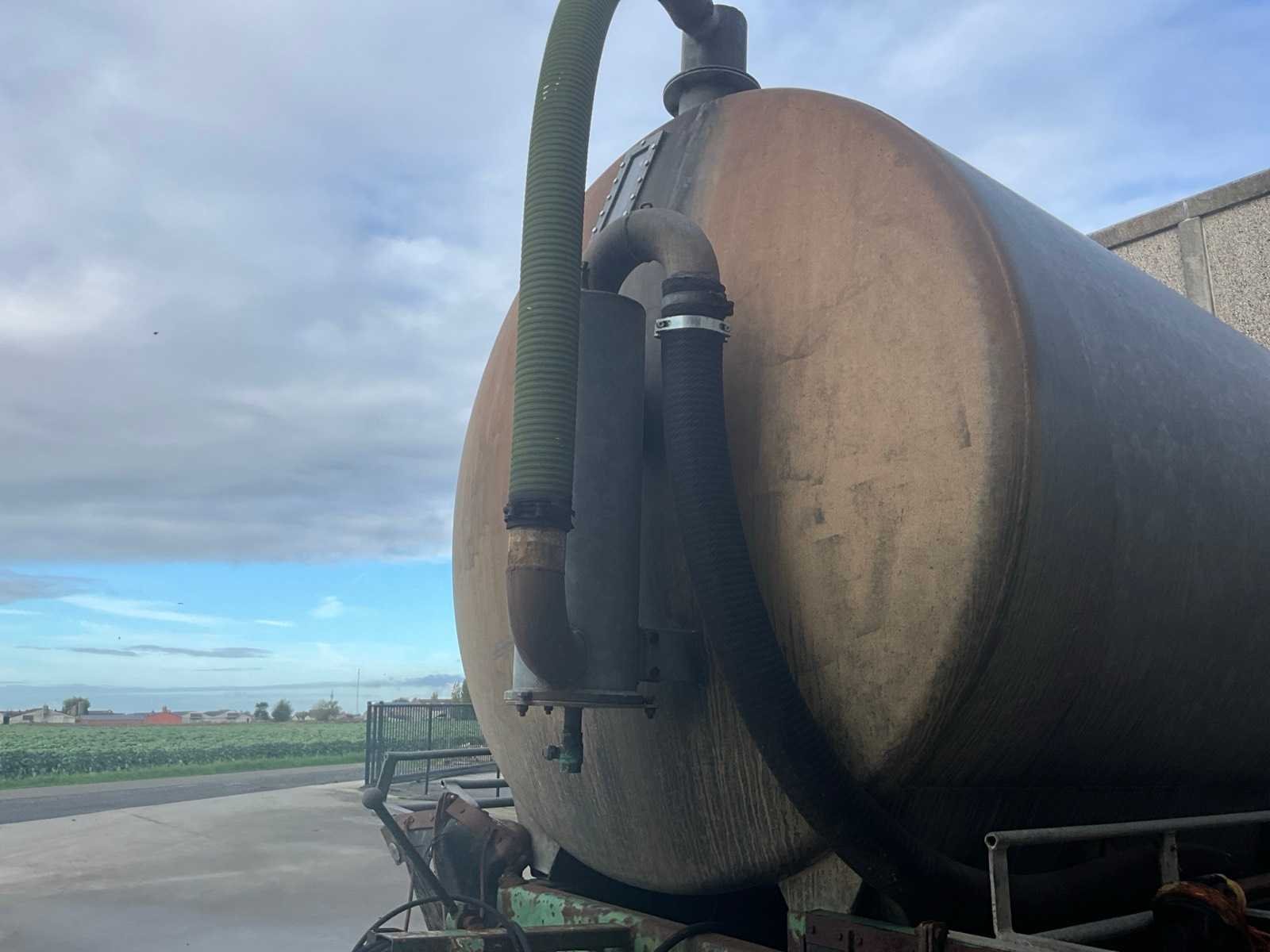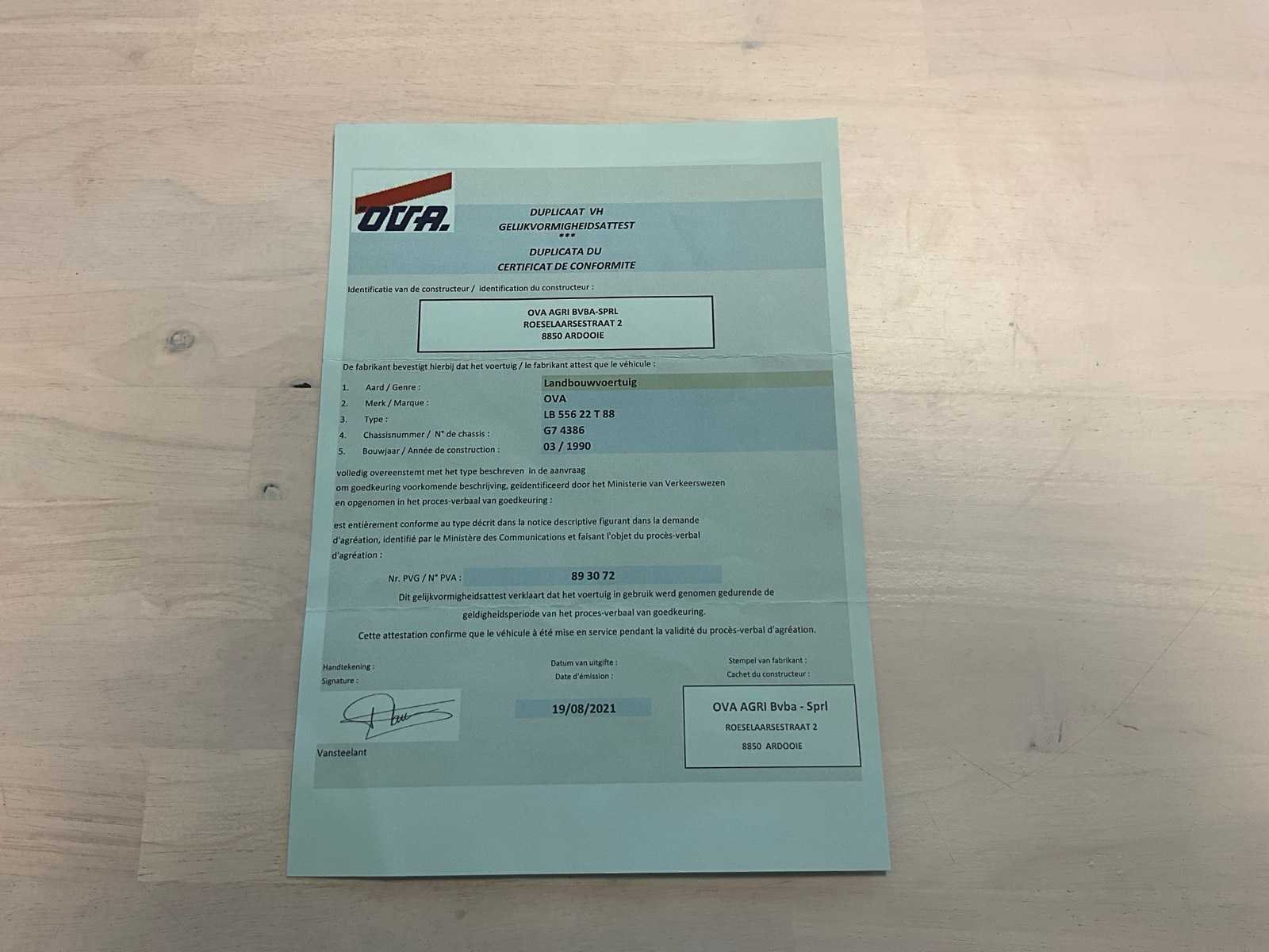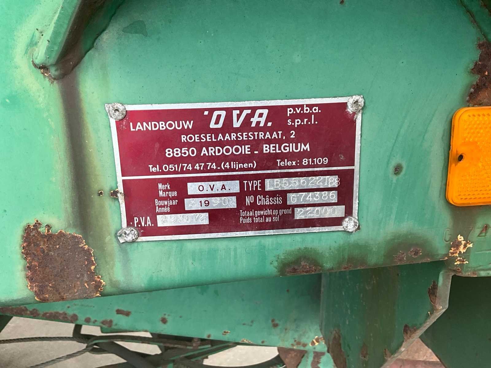 Merk: O.V.A. (Landbouwmachines, Ardooie - België) Type: LB55622188 Bouwjaar: 1990 Chassisnummer: G74386 P.V.A. (Toegelaten aslast): 3500 kg Totaal gewicht op grond (GVW): 22.000 kg Categorie: Overige agrarische machines Machine: Mesttank / giertank op aanhangwagen Aantal assen: 2 Banden: Dubbele luchtbanden achteraan Materiaal tank: Metaal (staal) Slang: Aanzuig- en persslang aanwezig bovenop Voorzien van: Vulopening met groot luik en sluitmechanisme Uitloop: Grote aftapkraan/aflaat onderaan de tank Staat: Gebruikt, zichtbaar roestvorming en gebruikssporen Locatie typeplaatje: Vooraan op chassis Merk: O.V.A Type: LB55622188 Bouwjaar: 1990
