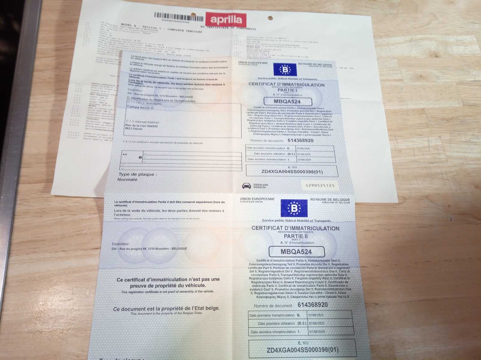 Inschrijvingsbewijs deel 1 en deel 2+ gelijkvormigheidsattest aanwezig Moto heeft val schade Merk: aprilia Model: RS 660 Chassisnummer: ZD4XGA004SS000398 Cilinderinhoud: 660cc Datum eerste toelating: 07/08/2025 Vermogen (kW): 77kW Afgelezen kilometerstand: 2035km Aantal sleutels: 2 Boorddocumenten aanwezig?: true Startinformatie: JA Bouwjaar: 2025