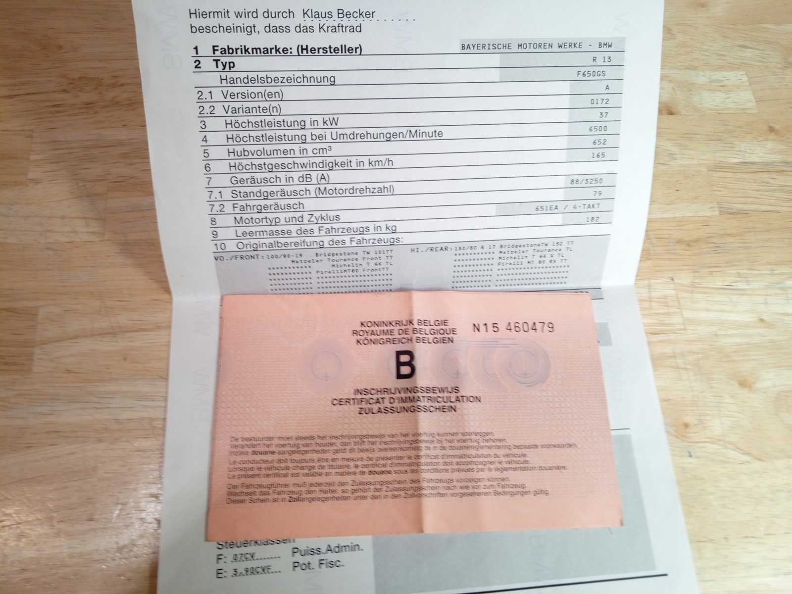Inschrijvingsbewijs aanwezig, + gelijkvormigheidsattest aanwezig . Merk: bmw Model: gs 650 Brandstof: benzine Chassisnummer: WB10172AX2ZH82558 Cilinderinhoud: 650cc Datum eerste toelating: 16/04/2002 Vermogen (kW): 37kW Afgelezen kilometerstand: 33929km Boorddocumenten aanwezig?: true Aantal sleutels: 2 Startinformatie: JA Bouwjaar: 2002