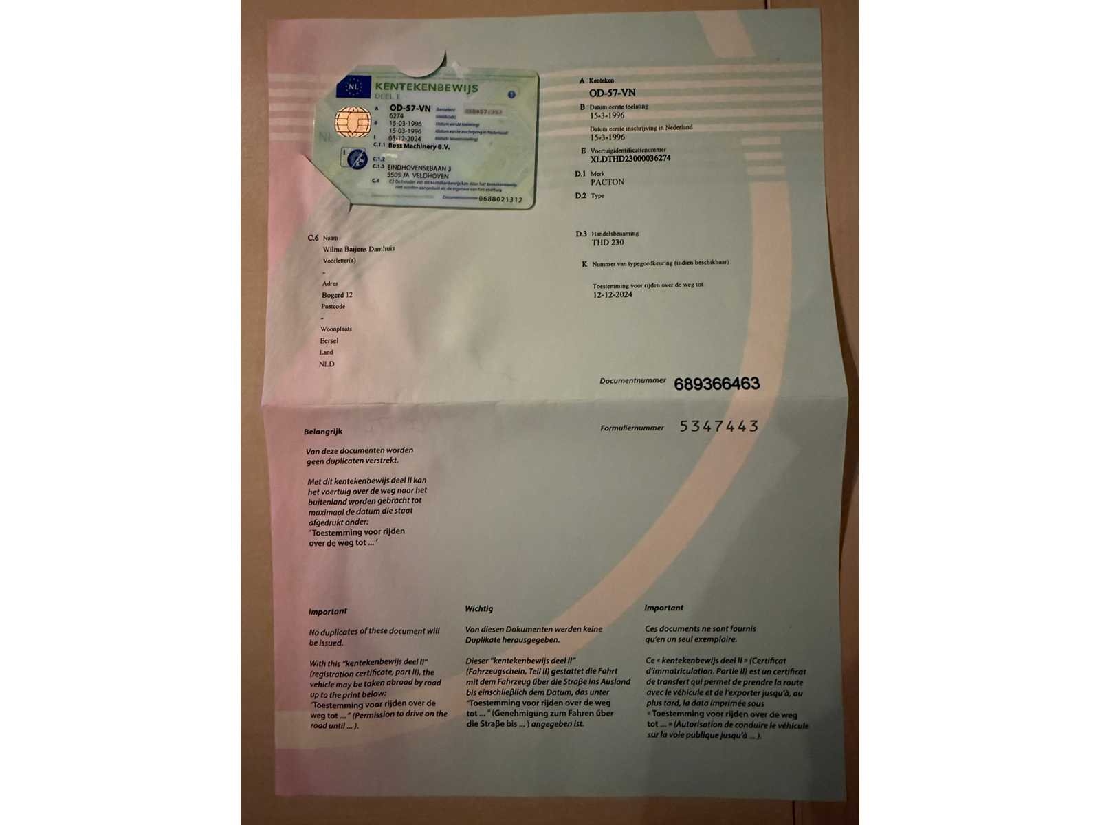 Gesloten pacton trailer Gedwongen stuuras achter D’hollandia laadklep Nieuwe accu’s voor laadklep Werkende verlichting Goed op banden Elektriciteit 230V voorzien binnenin met verlengsnoer 20m Luchtgeveerd en luchtgeremd Luchtzakken vernieuwd Kentekenbewijs + documentatie Merk: Pacton Type: THD.230 Model: Gesloten trailer Bouwjaar: 1996 Chassisnummer: XLDTHD23000036274 Aantal assen: 2 Laadbak afmeting l: 1360cm Laadbak afmeting b: 248cm Ledig gewicht: 8880kg Laadvermogen: 21120kg Gesloten opbouw: true Datum eerste toelating: 15-3-1996 Datum eerste toelating (NL): 15-3-1996 Kenteken: OD-57-VN Kentekenpapieren compleet?: true Hoogte: 400cm Lengte: 1360cm Breedte: 255cm Nationaliteit documenten: Nederland GS Code: 6274 No self drive export!: true