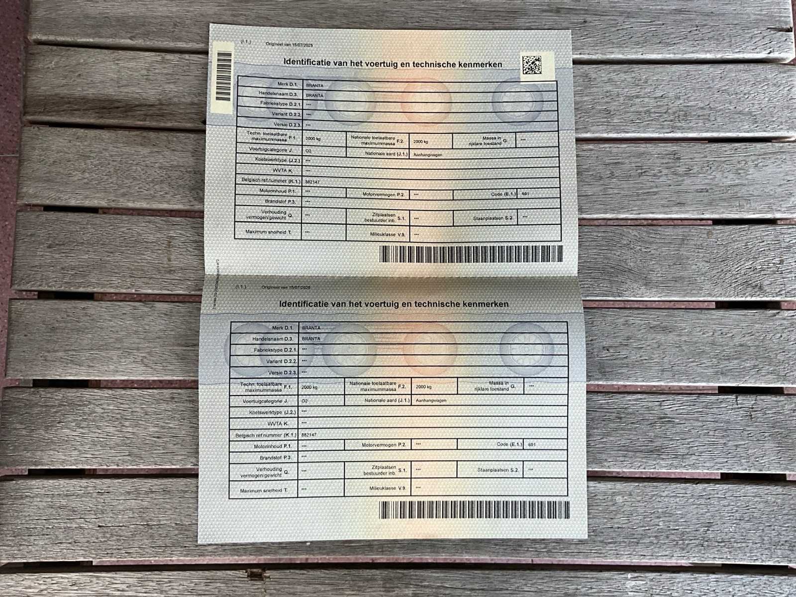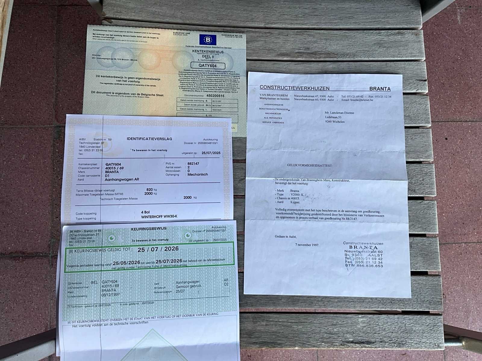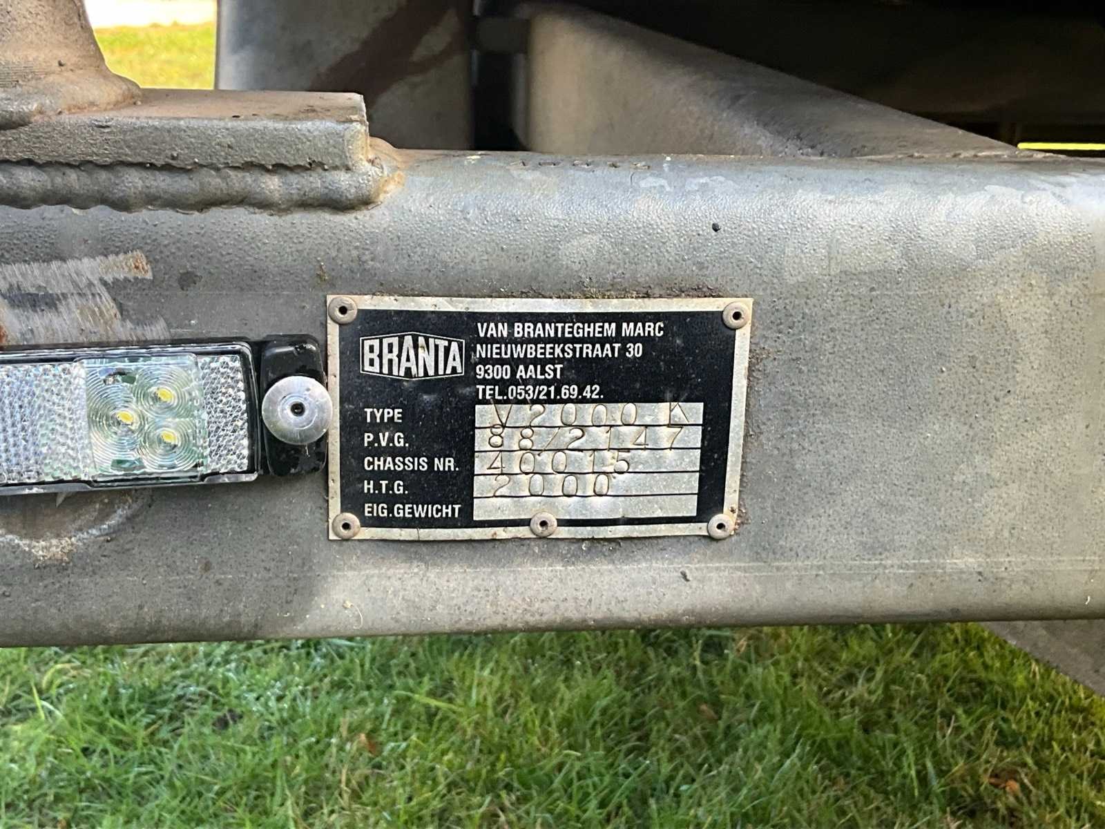 Merk: Branta Type: V2000-K Bouwjaar: 1997 Chassisnummer: 40015 Aantal assen: 2 Laadvermogen: 1180kg Datum eerste toelating: 08/12/1997 Nationaliteit documenten: België
