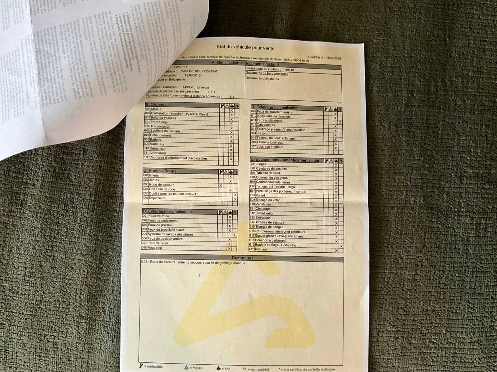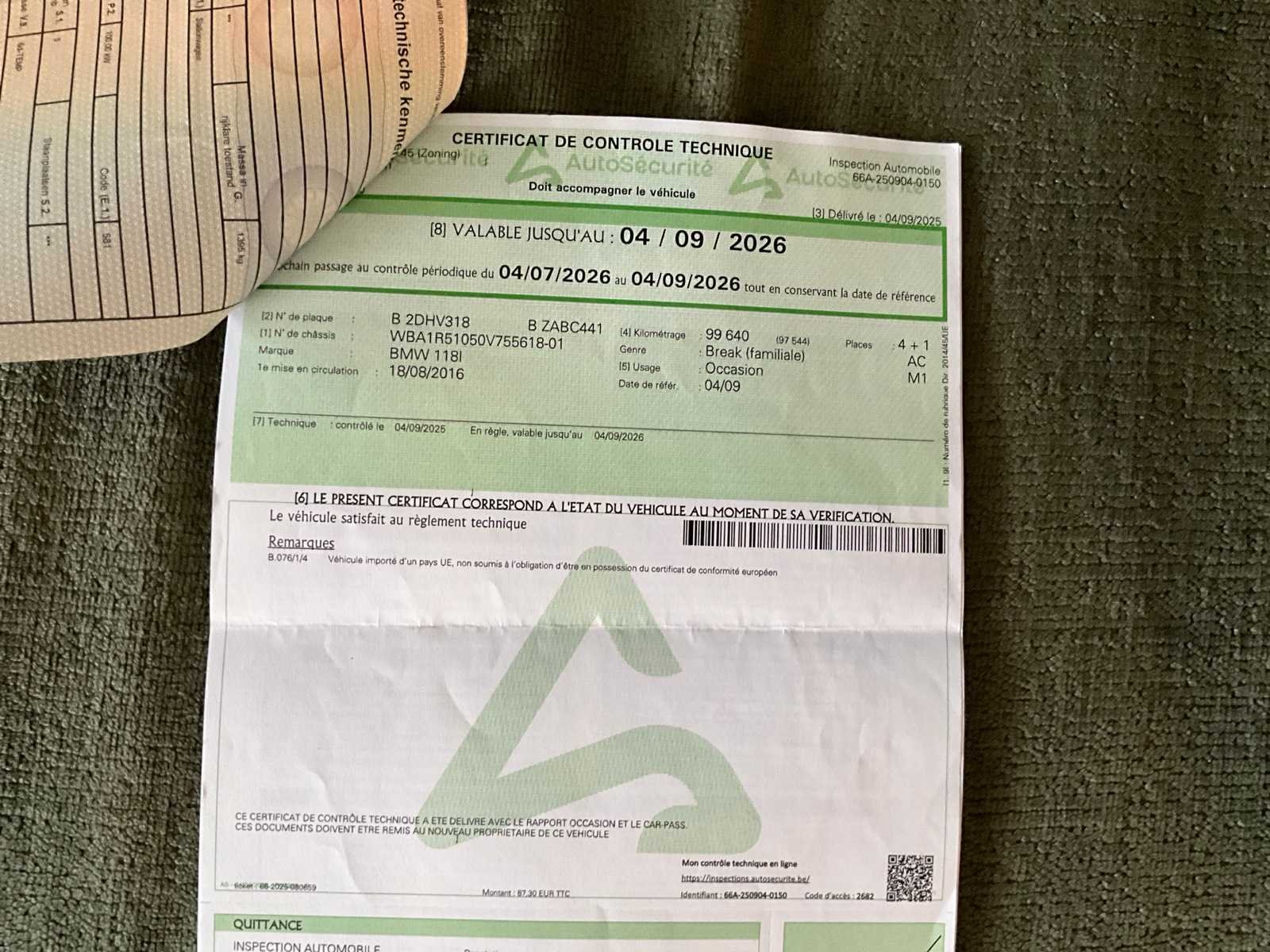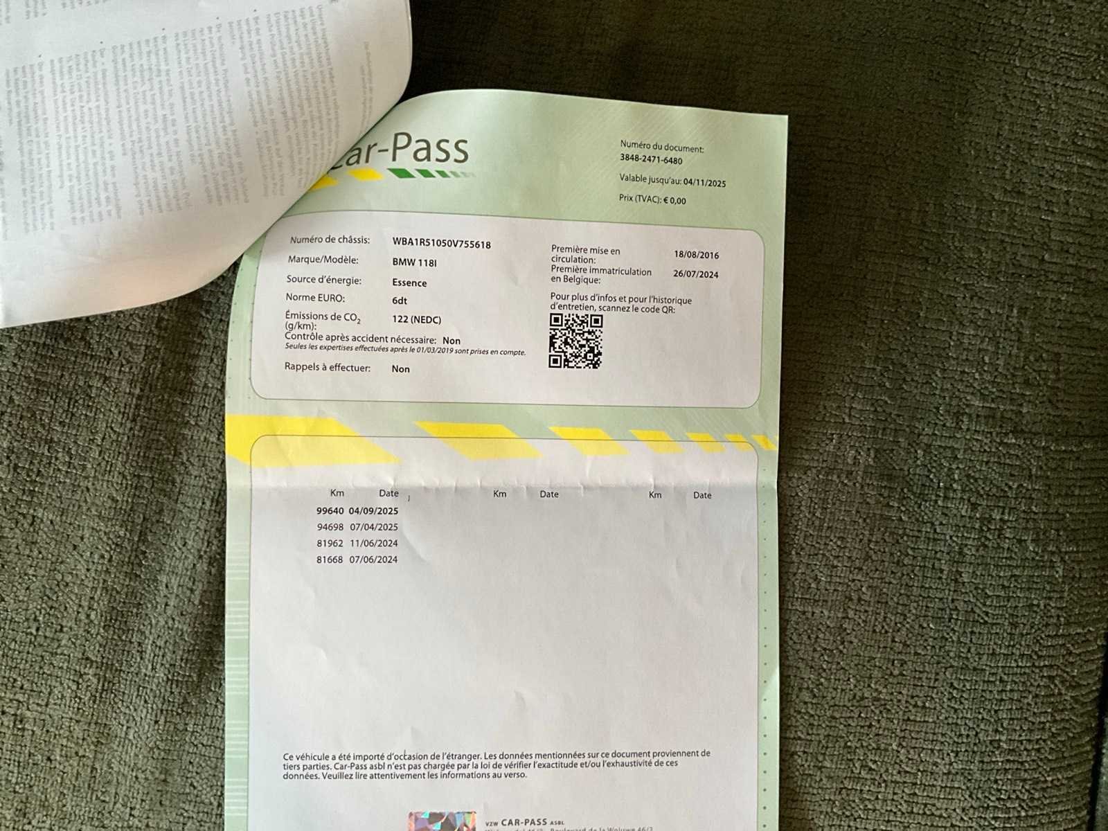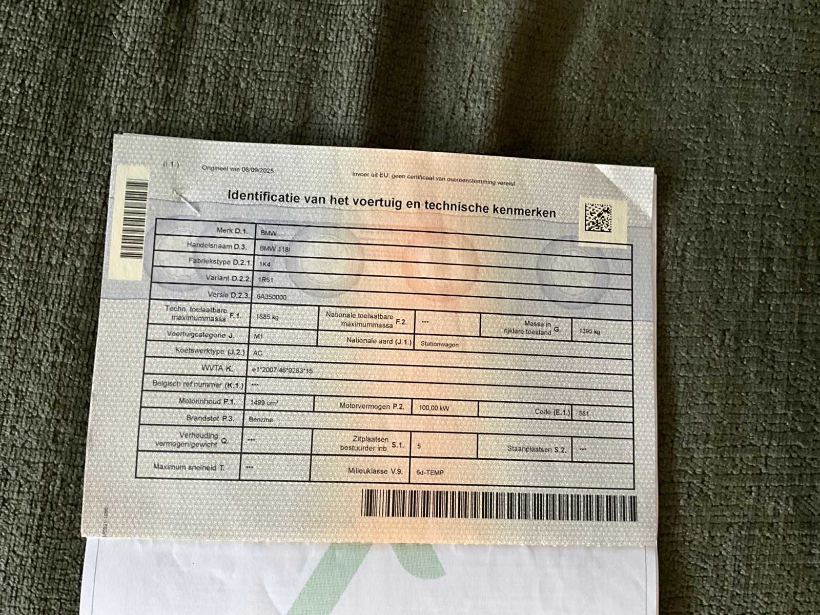 Merk: BMW Model: 118I Bouwjaar: 2016 Afgelezen kilometerstand: 106410km Cilinderinhoud: 1499cc Vermogen (kW): 100kW Brandstof: CNG Chassisnummer: WBA1R51050V755618 Datum eerste toelating: 18/08/2016 Aantal zitplaatsen: 5 Transmissie: Automaat Emissieklasse: Euro 6d Aantal deuren: 5 Nationaliteit documenten: Belgisch Start en rijdt: Ja Keuringsrapport geldig tot: 04/09/2026 startinformatie : Start & rijdt Vavato voert geen technische keuring uit.: true Airconditioning: true Inschrijvingsbewijs - deel 1 : Aanwezig Inschrijvingsbewijs - deel 2: Aanwezig