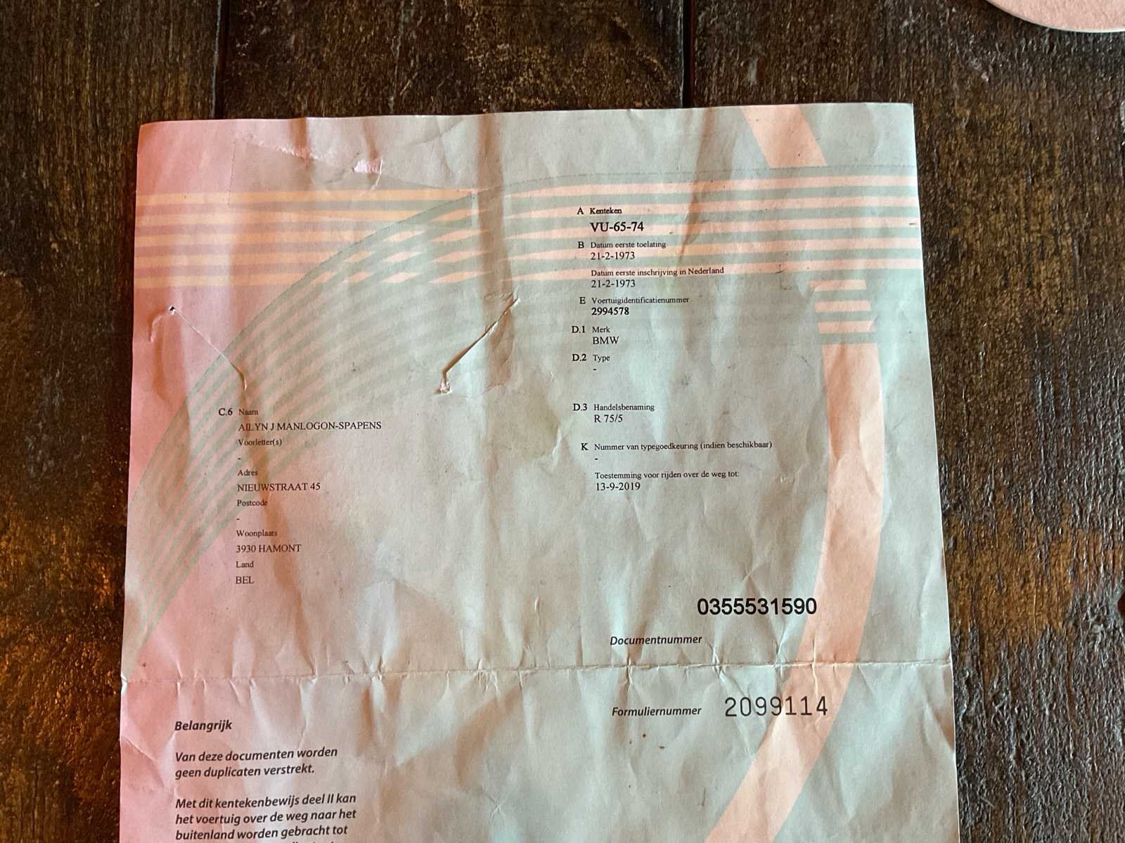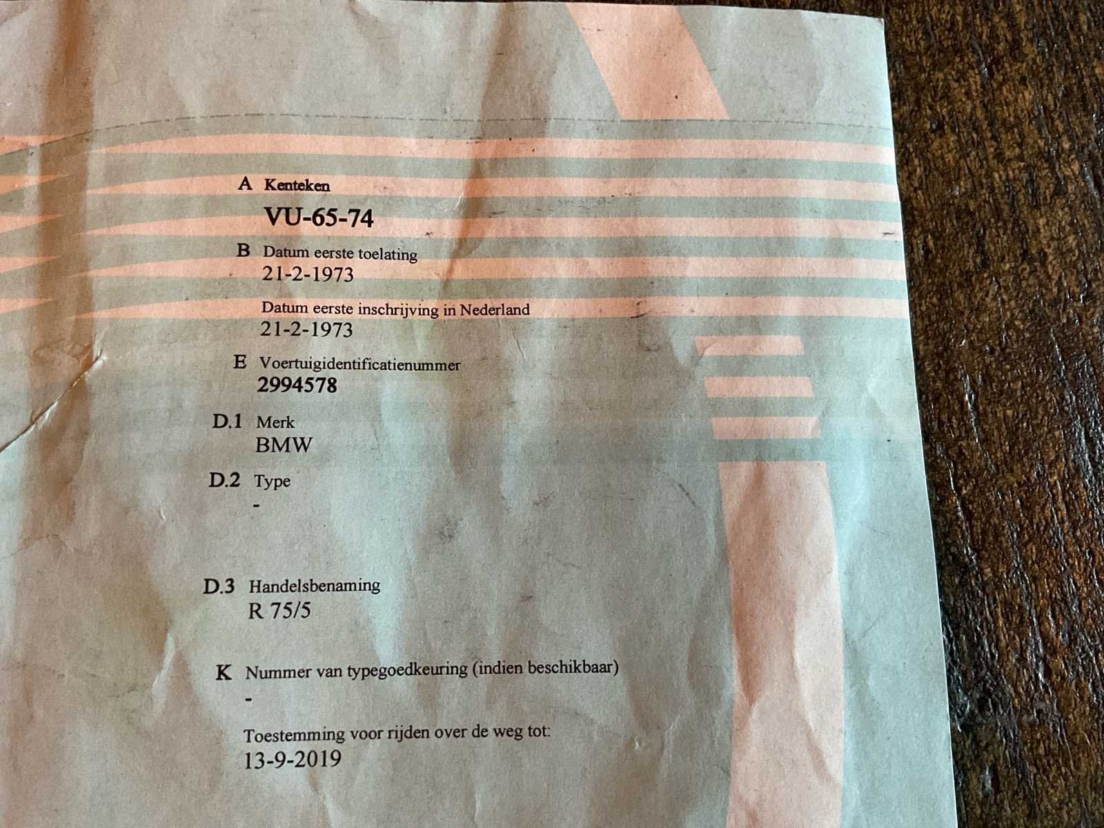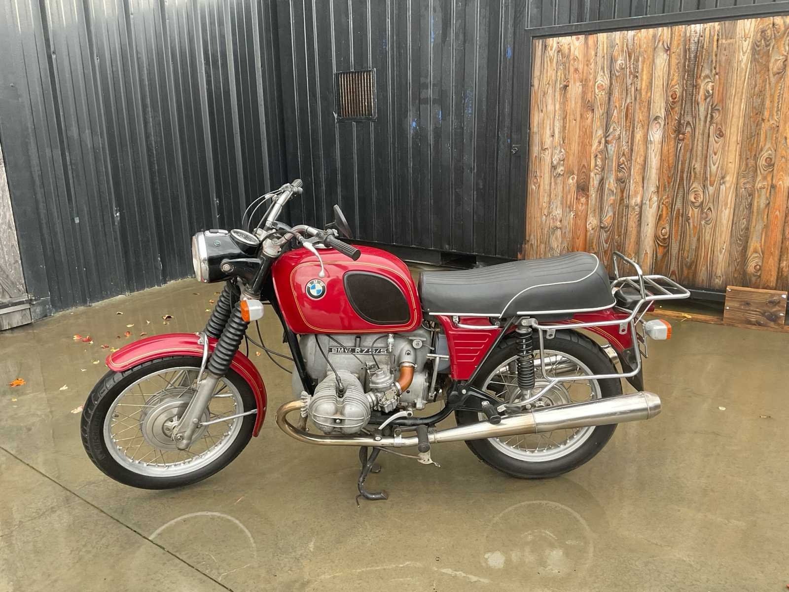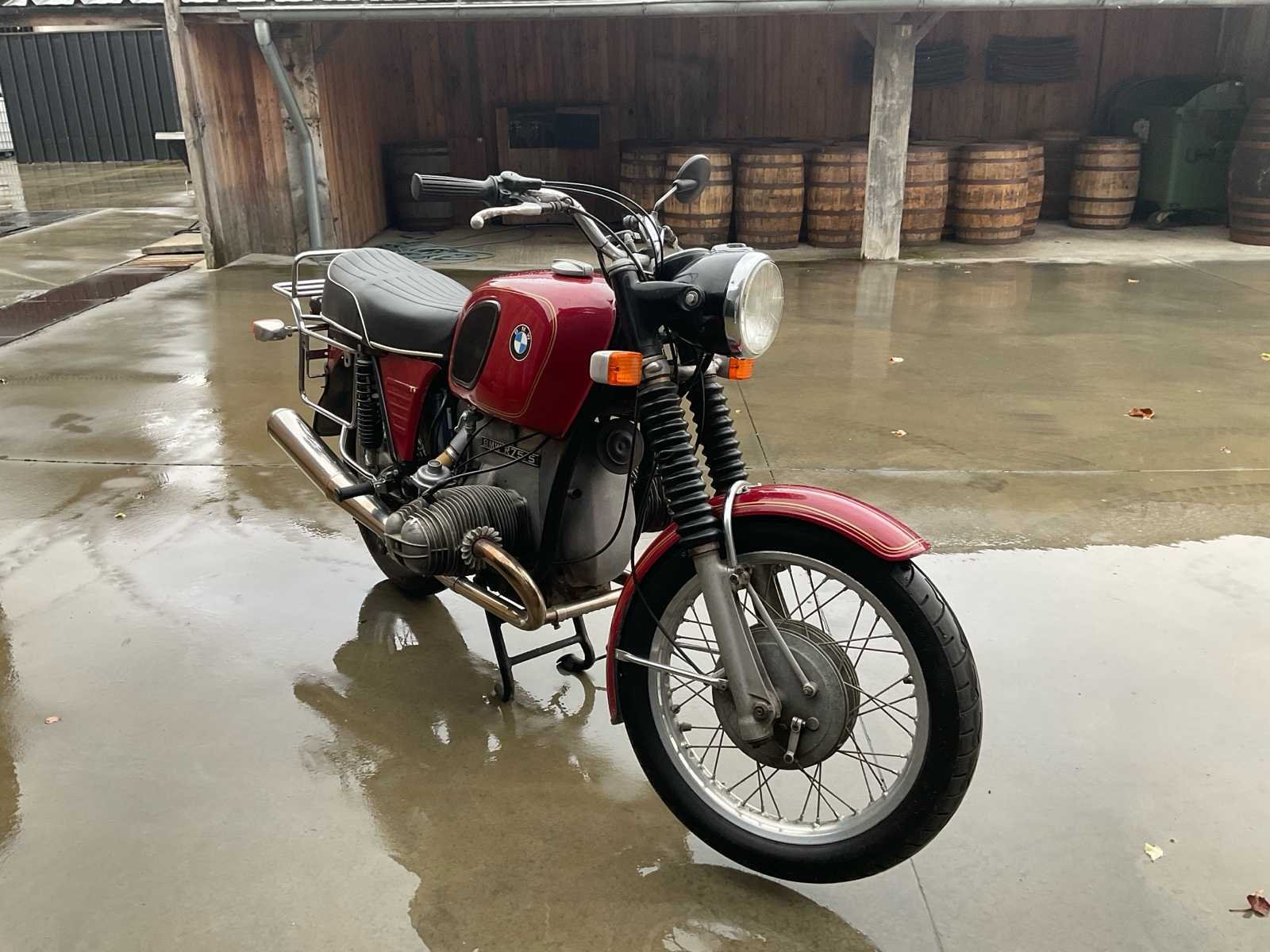 BMW R75/5 . Start en rijdt zoals het hoort . Chassisnummer en motornummer komen overeen (matching numbers) Naald van toerenteller zit los dus zit los in de behuizing. Banden in goede staat. Deel 2 van Nederlands inschrijvingsbewijs aanwezig Merk: BMW Model: R75/5 Brandstof: Benzine Chassisnummer: 2994578 Cilinderinhoud: 745cc Gewicht: 215kg Vermogen (kW): 37kW Afgelezen kilometerstand: 75094km Transmissie: Manueel Datum eerste toelating (NL): 21/02/1973 Nationaliteit documenten: Nederland Aantal sleutels: 1 Startinformatie: Start en rijdt Bouwjaar: 1973