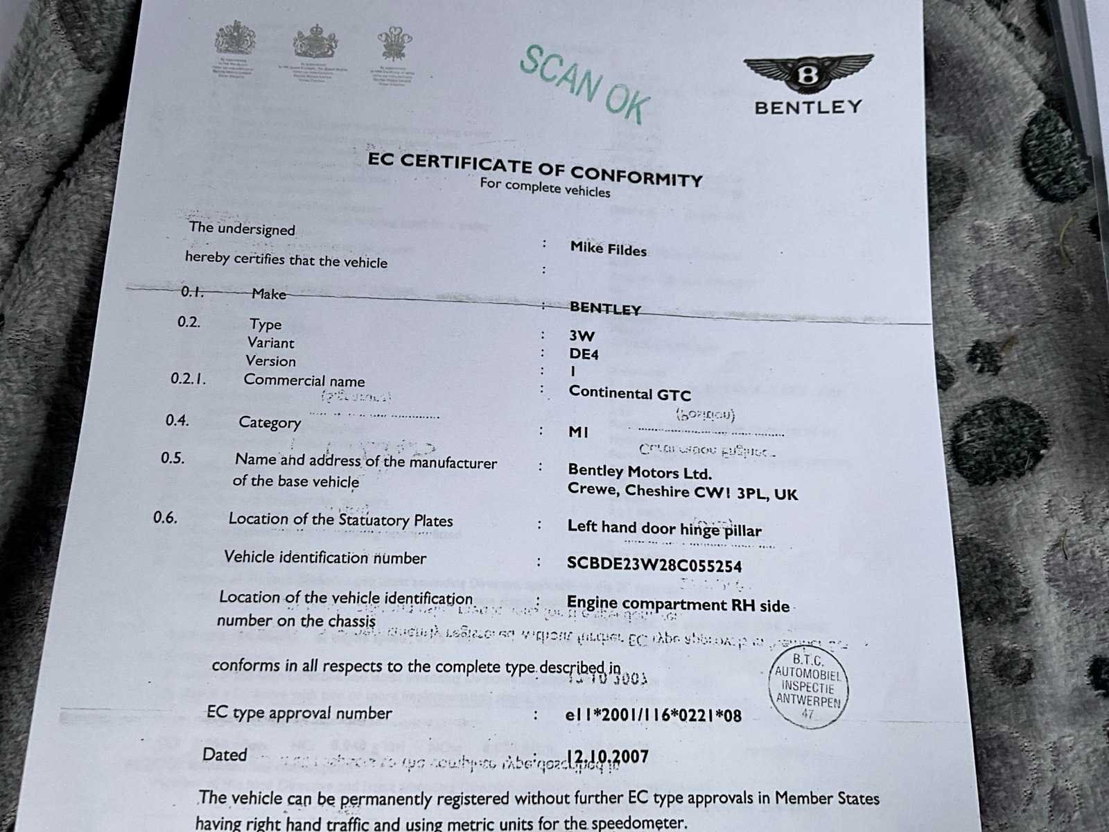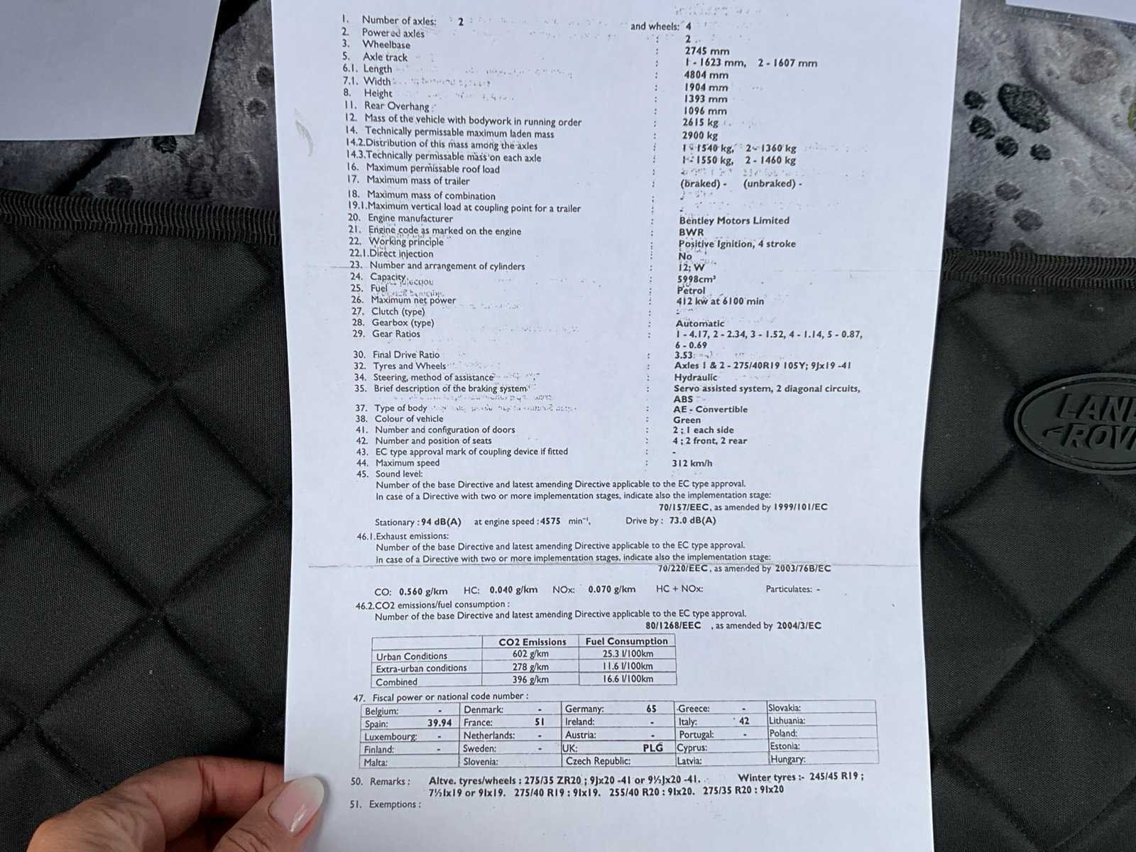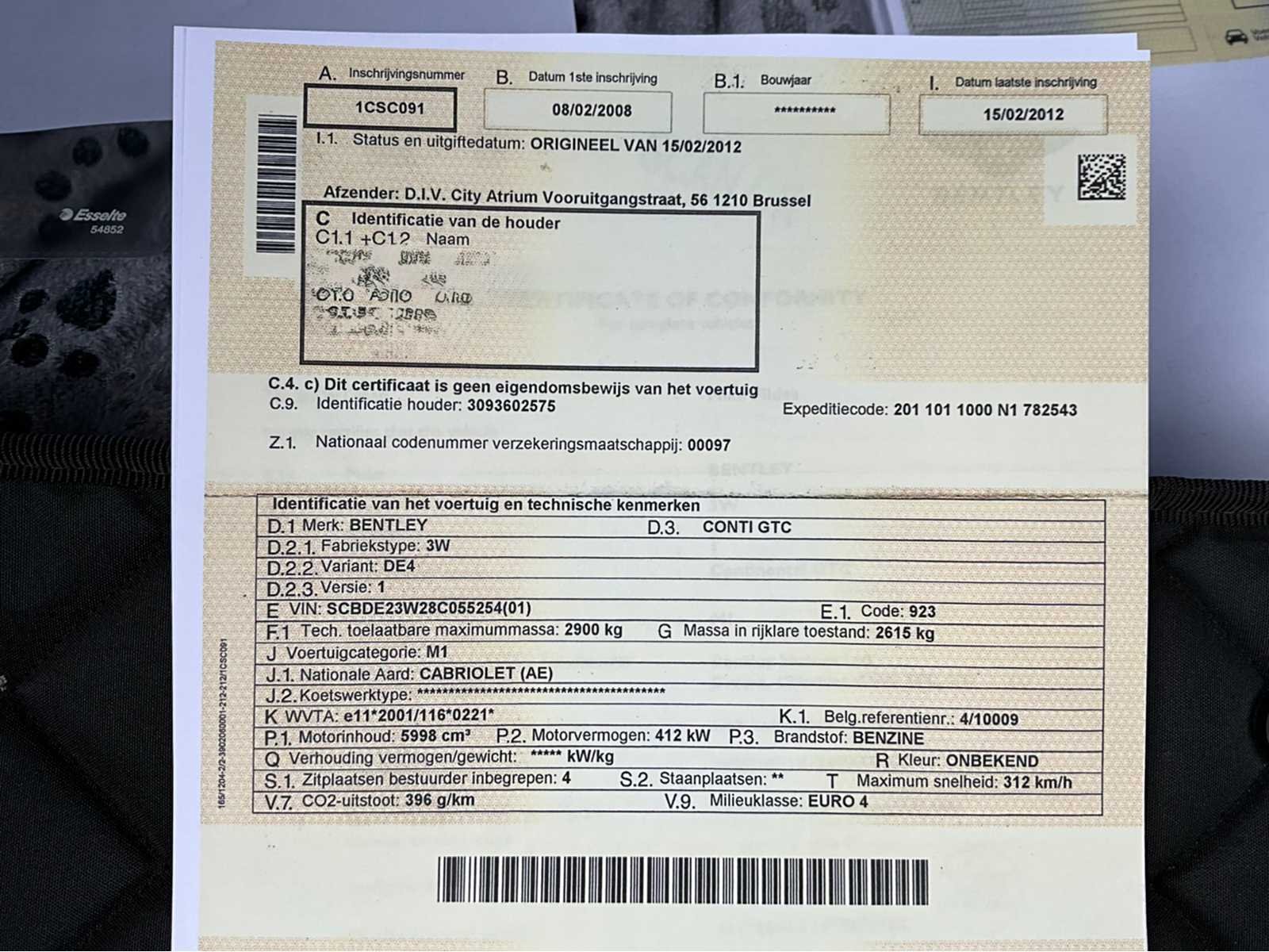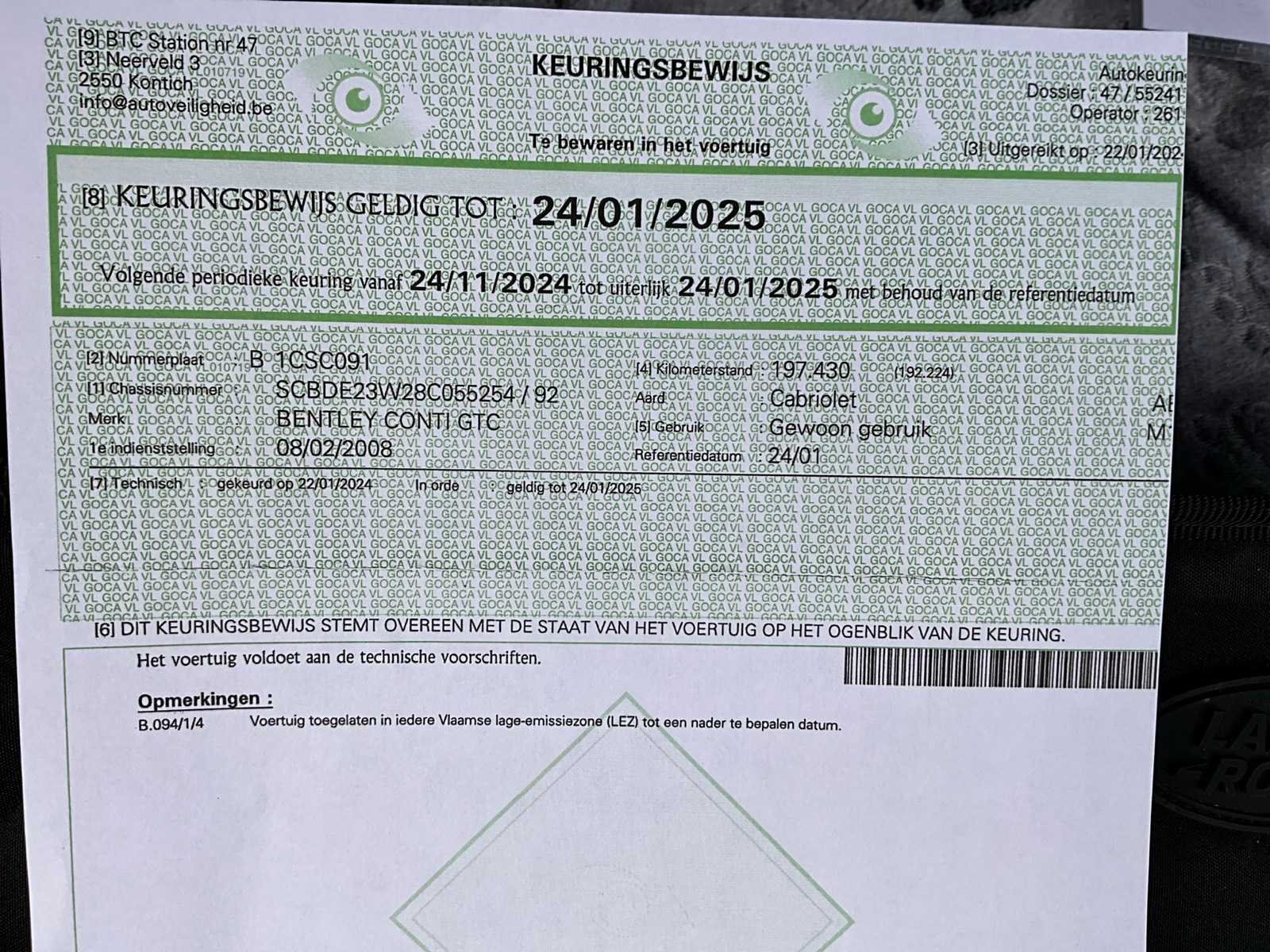 Deze Bentley Continental GTC bevindt zich in zeer nette staat, met een geldige keuring tot 24/01/2025 (op 197430km). De wagen is uitgerust met de krachtige 6.0 W12 twin-turbo motor (412 kW), vierwielaandrijving en automatische transmissie. Het voertuig start en rijdt zoals het hoort. De auto is steeds binnen gestald geweest en dit is duidelijk zichtbaar aan het interieur en exterieur. Enkele lichte punten van steenslag aan bovenlichten en spiegels (zie foto's), maar verder uitzonderlijk proper voor zijn leeftijd en kilometerstand. Het voertuig wordt geleverd met inschrijvingsbewijs deel 1 & 2, COC-attest, reserveband, druppellader en windscherm. Een zeer complete en correcte GTC in een bijzonder fraaie kleurcombinatie groen / beige leder - elektrisch dak in zeer goede staat Merk: Bentley Model: Continental GTC 6.0 W12 Type: cabrio Bouwjaar: 2007 Afgelezen kilometerstand: 198734km Cilinderinhoud: 5998cc Vermogen (kW): 412kW Brandstof: benzine Chassisnummer: SCBDE23W28C055254 Datum eerste toelating: 8/2/2008 Aantal zitplaatsen: 4 Kleur: groen Transmissie: Automaat Emissieklasse: Euro 4 Aantal deuren: 2 Aantal sleutels: 2 Ledig gewicht: 2615kg Nationaliteit documenten: B Gelijkvormigheidsattest aanwezig: true Start en rijdt: ja Keuringsrapport geldig tot: 24/1/2025 Vavato voert geen technische keuring uit.: true Airconditioning: true Navigatie: true Xenon verlichting: true Leder bekleed: true Vierwielaandrijving 4x4: true Inschrijvingsbewijs - deel 1 : Aanwezig Inschrijvingsbewijs - deel 2: Aanwezig