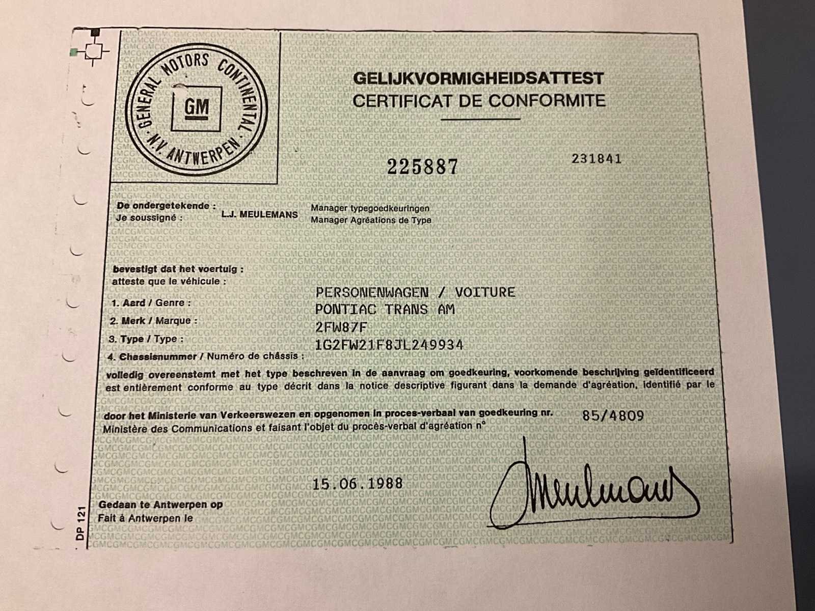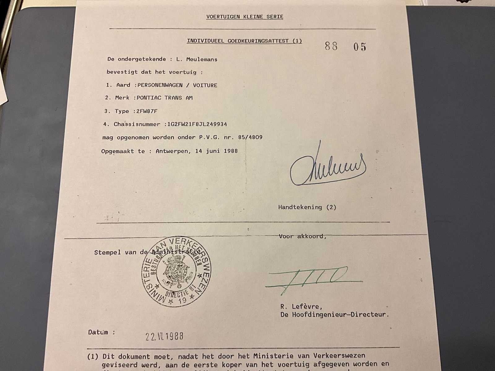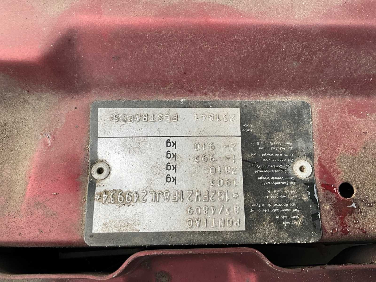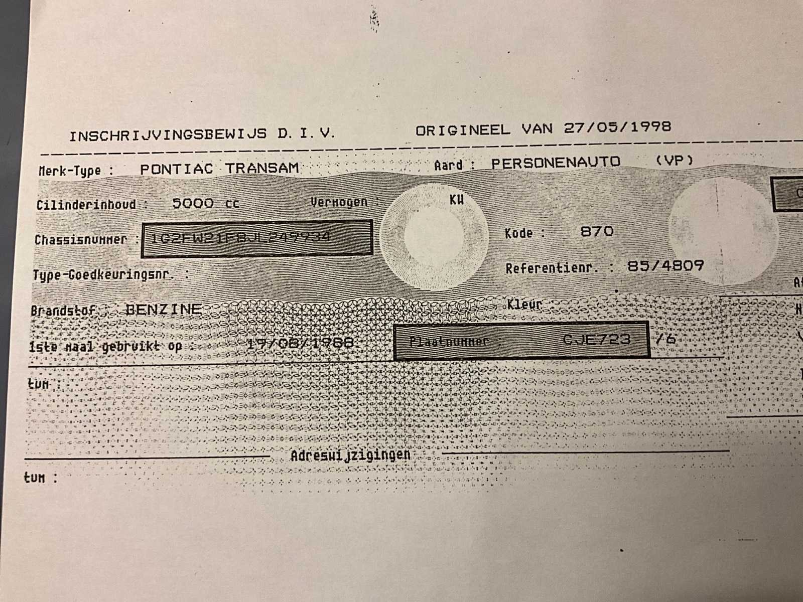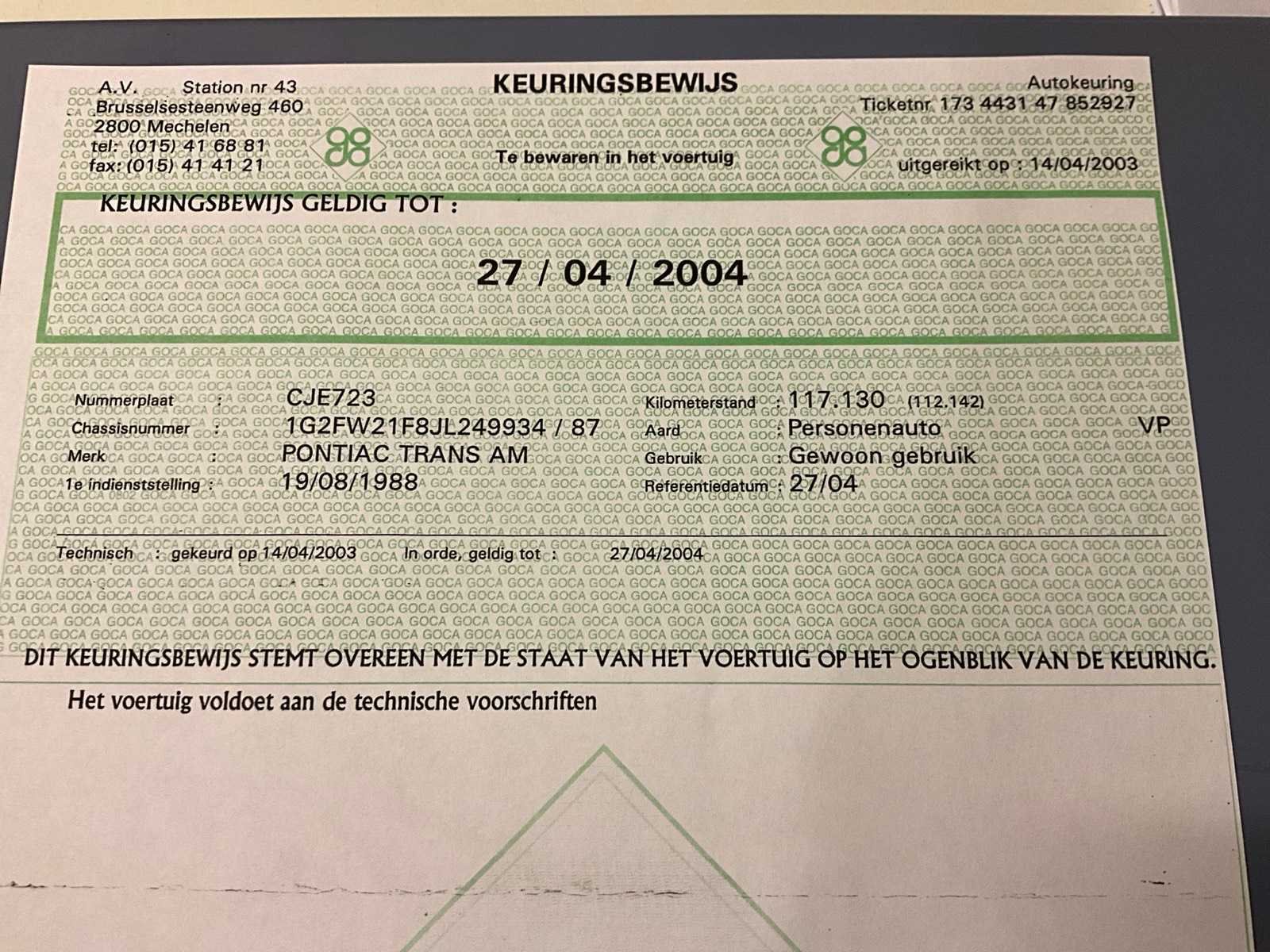 Unieke Pontiac Trans Am GTA uit 1988, uitgerust met de geliefde 5.0 V8 Tuned Port Injection en automatische transmissie. Dit exemplaar werd nieuw ingeschreven op 19/08/1988, en is dus een échte ORIGINELE BELGISCHE WAGEN — geen latere import, wat zeldzaam is voor dit model - De Trans Am GTA is het topmodel binnen de Firebird-lijn en staat bekend om zijn krachtige V8, sportieve look, aerodynamische carrosserie en luxueuze uitrusting. Dit exemplaar heeft bovendien de kenmerkende GTA honeycomb velgen (goudkleurig), die volledig bij de periode horen - Het voertuig stond tot ca. 1 maand geleden altijd binnen gestald. Hij werd niet gestart (ook niet met booster), dus de werking van de motor is onbekend - Lichte gebruikssporen rond carrosserie (zie foto's) - Interieur volledig aanwezig, leder met gebruikssporen passend bij leeftijd - Velgen origineel GTA, banden oud - Laatste keuring gedateerd 27/04/2004 (op 117.130 km) - Gelijkvormigheidsattest en individueel goedkeuringsdocument aanwezig (originele papieren, geen kopieën) Merk: Pontiac Model: Trans Am GTA Bouwjaar: 1988 Afgelezen kilometerstand: 120515km Cilinderinhoud: 5000cc Vermogen (kW): 169kW Brandstof: benzine Chassisnummer: 1G2FW21F8JL249934 Datum eerste toelating: 19/8/1988 Aantal zitplaatsen: 4 Kleur: Flame Red Transmissie: Automaat Aantal deuren: 3 Aantal sleutels: 2 Gelijkvormigheidsattest aanwezig: true Start en rijdt: nee Keuringsrapport geldig tot: 27/4/2004 Zichtbare schade: ja Vavato voert geen technische keuring uit.: true Leder bekleed: true Inschrijvingsbewijs - deel 1 : Aanwezig Inschrijvingsbewijs - deel 2: Aanwezig
