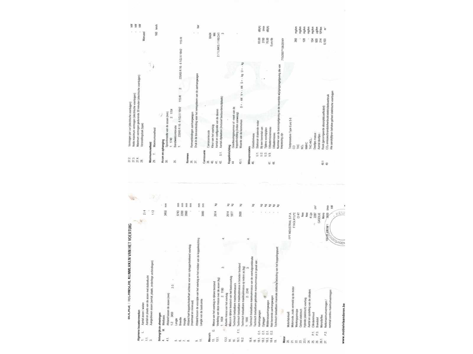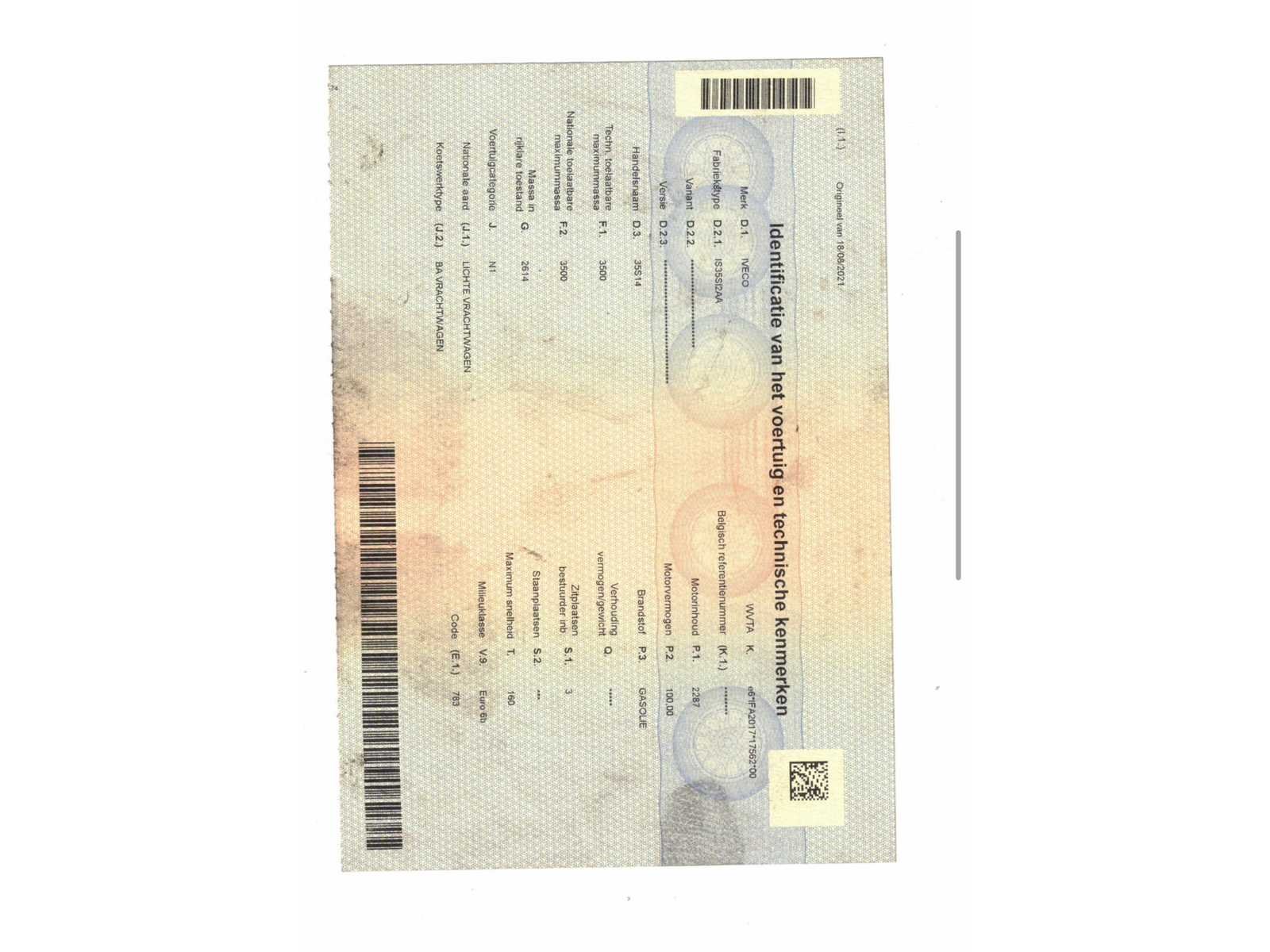 Merk: Iveco Type: 35-140 Bouwjaar: 2017 Chassisnummer VIN: ZCFCC35A30D593586 Cilinderinhoud: 2287cc Datum eerste toelating: 03/01/2017 Type transmissie: Handmatig Aantal assen: 2 Fuel Type: Diesel Laadvermogen: 3500kg Eigen gewicht: 2614kg Totale afmeting L: 5743mm Totale afmeting Breedte: 2200mm Totale afmeting Hoogte: 2990mm Nationaliteit documenten: BE Aantal zitplaatsen: 3