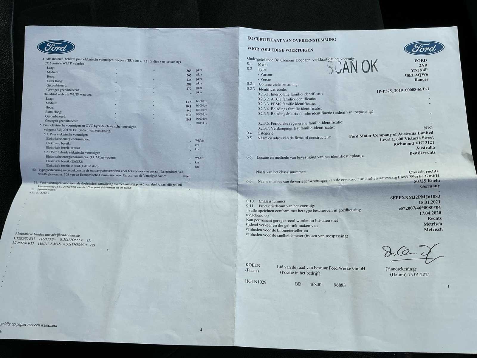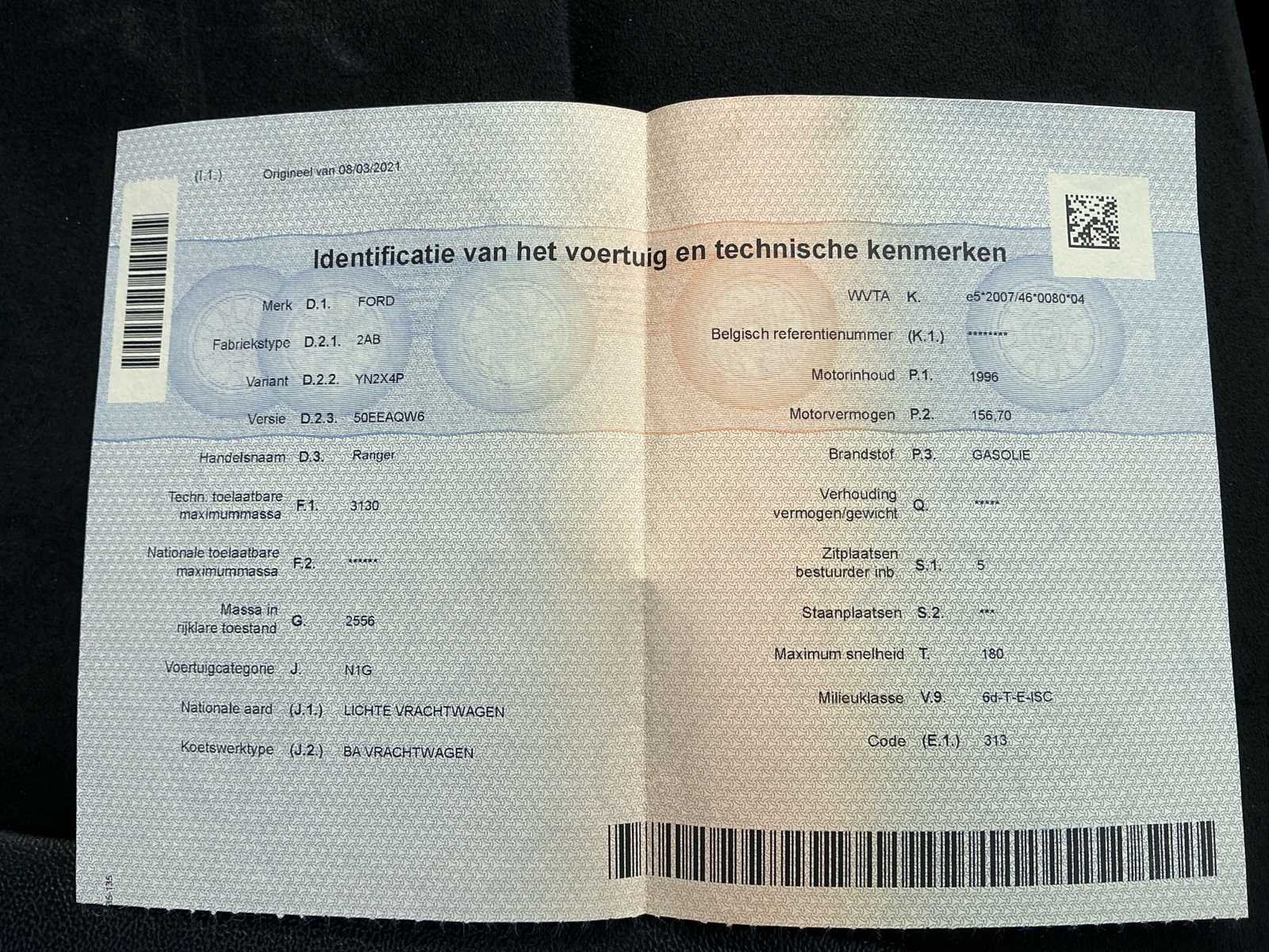 Ford Ranger Raptor uit 2021 met slechts 35640 kilometers op de teller. In volledig werkende staat. Elektrische zetels. Lederen interieur. Automaat. Merk: Ford Model: Ranger Type: Raptor Bouwjaar: 2021 Afgelezen kilometerstand: 35640km Cilinderinhoud: 1996cc Vermogen (kW): 156kW Brandstof: Diesel Chassisnummer: 6FPPXXMJ2PMJ61083 Datum eerste toelating: 08/03/2021 Aantal zitplaatsen: 5 Kleur: Zwart Transmissie: Automaat Emissieklasse: Euro 6d-T-E-ESC Nationaliteit documenten: Belgi¨ë Gelijkvormigheidsattest aanwezig: true Start en rijdt: Ja Vavato voert geen technische keuring uit.: true Airconditioning: true Navigatie: true Leder bekleed: true Vierwielaandrijving 4x4: true Inschrijvingsbewijs - deel 1 : Ja Inschrijvingsbewijs - deel 2: Ja