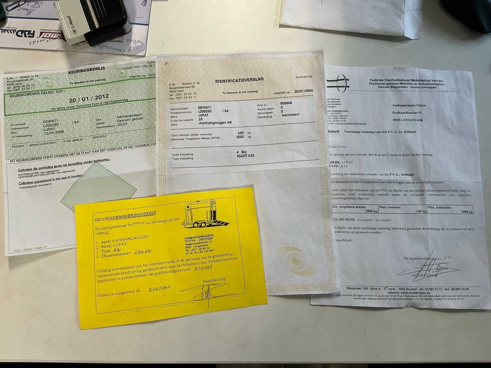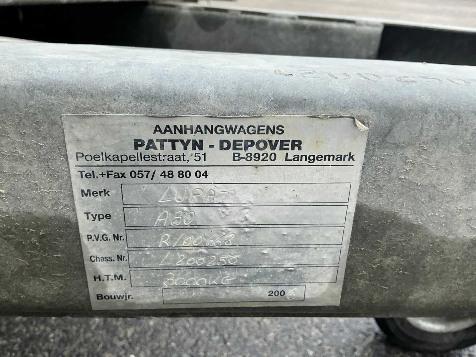 Merk: LUPAT Type: A30 Bouwjaar: 2006 Chassisnummer: L200250 Aantal assen: 2 Laadbak afmeting l: 298cm Laadbak afmeting b: 145cm Nationaliteit documenten: Belgisch