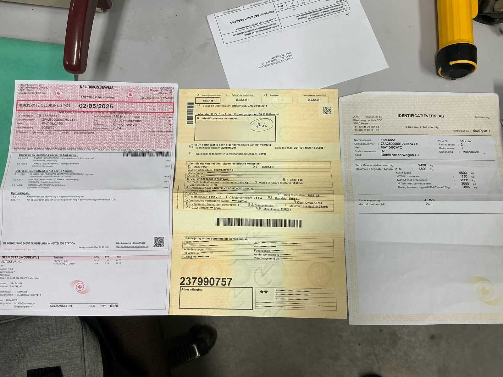 Degelijke Fiat Ducato lichte vrachtwagen van 2011, uitgerust met een 2.2 JTD dieselmotor. De wagen heeft een kilometerstand van 120.859 km en is ingeschreven in categorie N1 – Lichte Vracht. Ideaal voor transport, bouw, leveringen of professioneel gebruik. Gebreken die aanleiding geven tot herkeuring 6.1.1.a/3/2 – CHASSIS: DEURDREMPEL – lichte breuken of is licht vervormd 6.1.1.c/3/2 – CHASSIS: DEURDREMPEL – belangrijke corrosie (Deurdrempel: corrosie Gebreken nauwlettend in het oog te houden 6.1.1.c/2/4 – CHASSIS: ZELFDRAGEND KOETSWERK ONDERZUDE – corrosie 6.2.1.a/2/4 – KOETSWERK – FLANKEN: corrosie 6.2.1.a/5/4 – CHASSIS: MOTORKAP – beschadigd MOTORKAP: beschadigd Merk: Fiat Model: Ducato Bouwjaar: 2011 Chassisnummer: ZFA25000001975274 Afgelezen kilometerstand: 120859km Cilinderinhoud: 2198cc Vermogen (kW): 74kW Brandstof: diesel Datum eerste inschrijving: 30/06/2011 Aandrijving: FWD Transmissie: Handgeschakeld Aantal zitplaatsen: 3 Kleur: Wit Nationaliteit documenten: Belgisch Aantal deuren: 4 Ledig gewicht: 2420kg Laadvermogen: 1080kg Vermogen (pk): 100 Aantal cilinders: 4 Velgmaat: 15 Emissieklasse: Euro 4 Boorddocumenten aanwezig?: true Startinformatie: Starten met booster Maximaal trekgewicht ongeremd: 750 Maximaal trekgewicht geremd: 2000 Self drive export possible : true