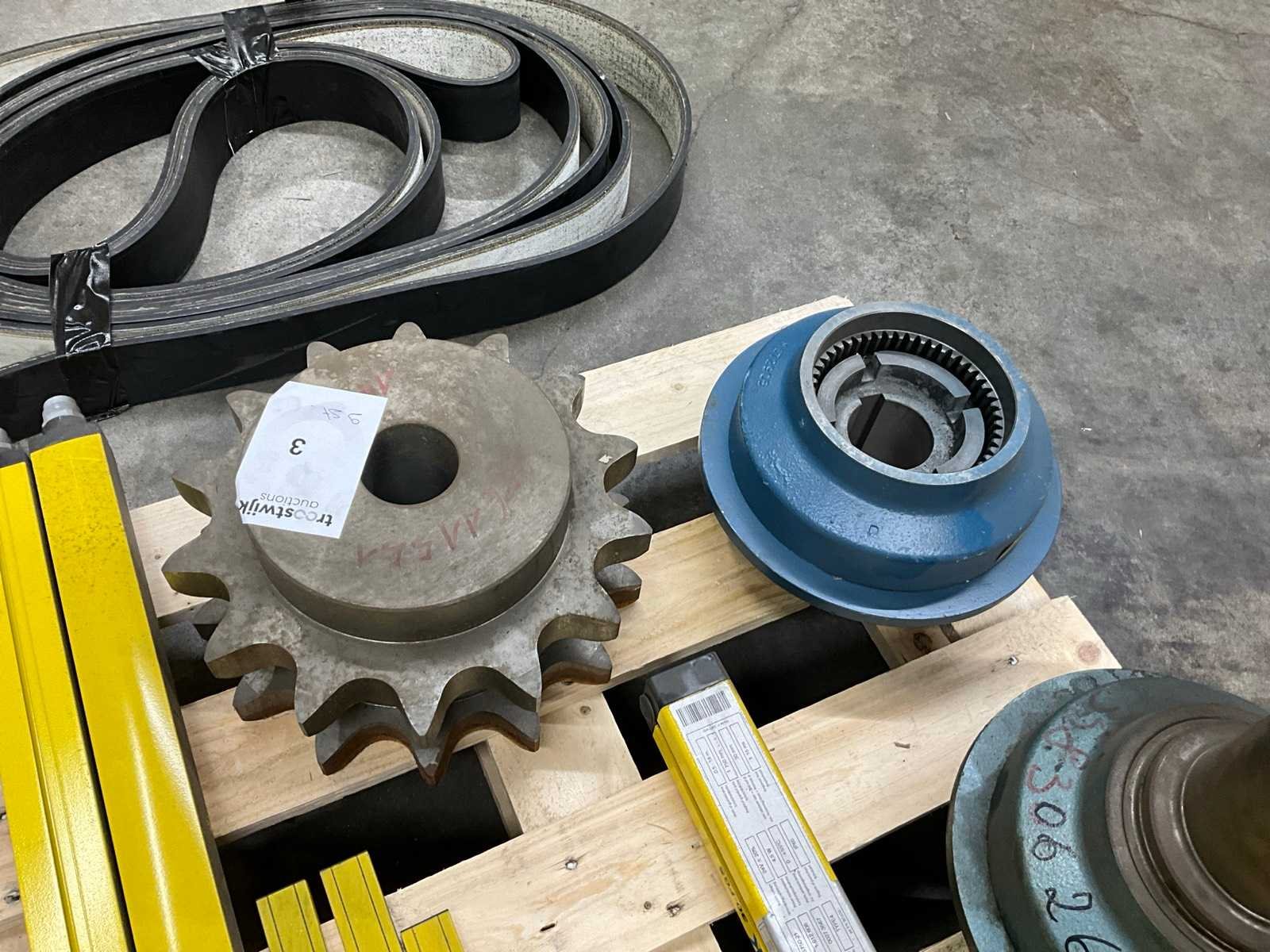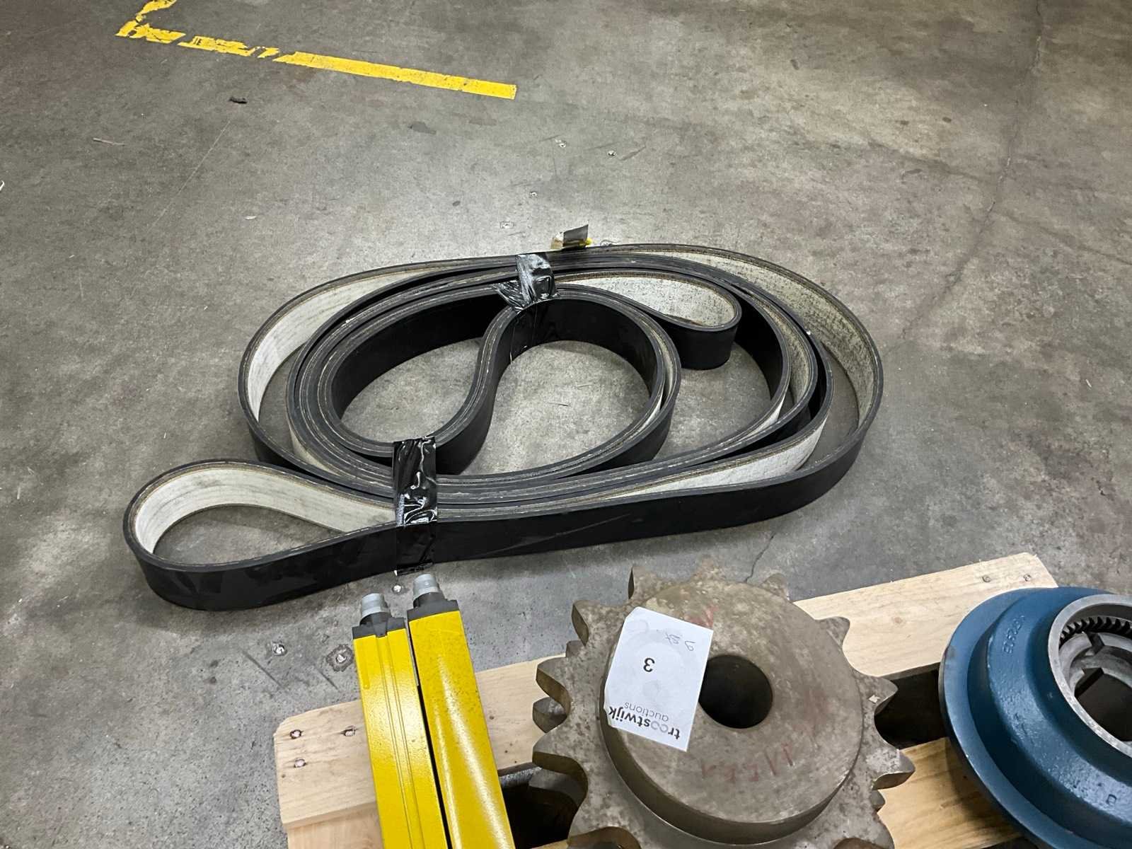 Bestaande uit Fredenhagen platte riem S501-GL-CE-VSK 79x10L=12114, + 4x kussen gelagerde aangedreven assen + 2x meeloop as+ Danfoss remweerstand type 175U0953 + 2x slipkoppeling Sadi type AS75 + M2 D90 1,5 pk, + koppeling Sadi AS75, +1x dubbel ketting tandwiel buiten diameter 310 mm met as gat diameter 60 mm