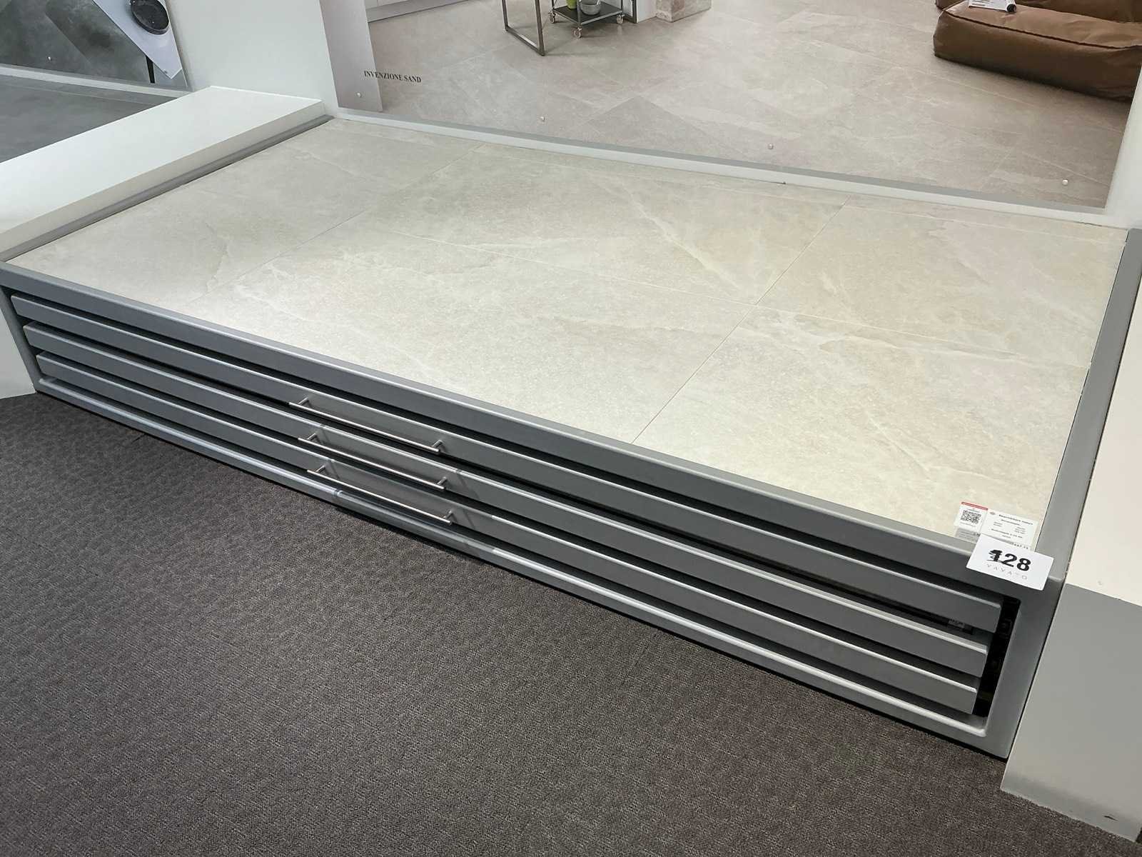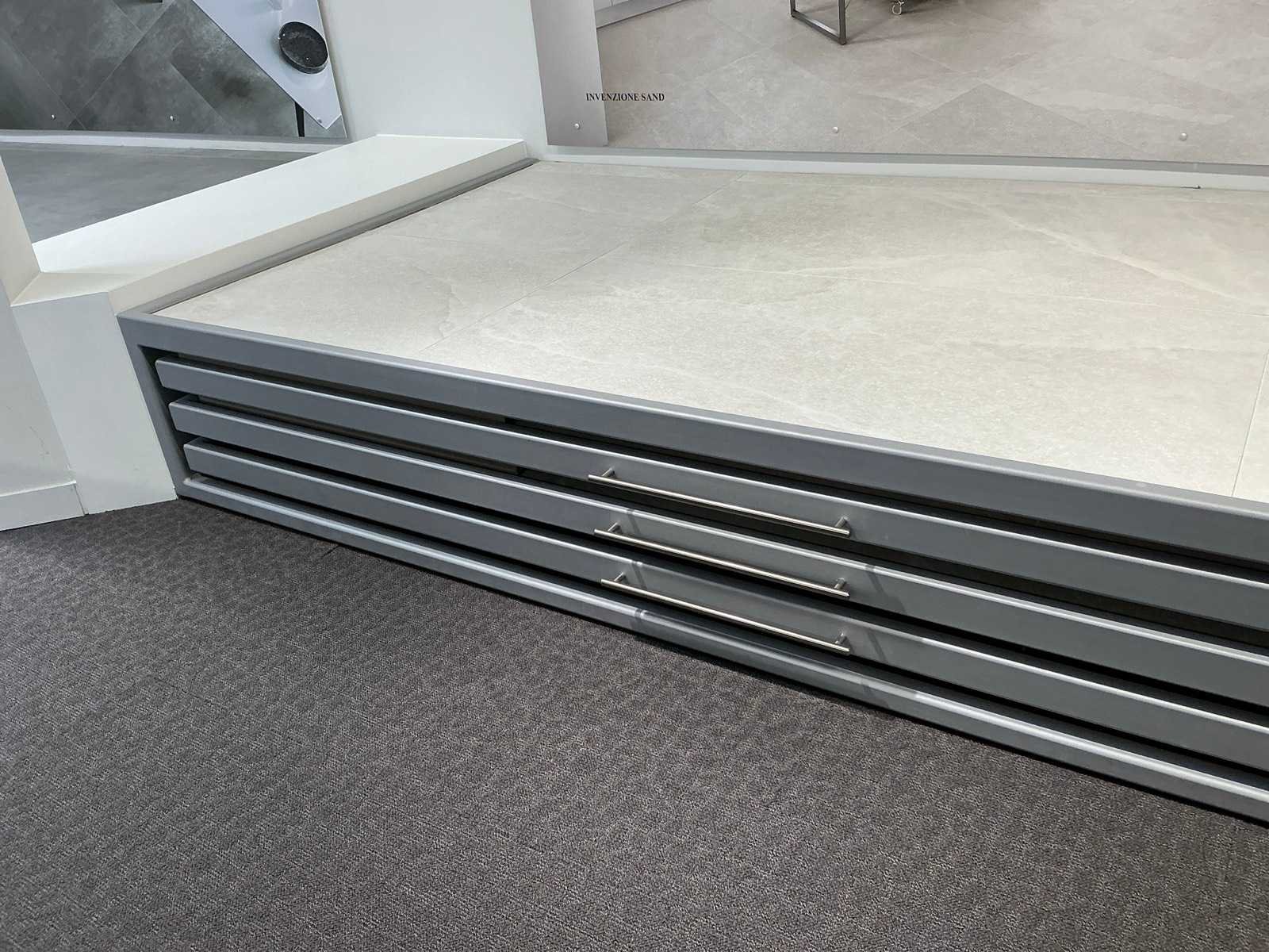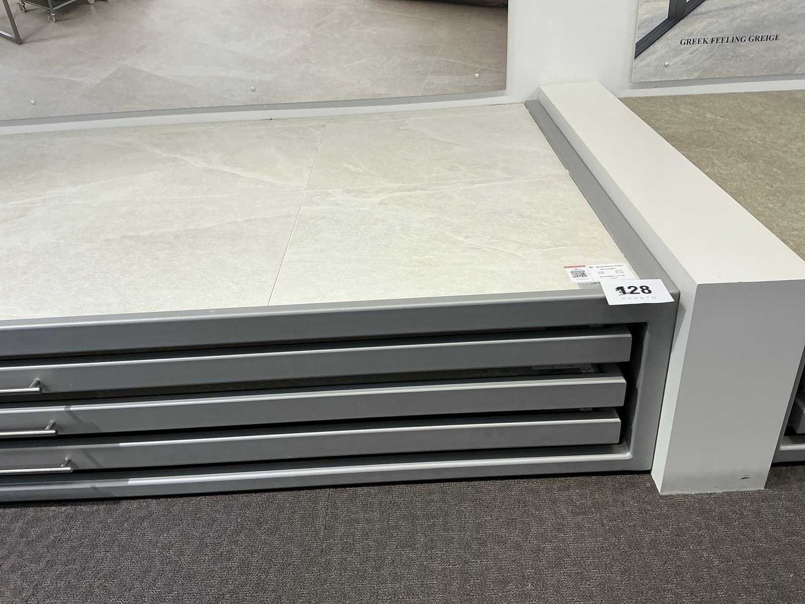 Voorzien van 3x schuif-/presentatieplateau. Te demonteren/verplaatsen van meubel door koper. Alle aangeplakte tegels en toebehoren MOETEN worden meegenomen door koper. Zich bevindend op het 1e verdiep. Merk: REDEC