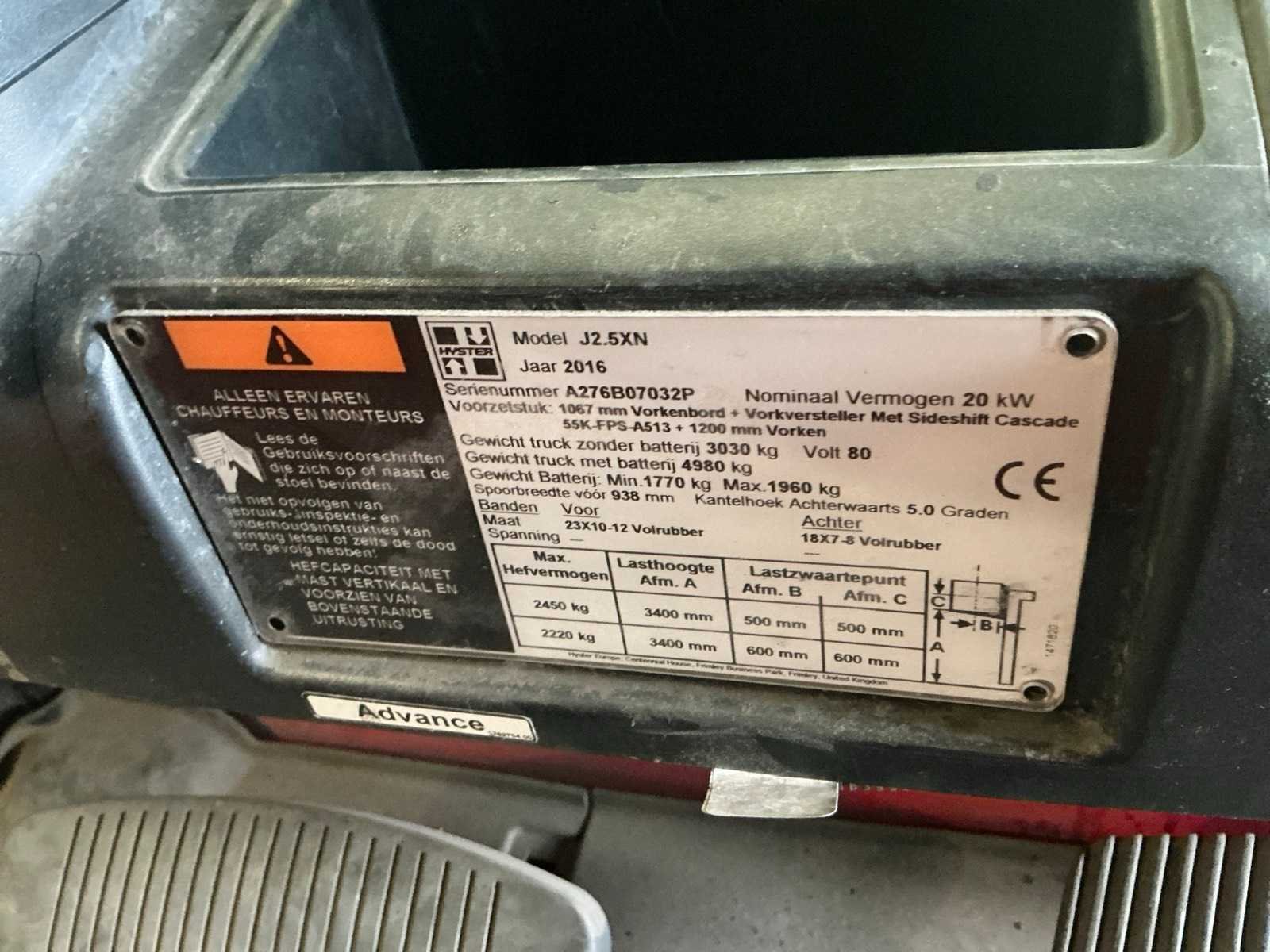 Opstartcode 11111 Merk: Hyster Type: J2.5XN Bouwjaar: 2016 Serienummer: A276B07032P Brandstof: Elektrisch Mast: Duplex Soort band: Volrubber banden Aantal wielen: 4 Afgelezen urenstand: 15694 Accu lader: true Free-lift: true Eigen gewicht: 4980kg Hefvermogen: 2450kg Lepellengte: 1200mm Hefhoogte: 3400mm Minimale doorrijhoogte: 2170mm Totale afmeting L: 2500mm Totale afmeting Breedte: 1200mm Totale afmeting Hoogte: 2170mm