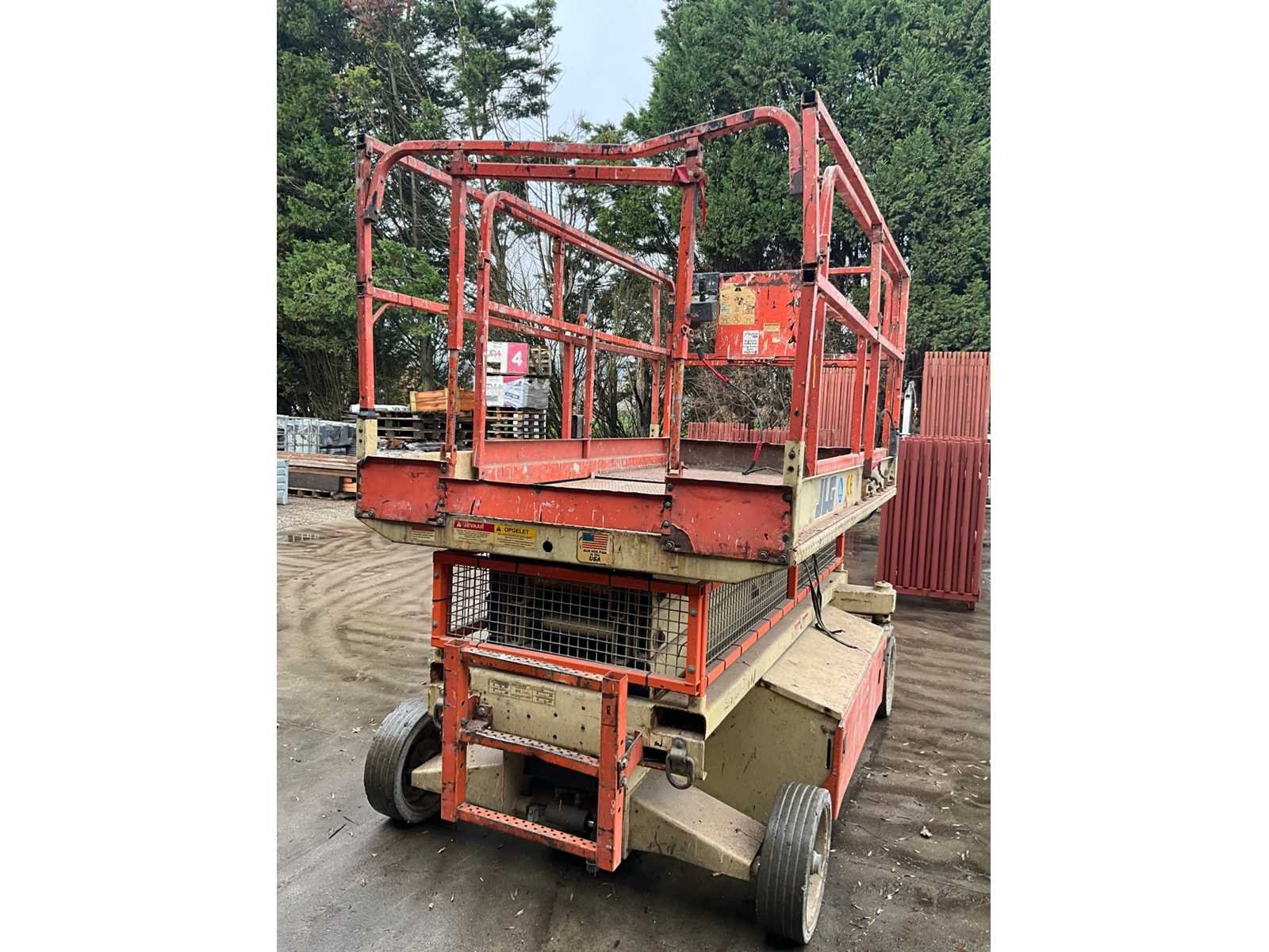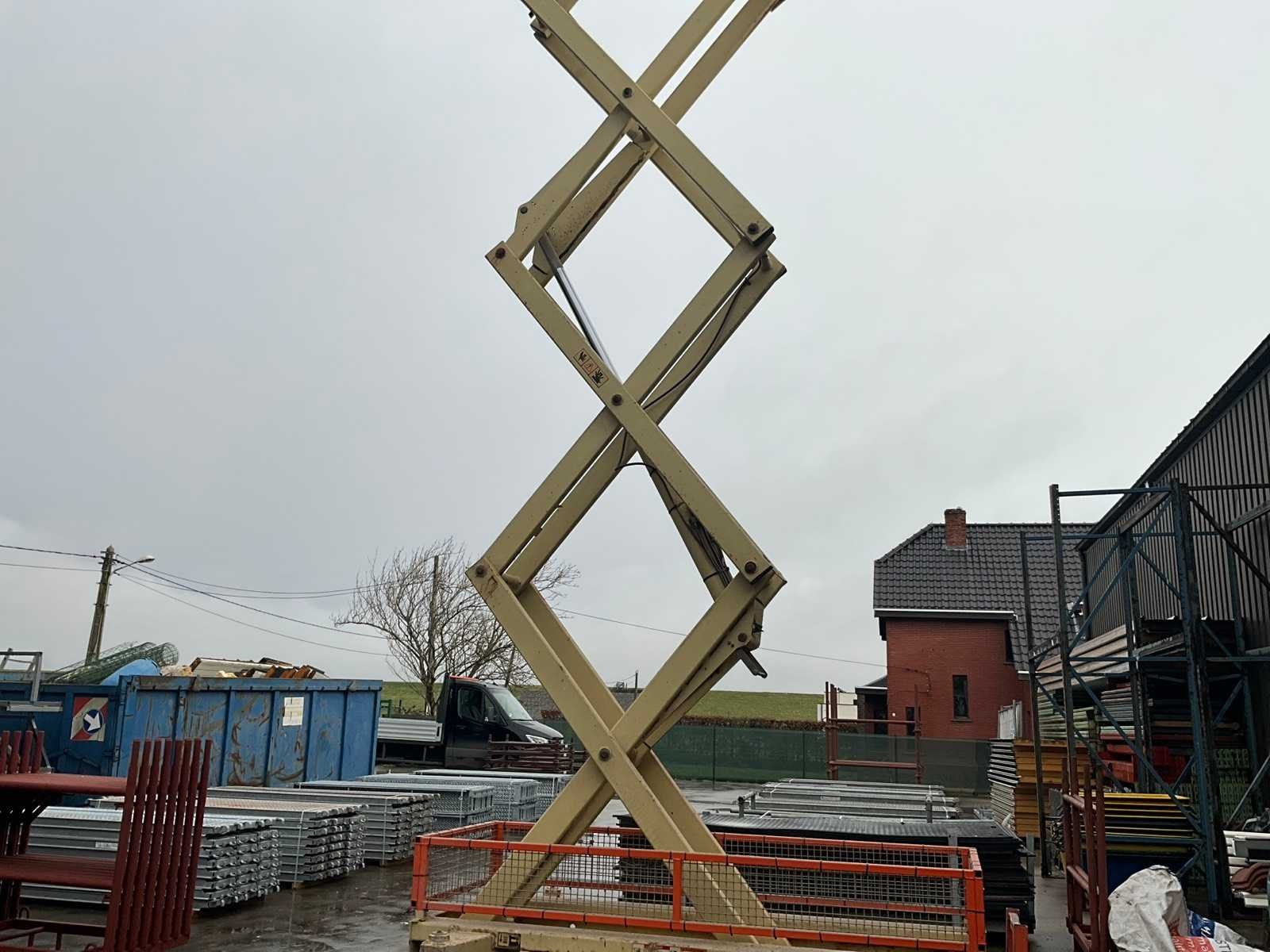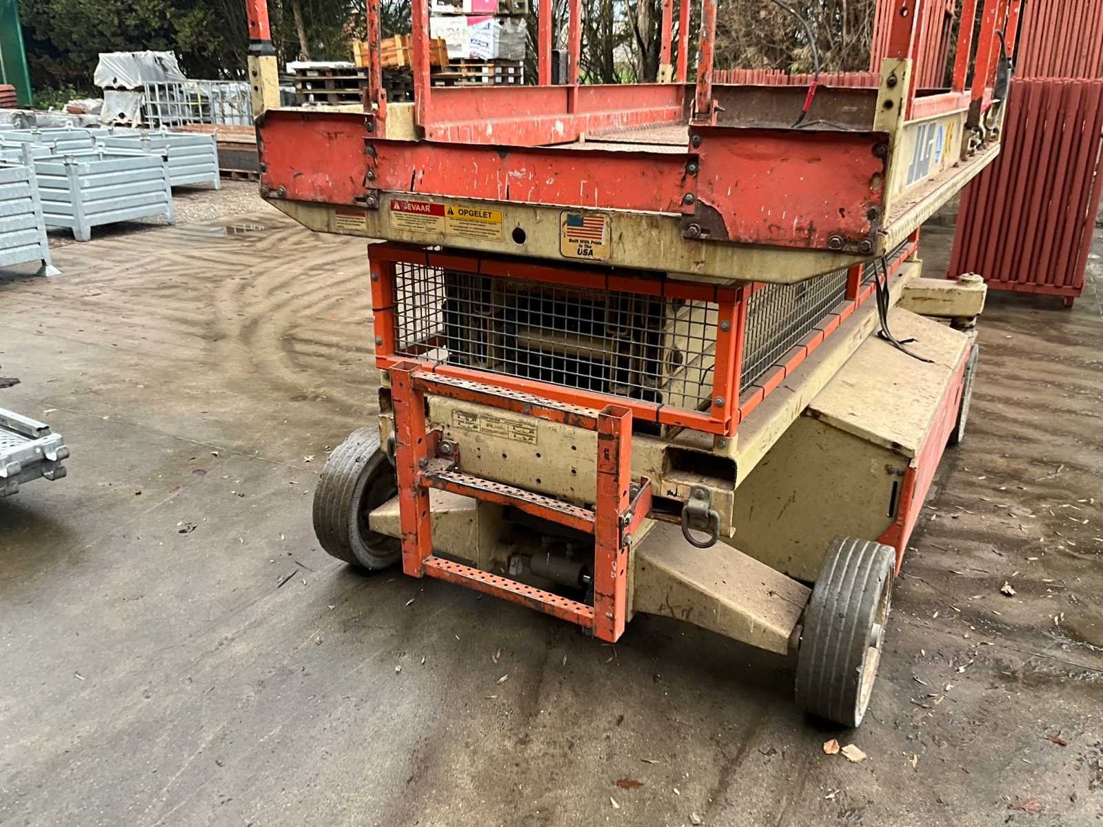 Met minimum lengte 240 cm en uitschuifbaar tot 330 cm. Werkhoogte circa 10 m. Merk: JLG Type: 2658E Max. belasting: 455kg Plateau afm. l: 2400mm Plateau afm. b: 1300mm Hefhoogte: 8m Totale afmeting L: 3300mm